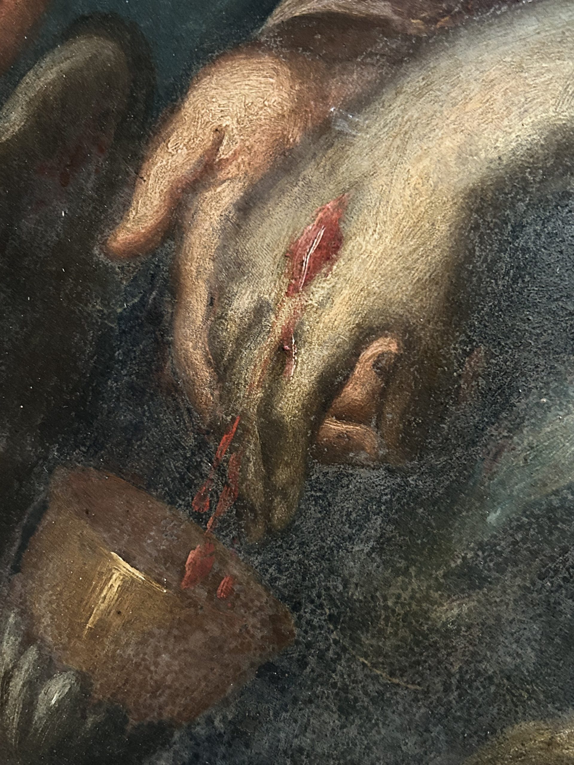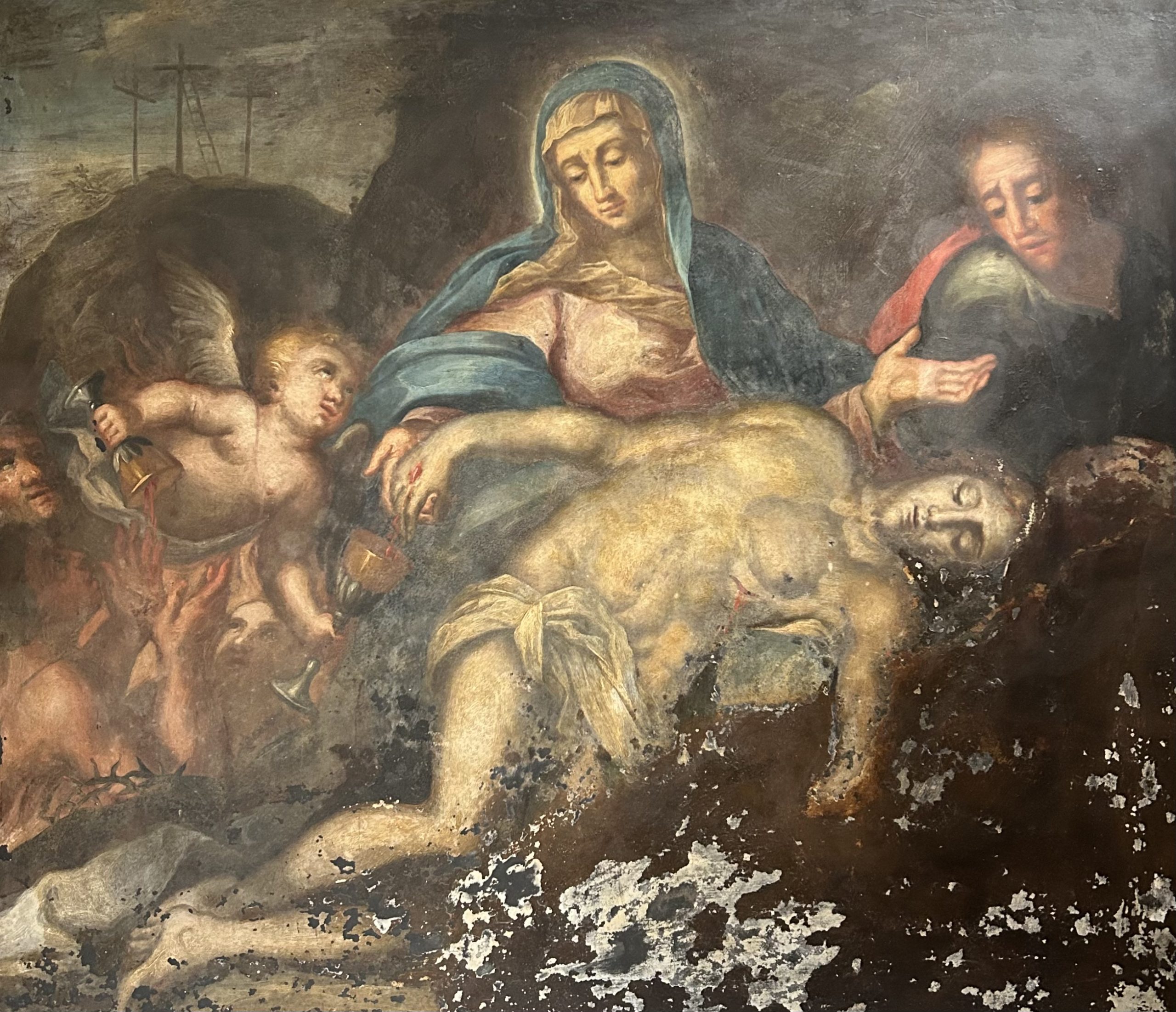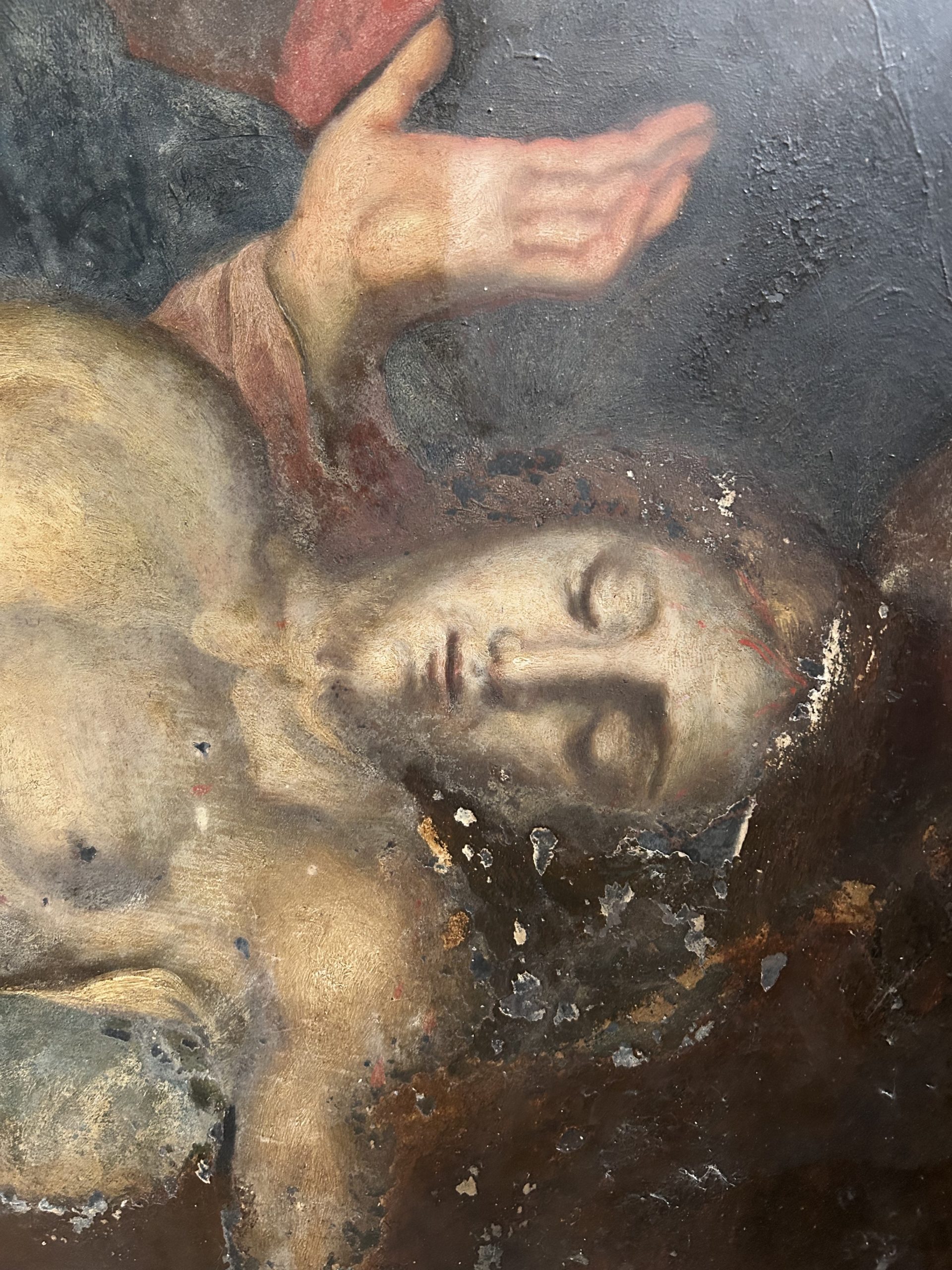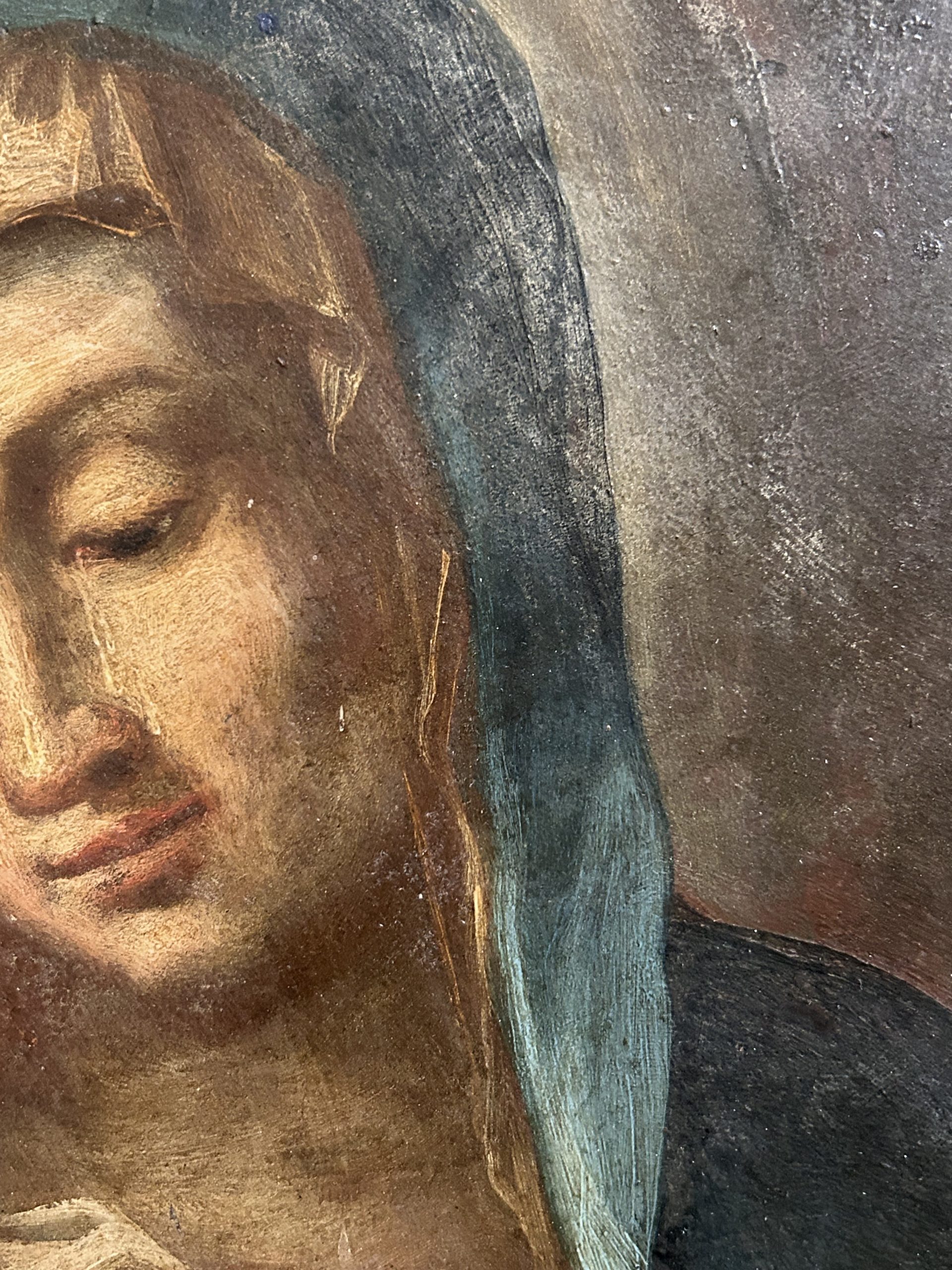 Cette pièce illustre la virtuosité des maîtres de l’école génoise du Seicento à travers une représentation de la Pietà d’une intensité dramatique rare. La scène dépeint la Vierge Marie soutenant le corps du Christ dans une composition pyramidale classique du baroque italien. L’iconographie est enrichie par la présence d’anges recueillant le Précieux Sang dans des calices dorés, un motif eucharistique puissant propre à la ferveur religieuse de la Contre-Réforme.