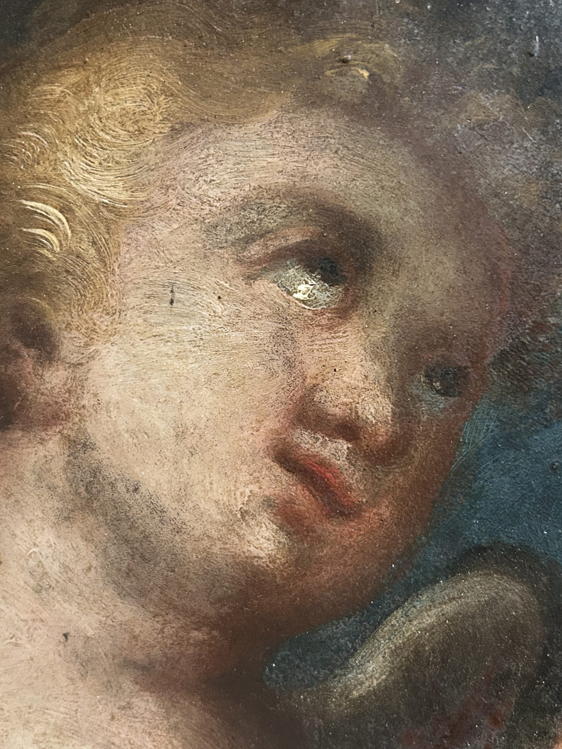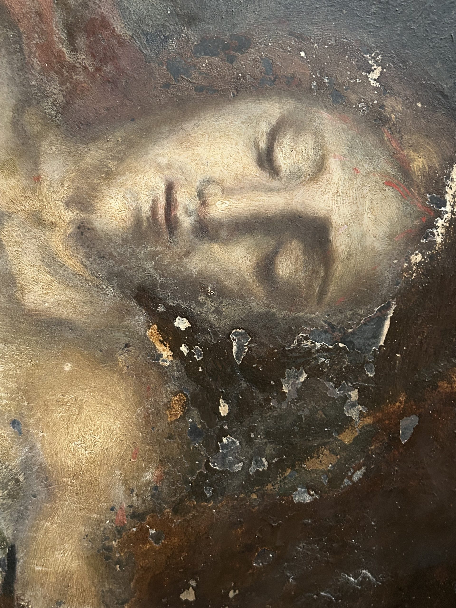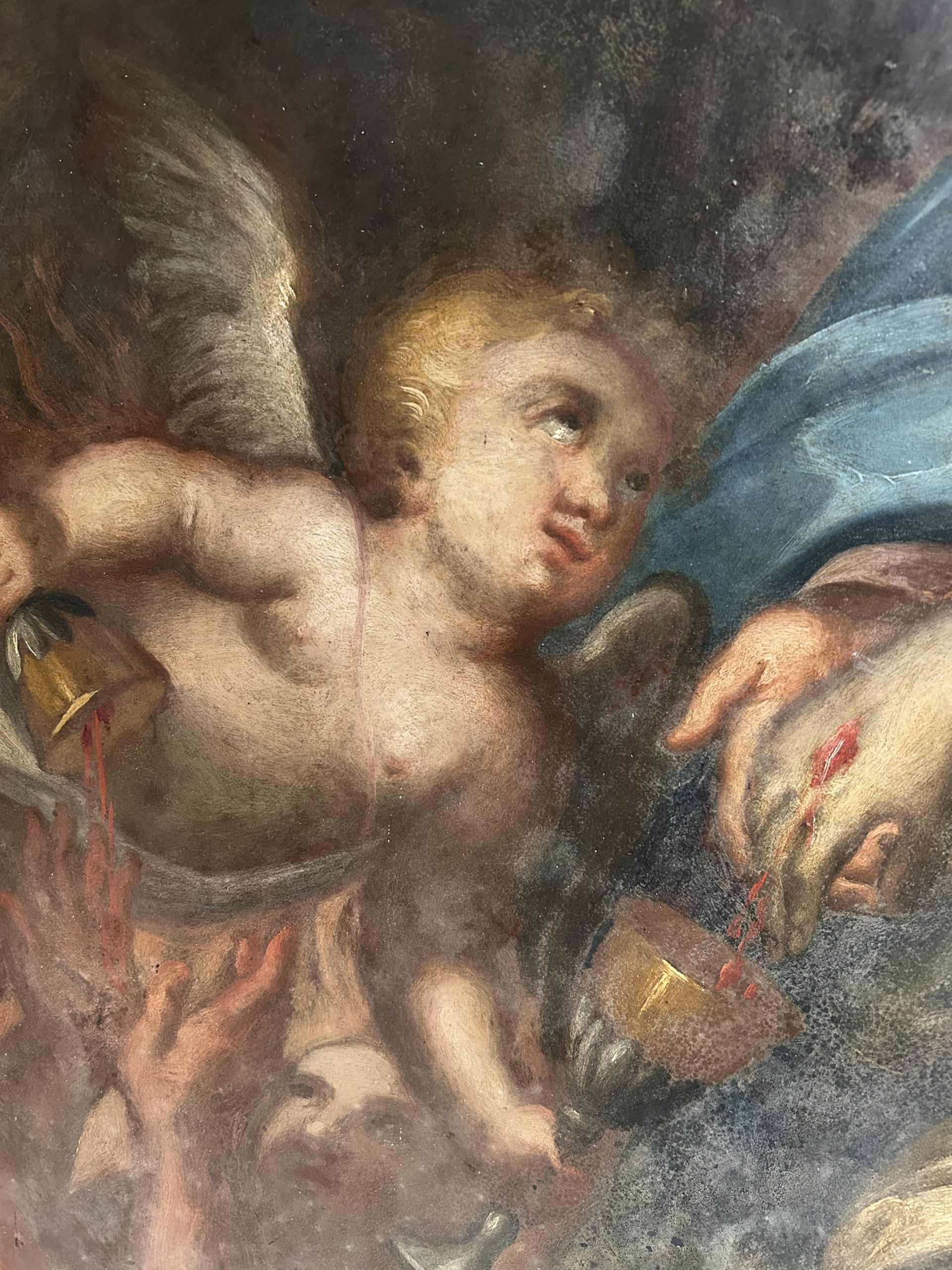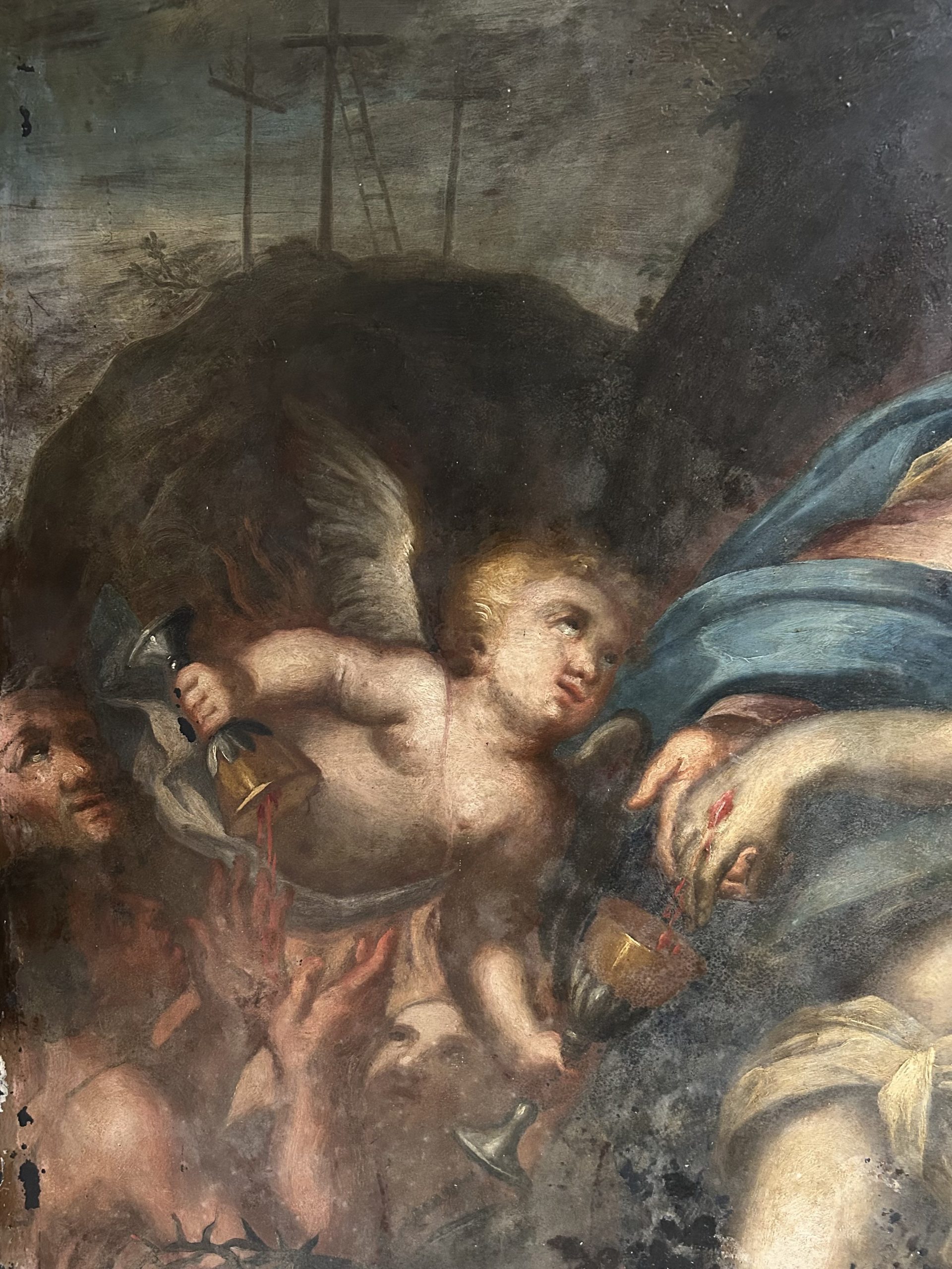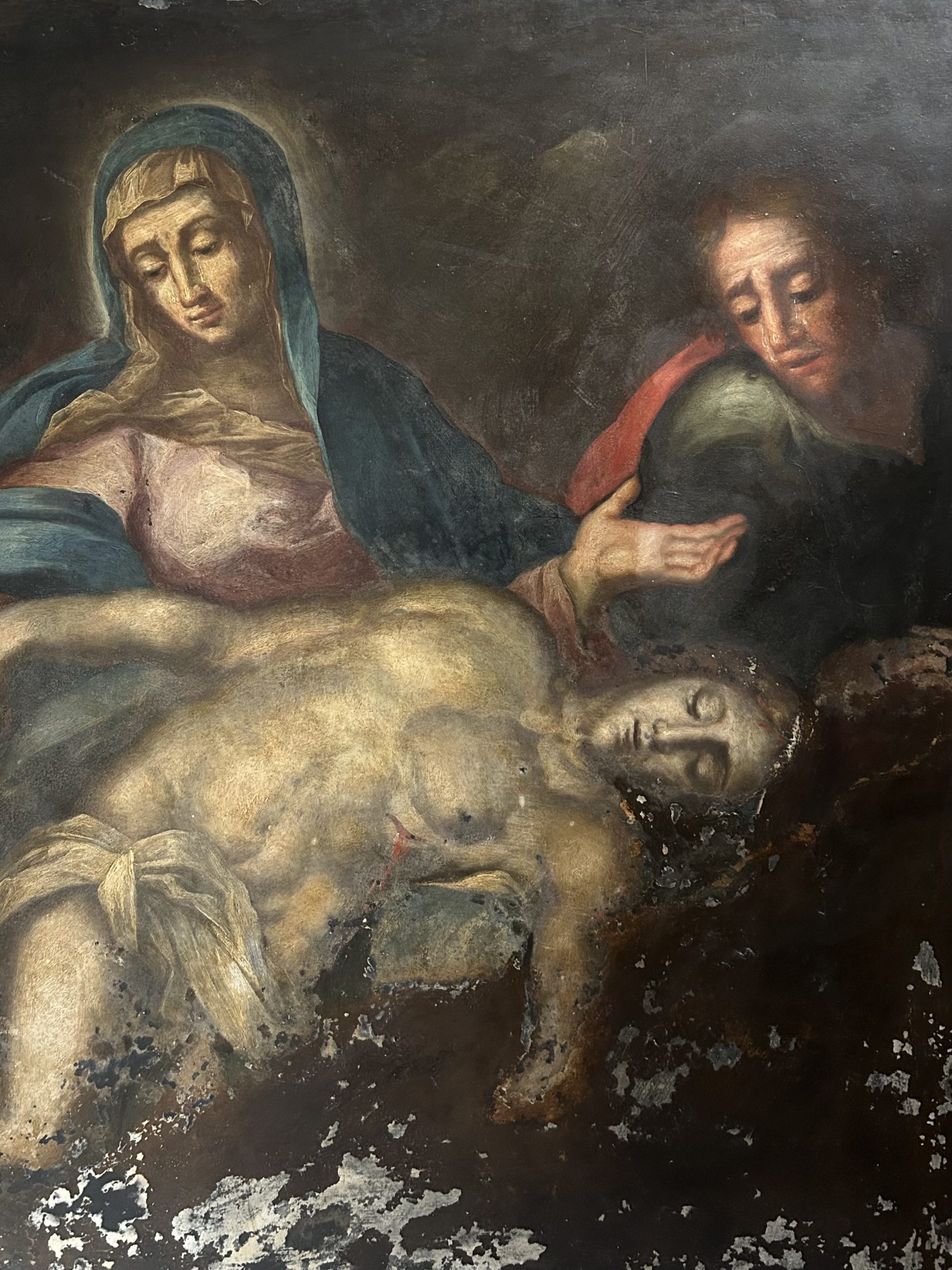 This piece illustrates the virtuosity of the masters of the Genoese school of the Seicento (17th century) through a representation of the Pietà of rare dramatic intensity. The scene depicts the Virgin Mary supporting the body of Christ in a classic pyramidal composition of the Italian Baroque. The iconography is enriched by the presence of angels collecting the Precious Blood in gilded chalices, a powerful Eucharistic motif characteristic of the religious fervor of the Counter-Reformation.