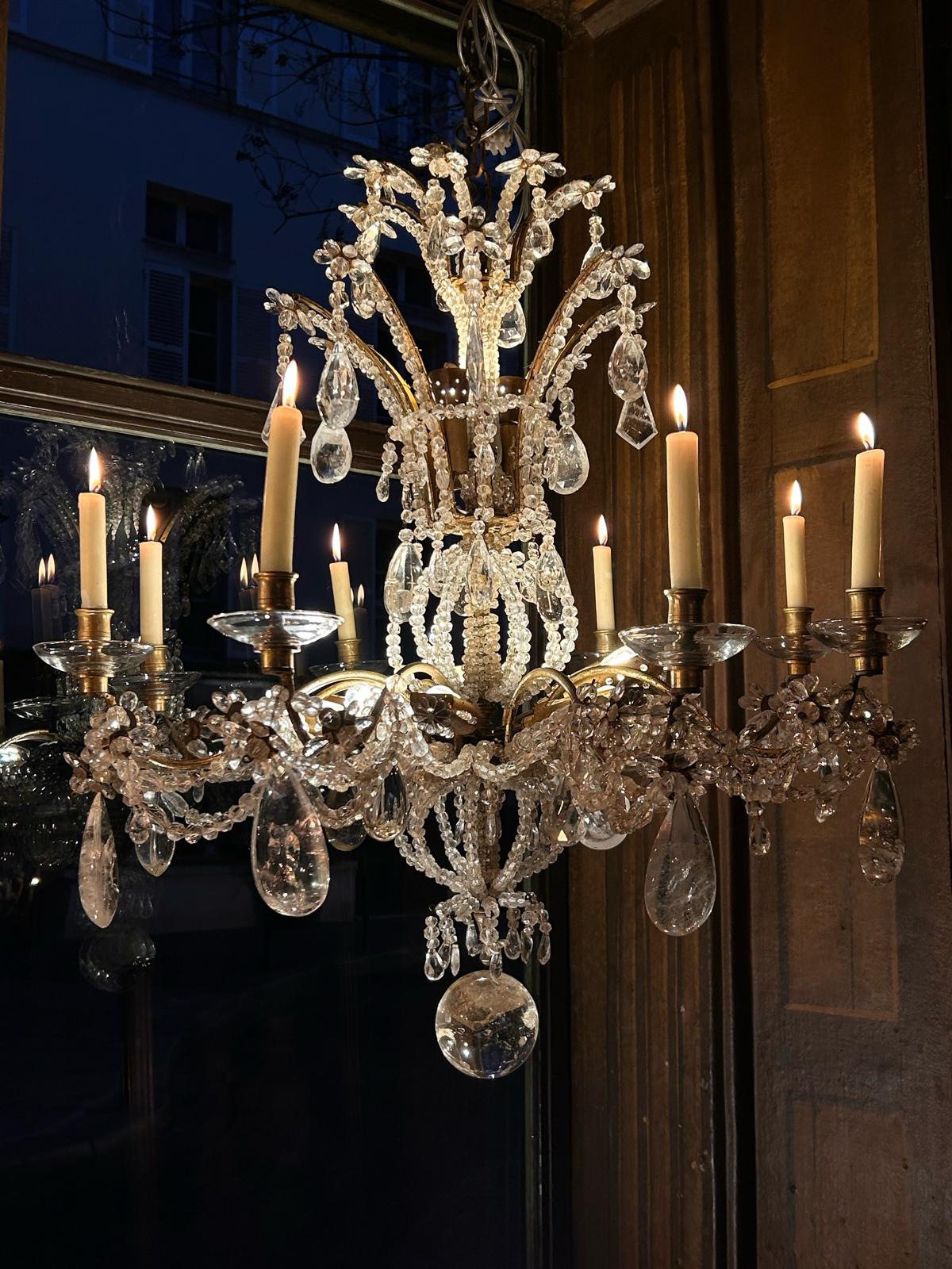Lustre en cristal de Roche à 11 lumières et 8 bras de bougies, perles taillées, perles soufflées perles baroques.