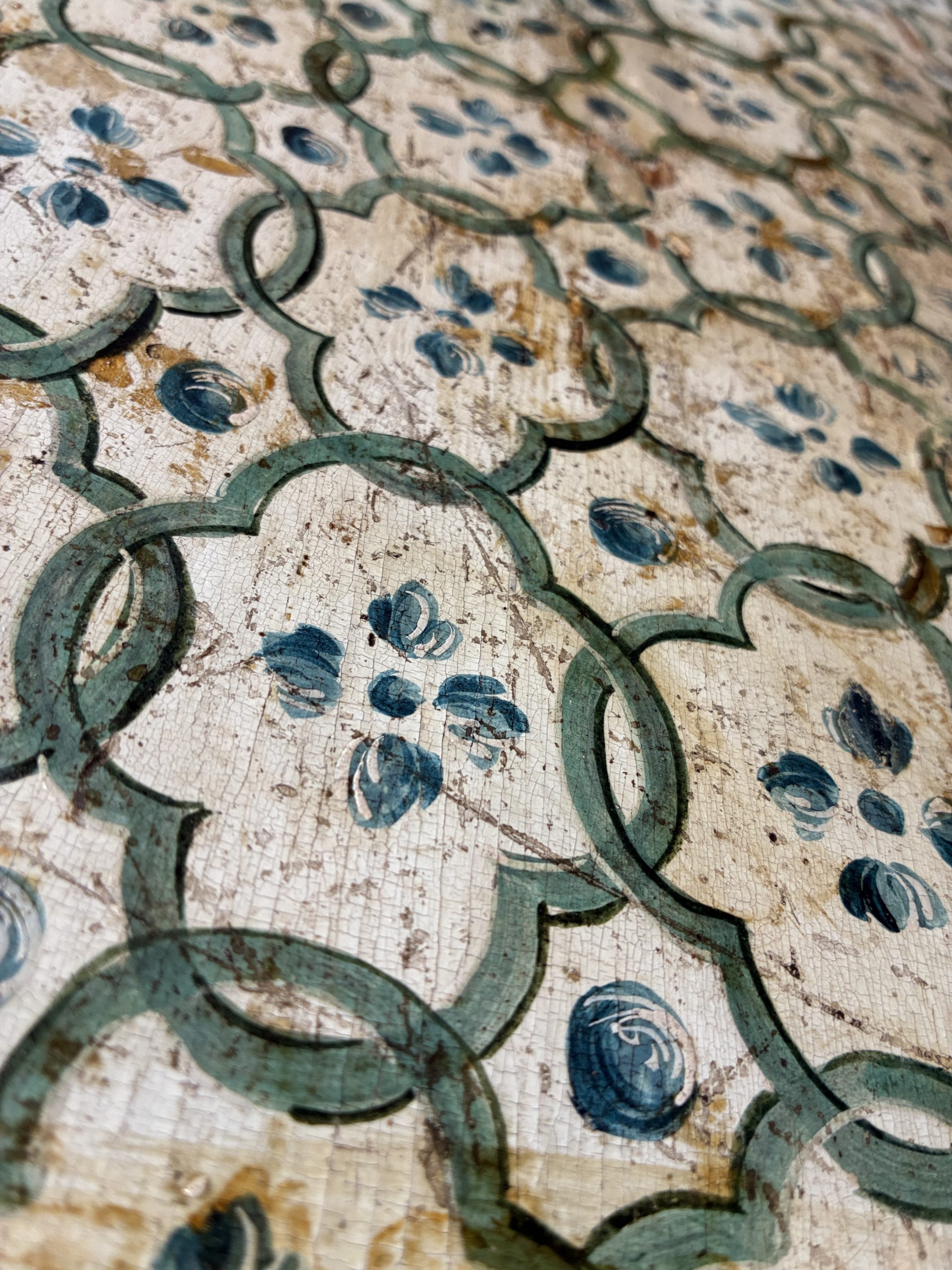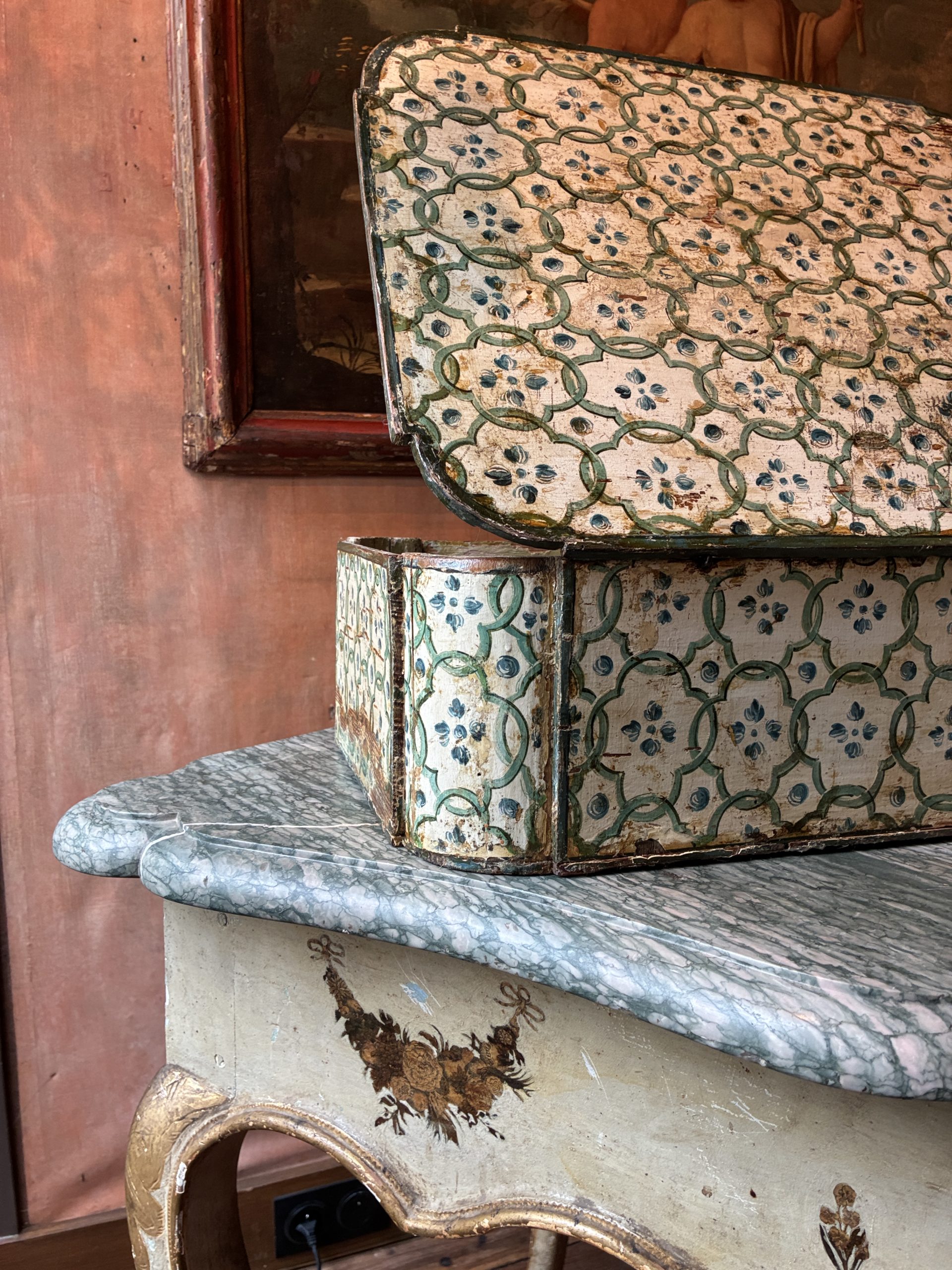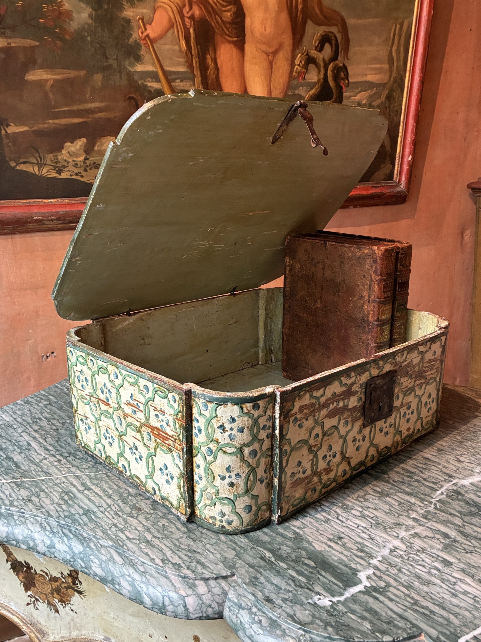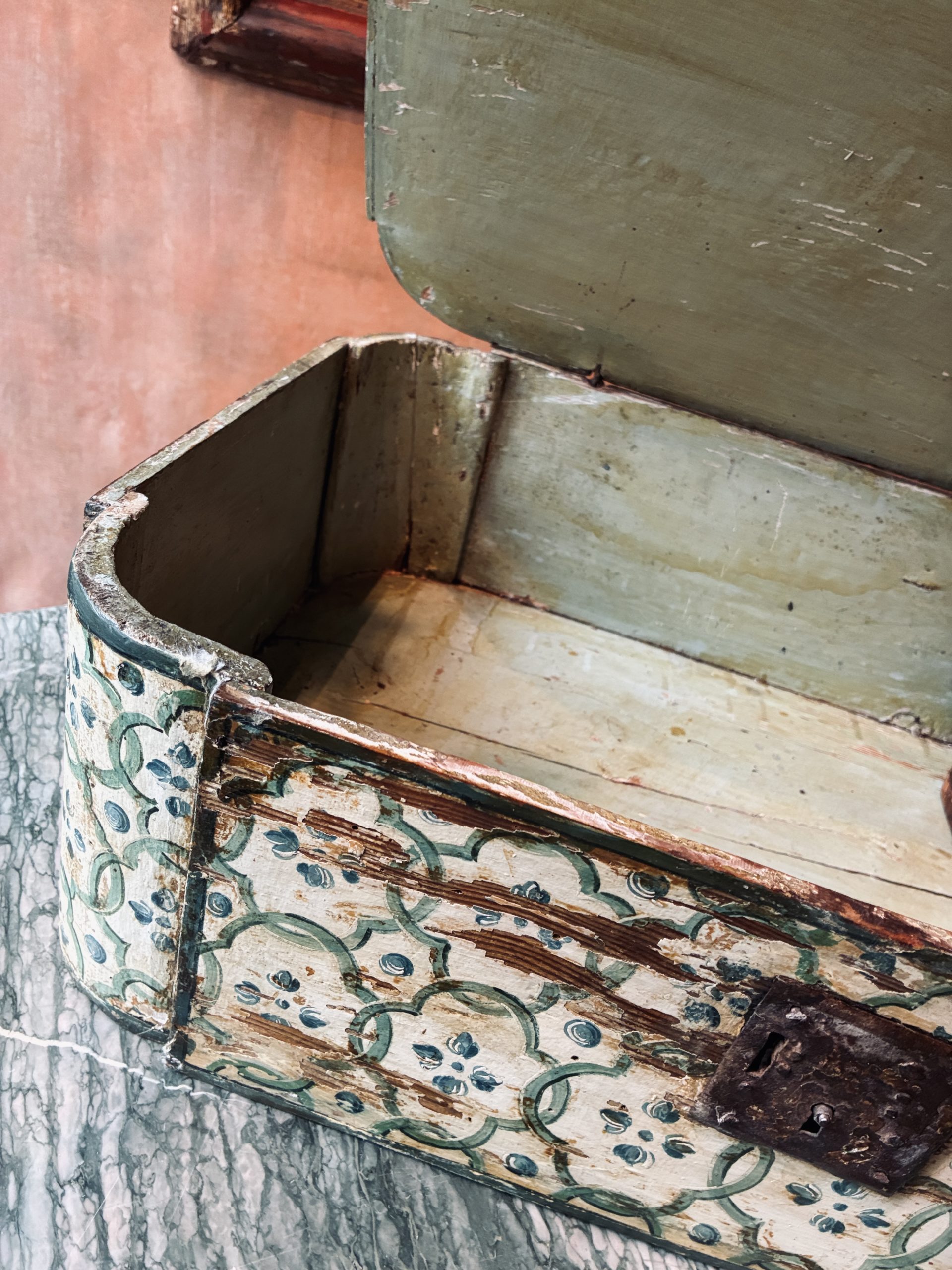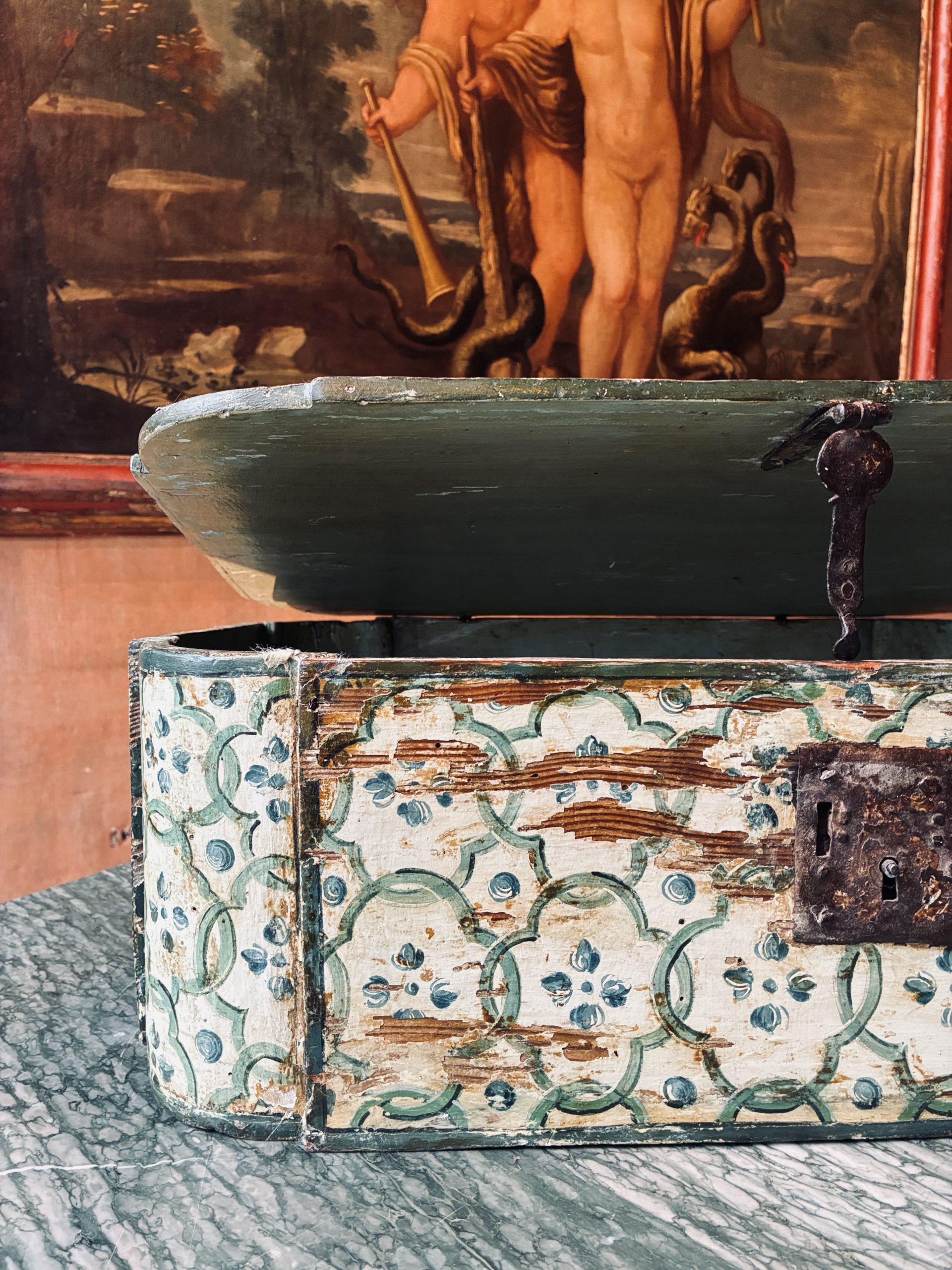 Boîte en bois polychrome décorée de motifs géométriques et munie d’une serrure en fer forgé.