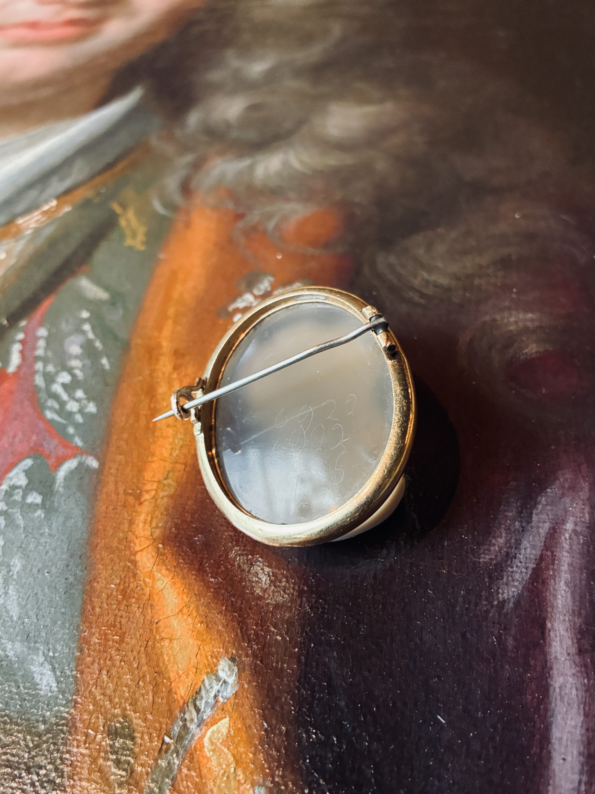Broche ovale avec camée, représentant une jeune femme regardant vers la droite. Très joli travail de sculpture sur la chevelure ondulée.