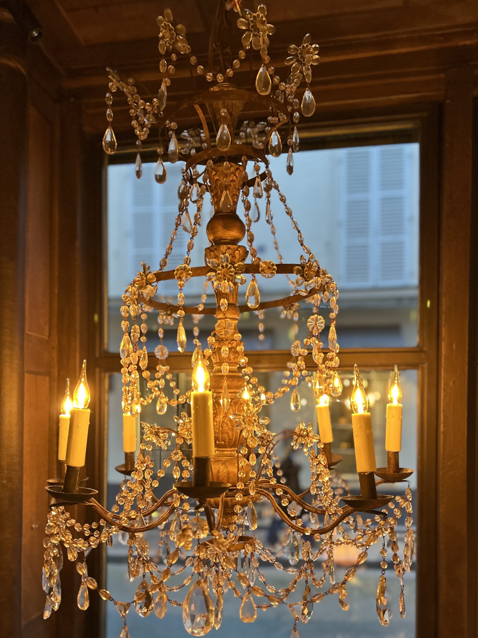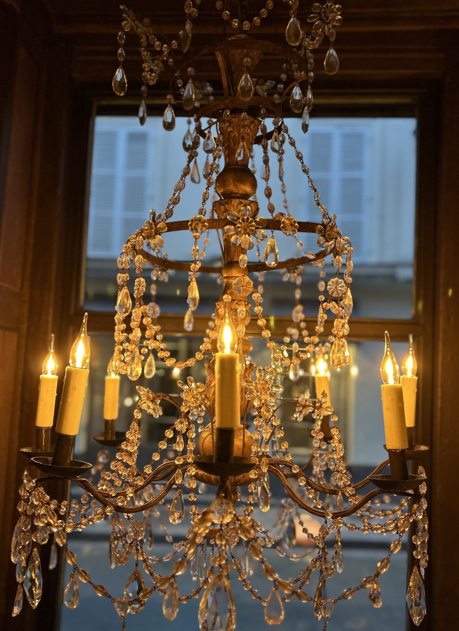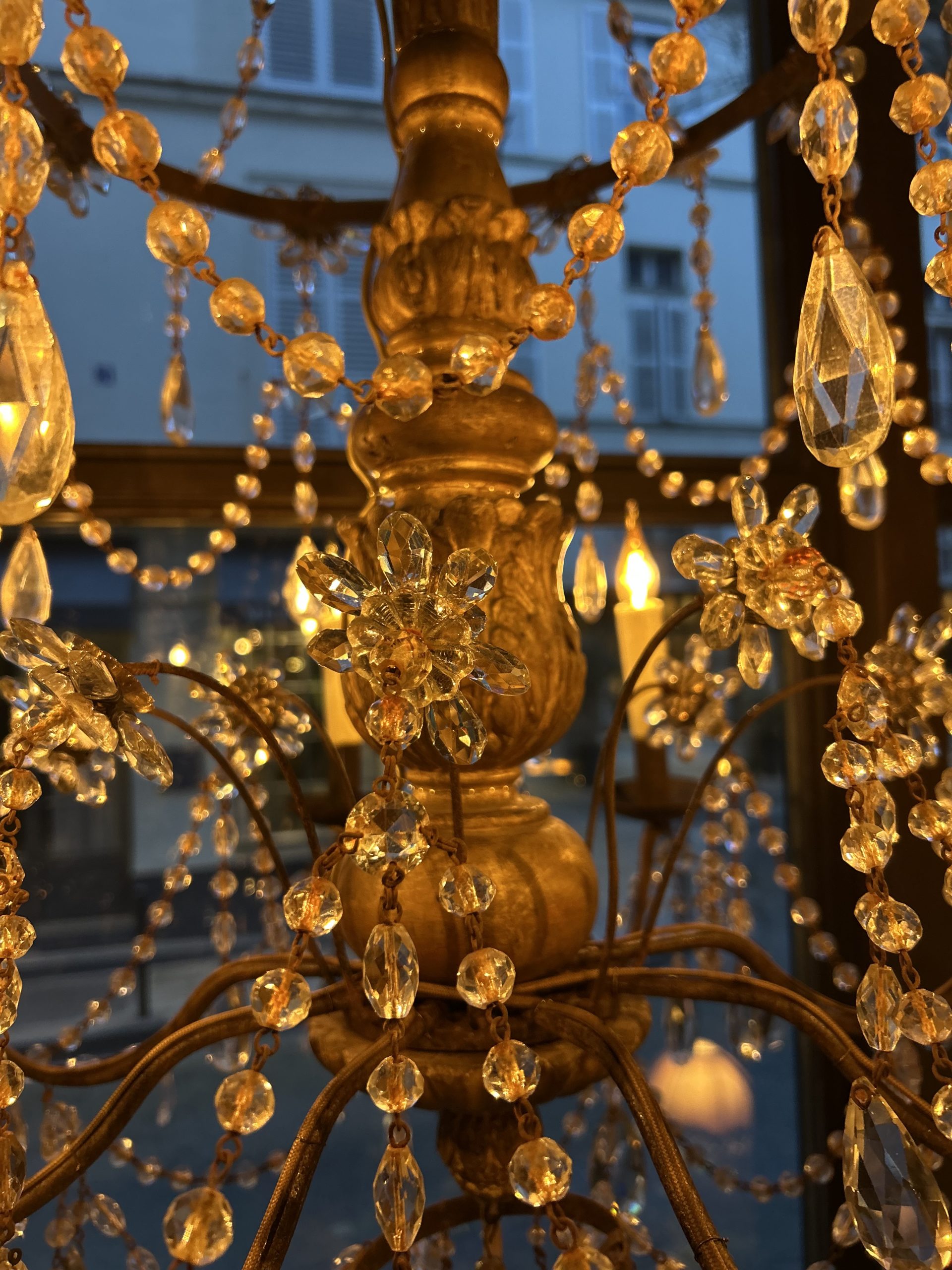 Lustre d’église à 8 bras de lumière, fût centrale en bois sculpté et doré, perles en verre taillé.