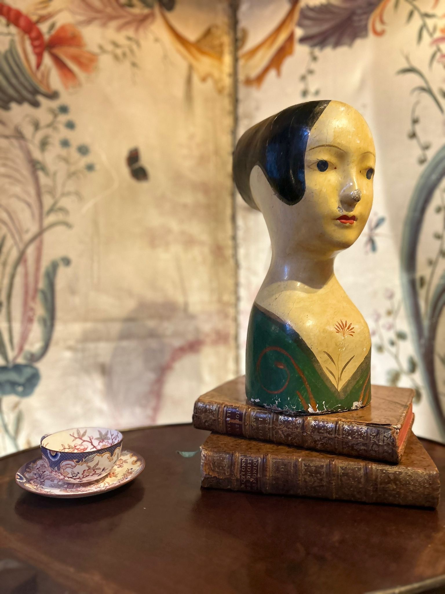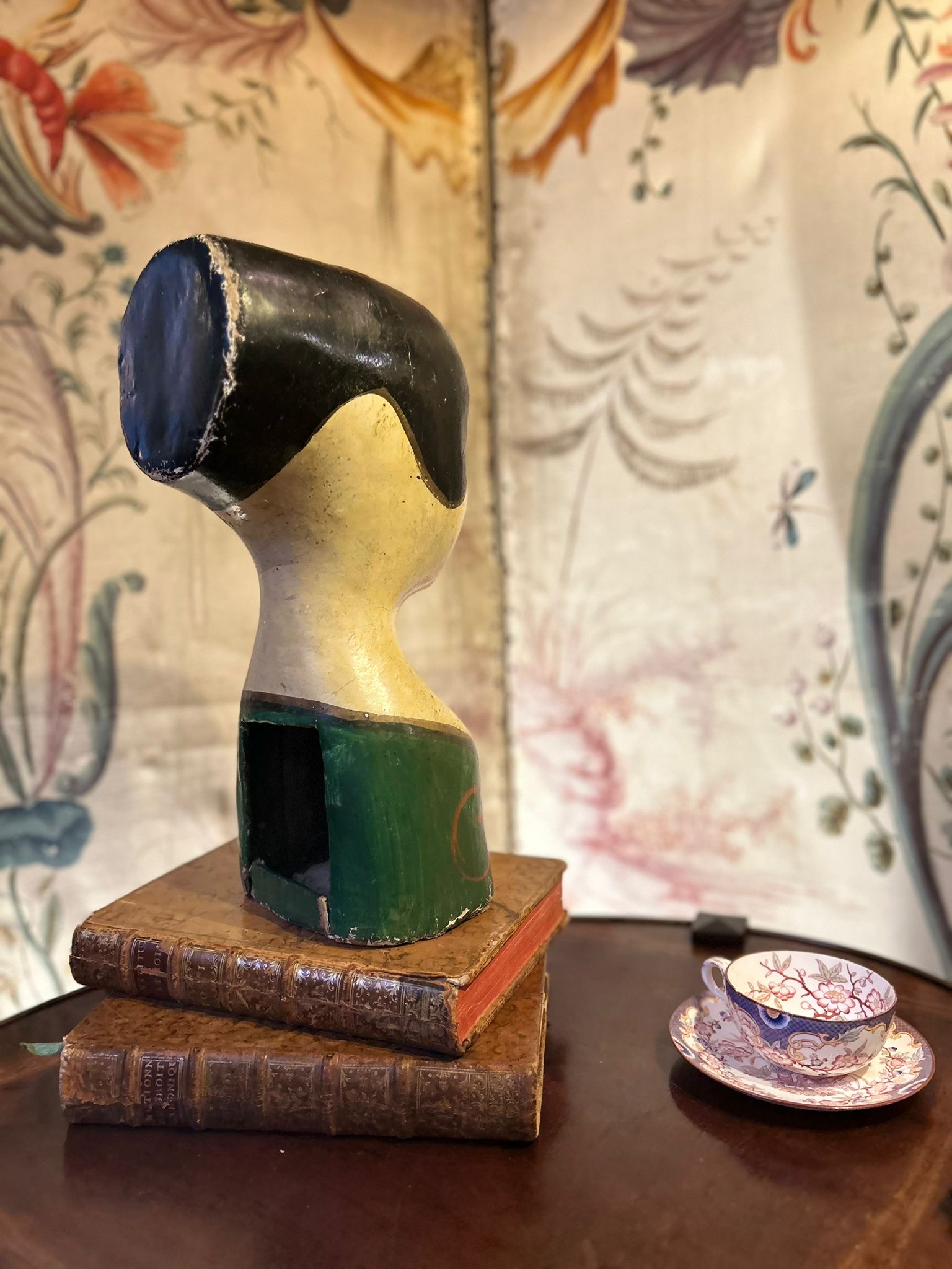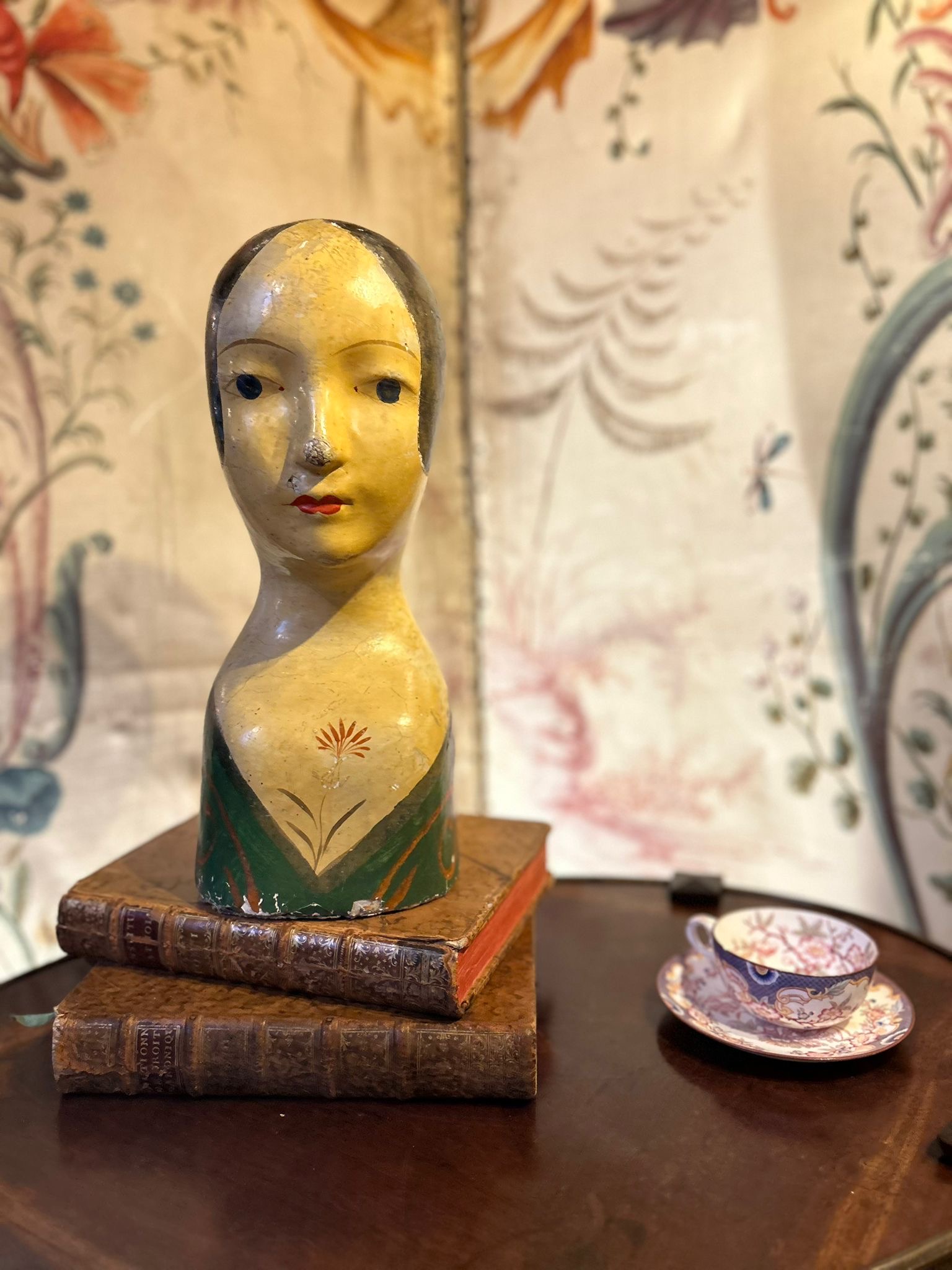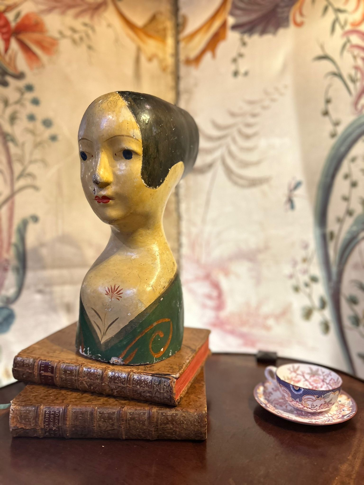 Marotte en papier mâché peint polychrome, présentant une figure féminine à la chevelure noire et au corsage.