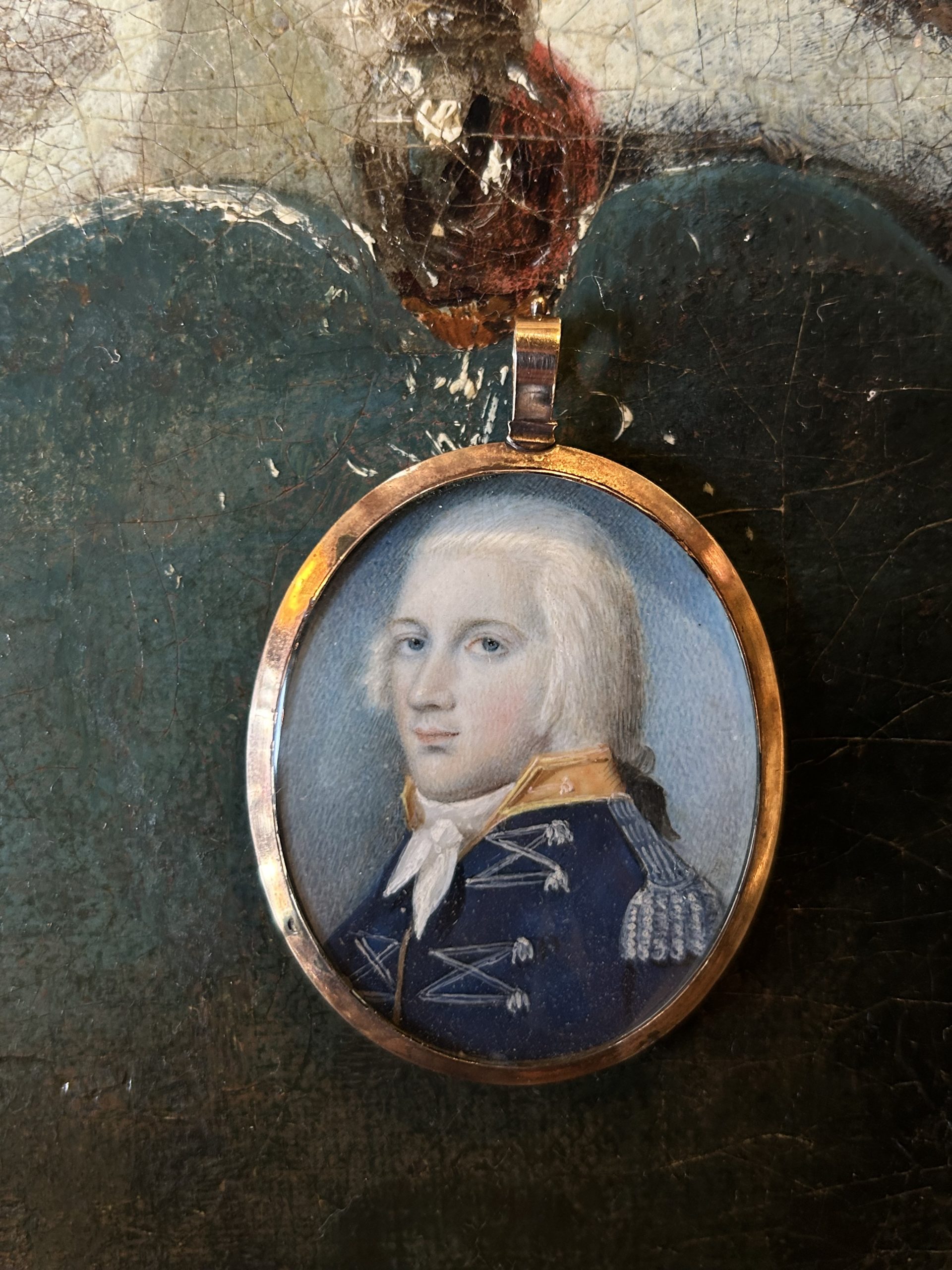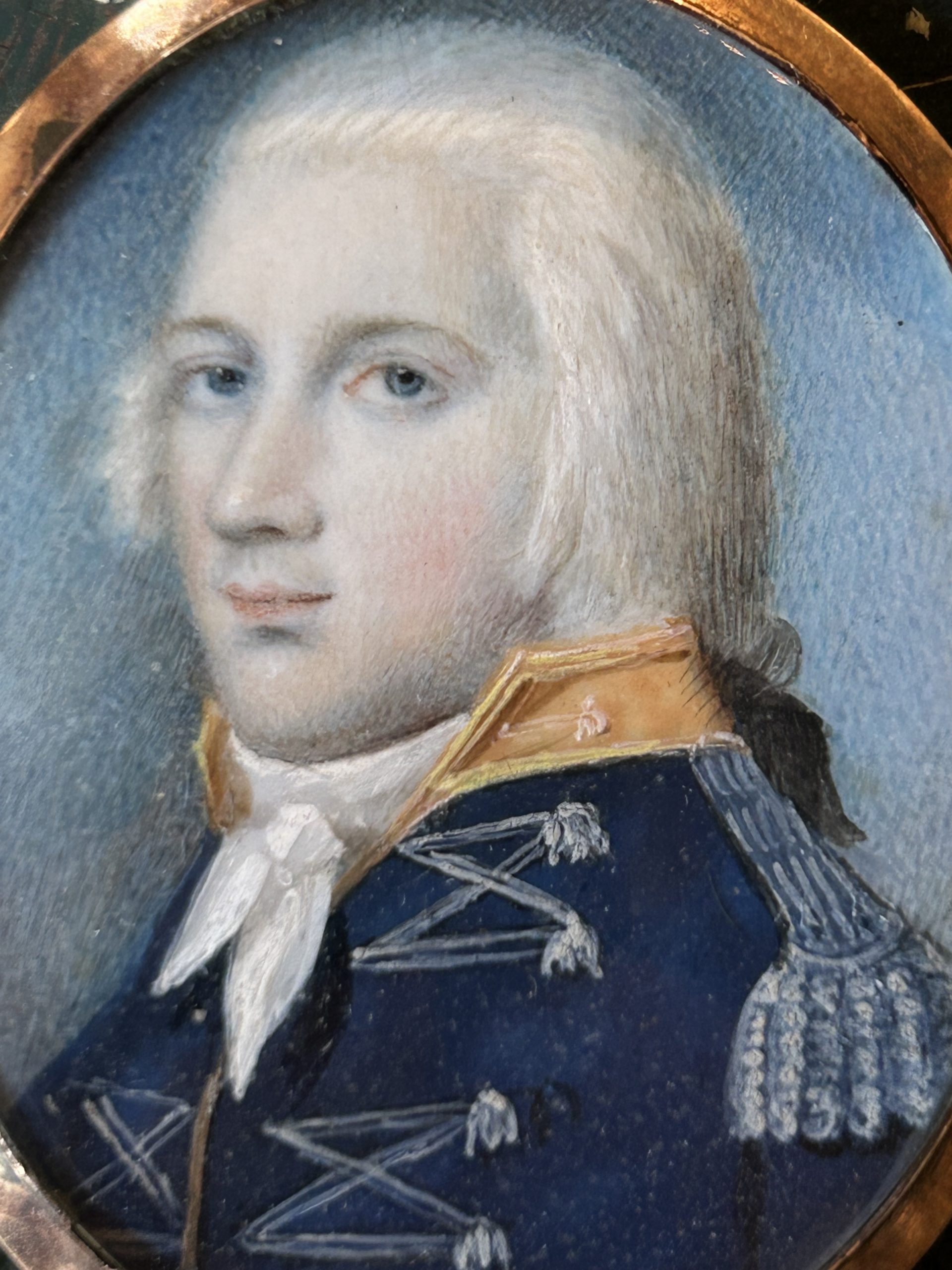 Élégante miniature ovale attribuée à Robert Field (1769–1819), représentant le portrait d’un amiral en buste, vêtu de son uniforme bleu rehaussé d’épaulettes et de broderies dorées. Le modèle est figuré de trois-quarts, sur un fond délicatement nuancé de bleu, mettant en valeur la finesse du visage.