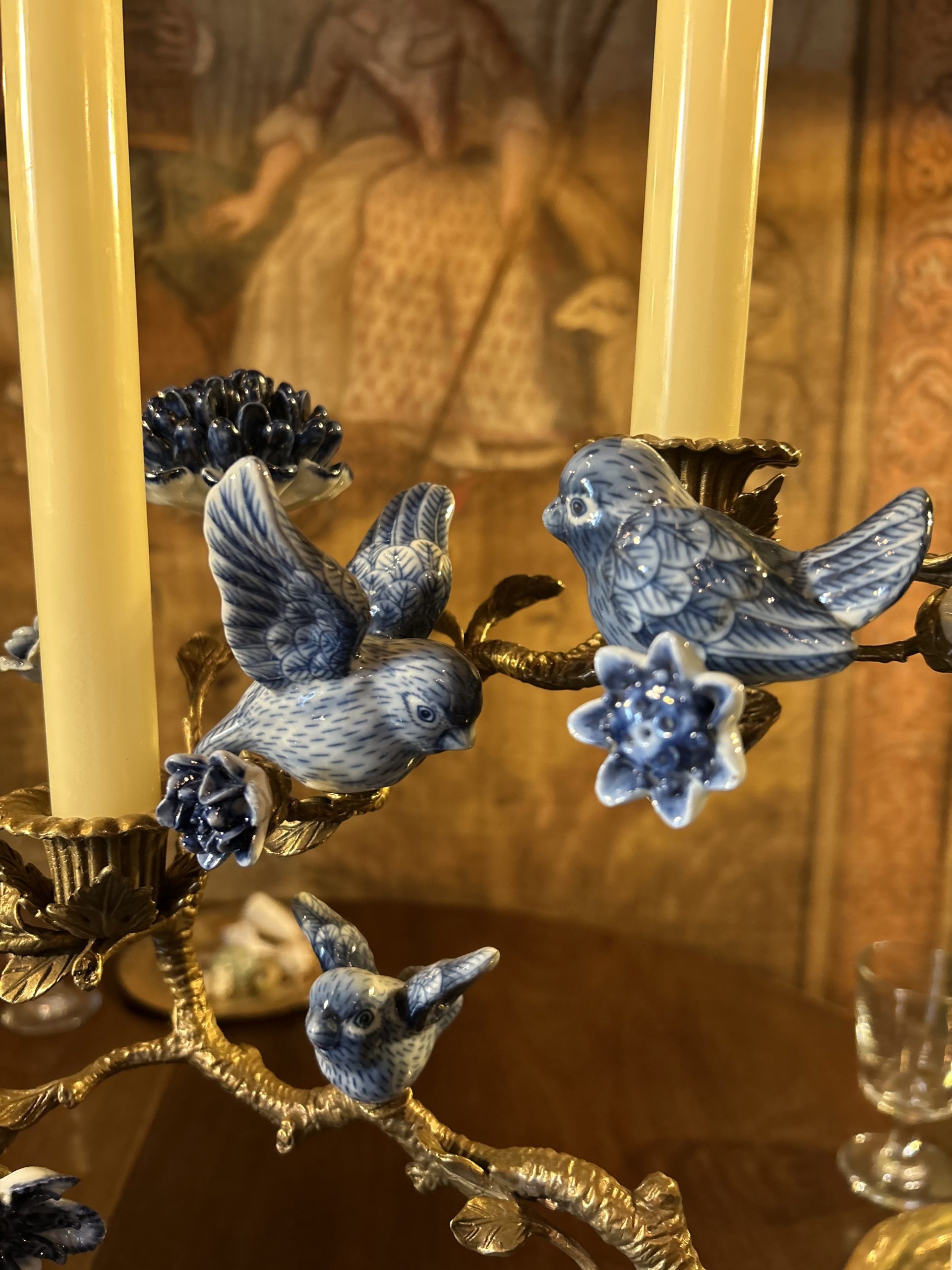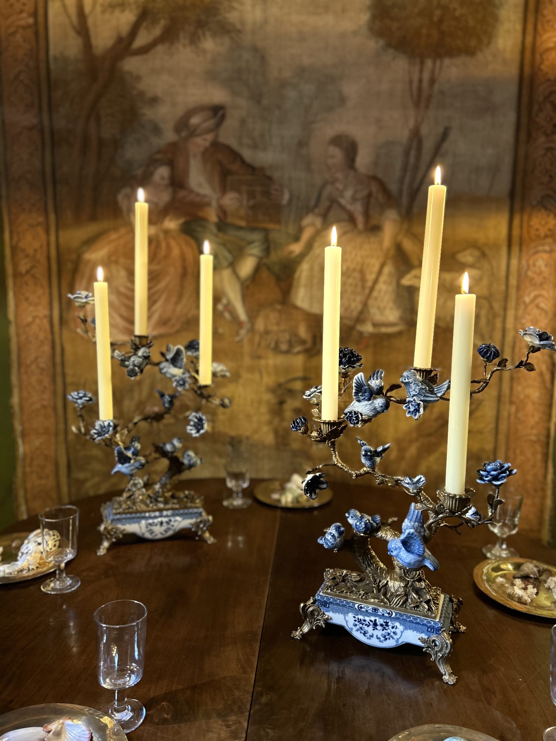 Paire de candélabres aux oiseaux en porcelaine