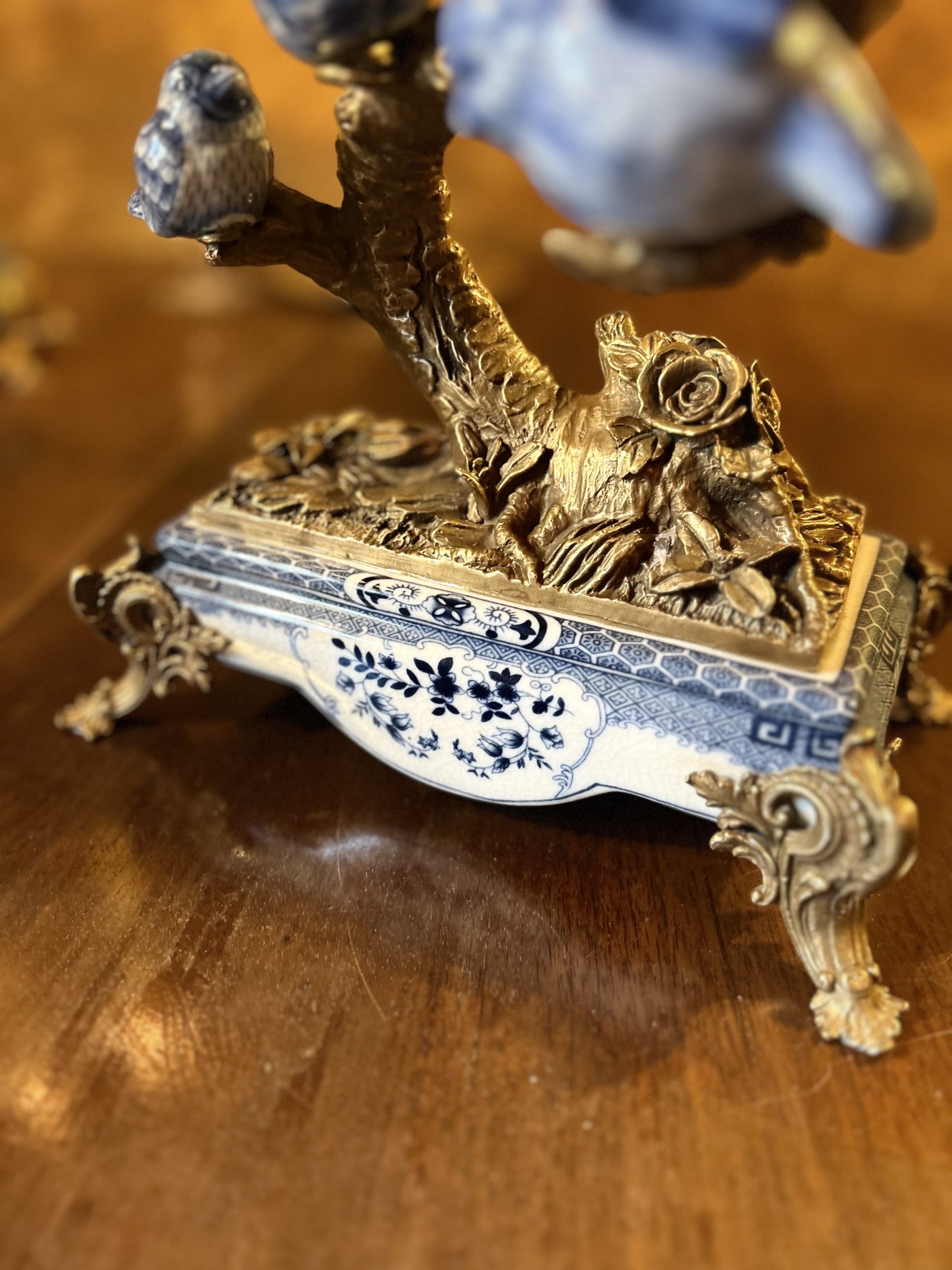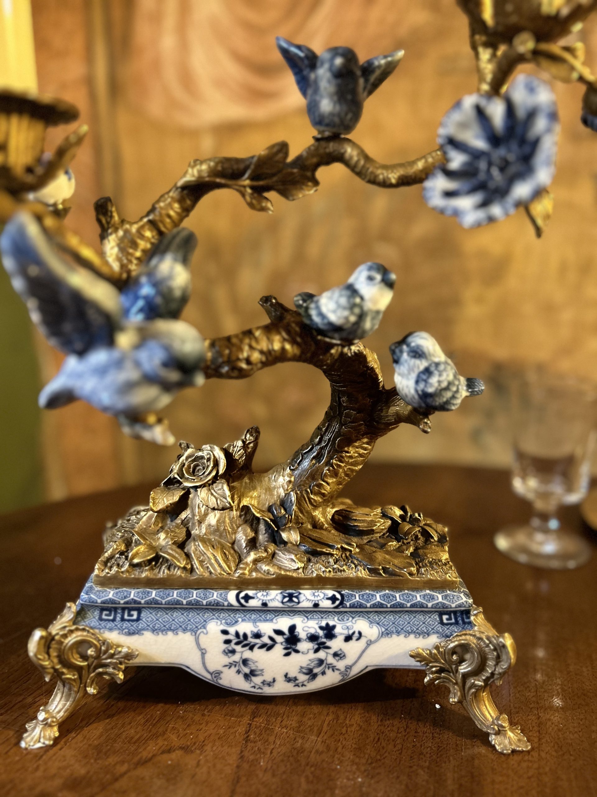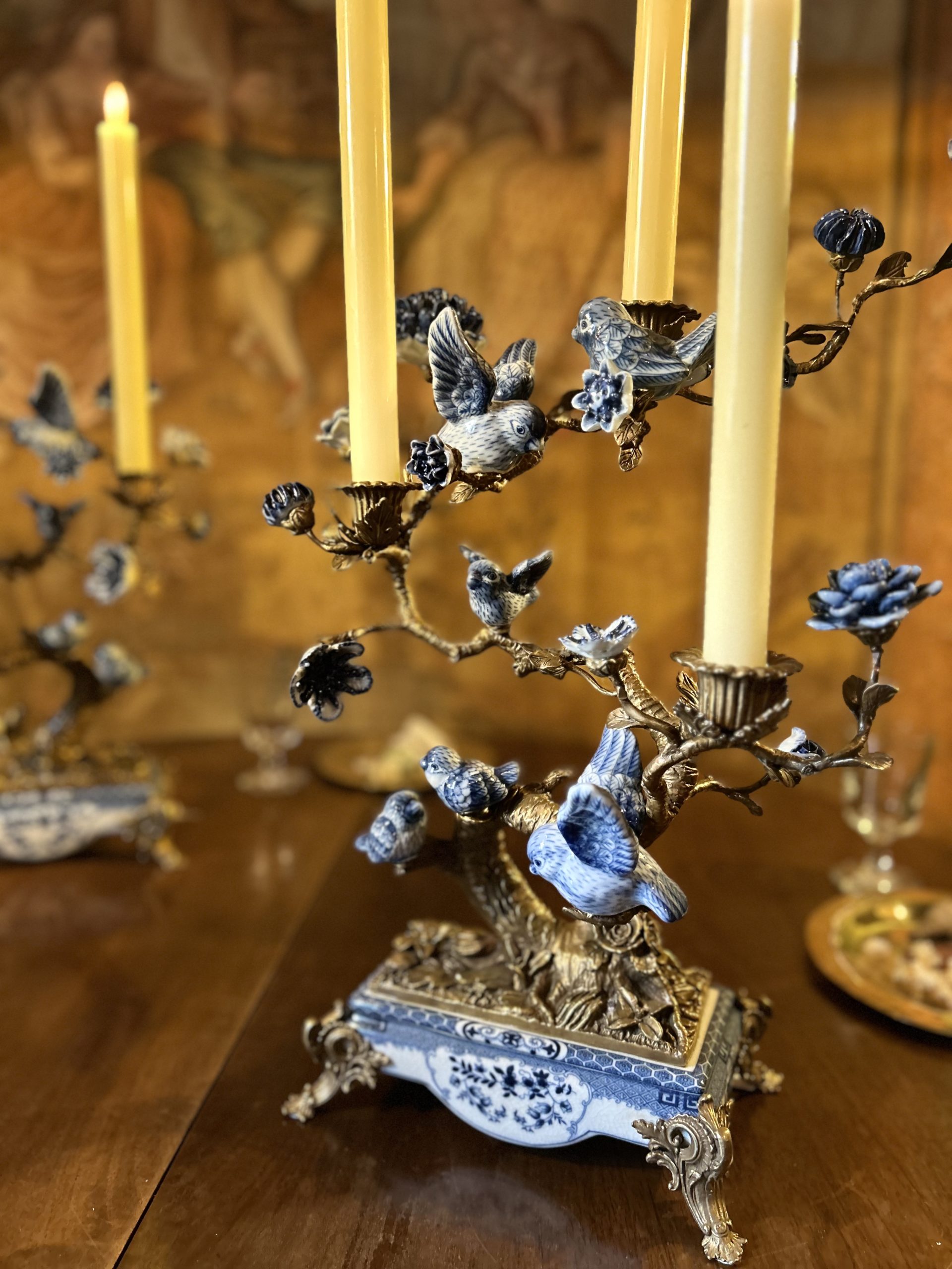 Paire de candélabres aux oiseaux en porcelaine bleue et blanche de Wong Lee. Ces derniers représentent des oiseaux et des fleurs posés sur des branchages en bronze doré, formant trois bras de lumière. L’ensemble repose sur des socles rectangulaires en porcelaine et bronze doré.