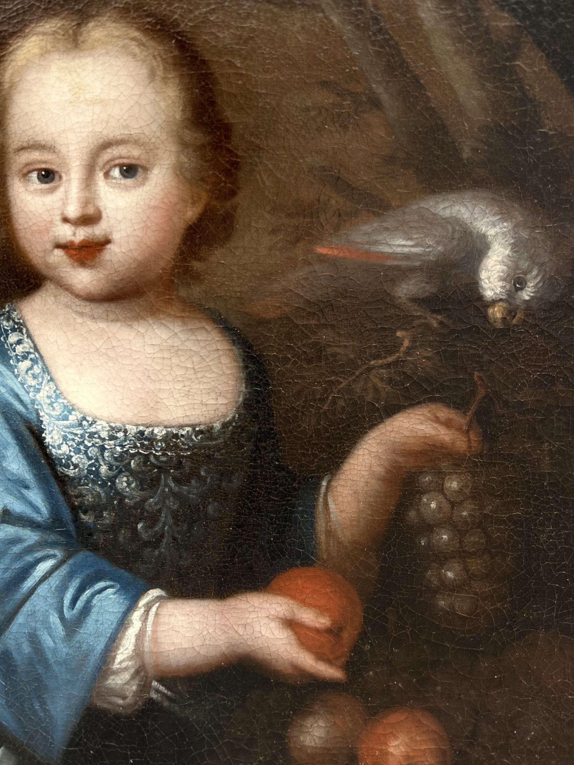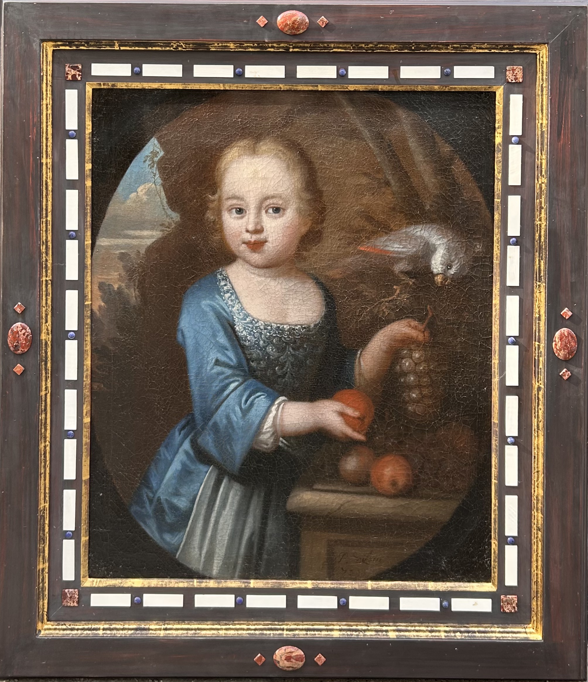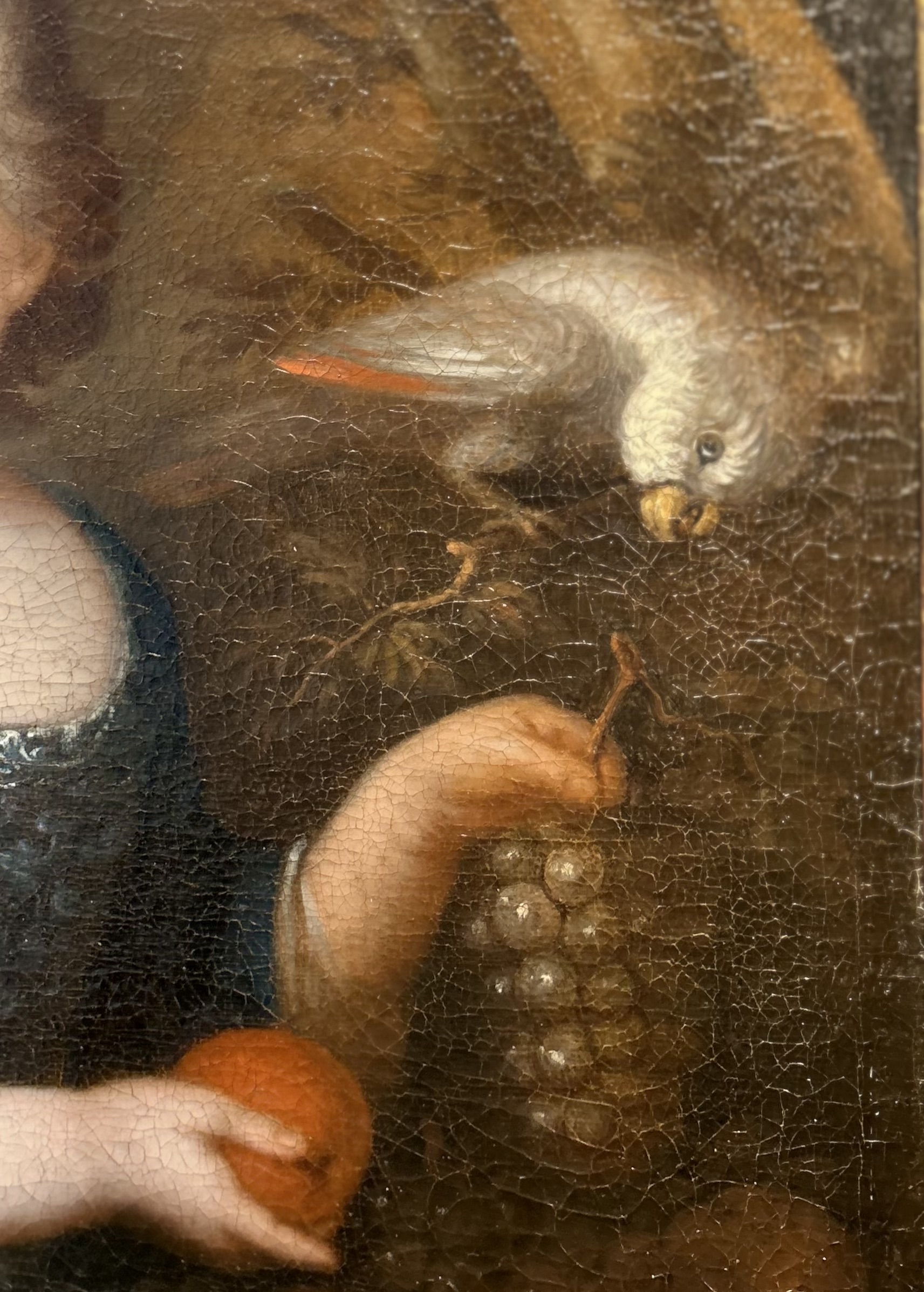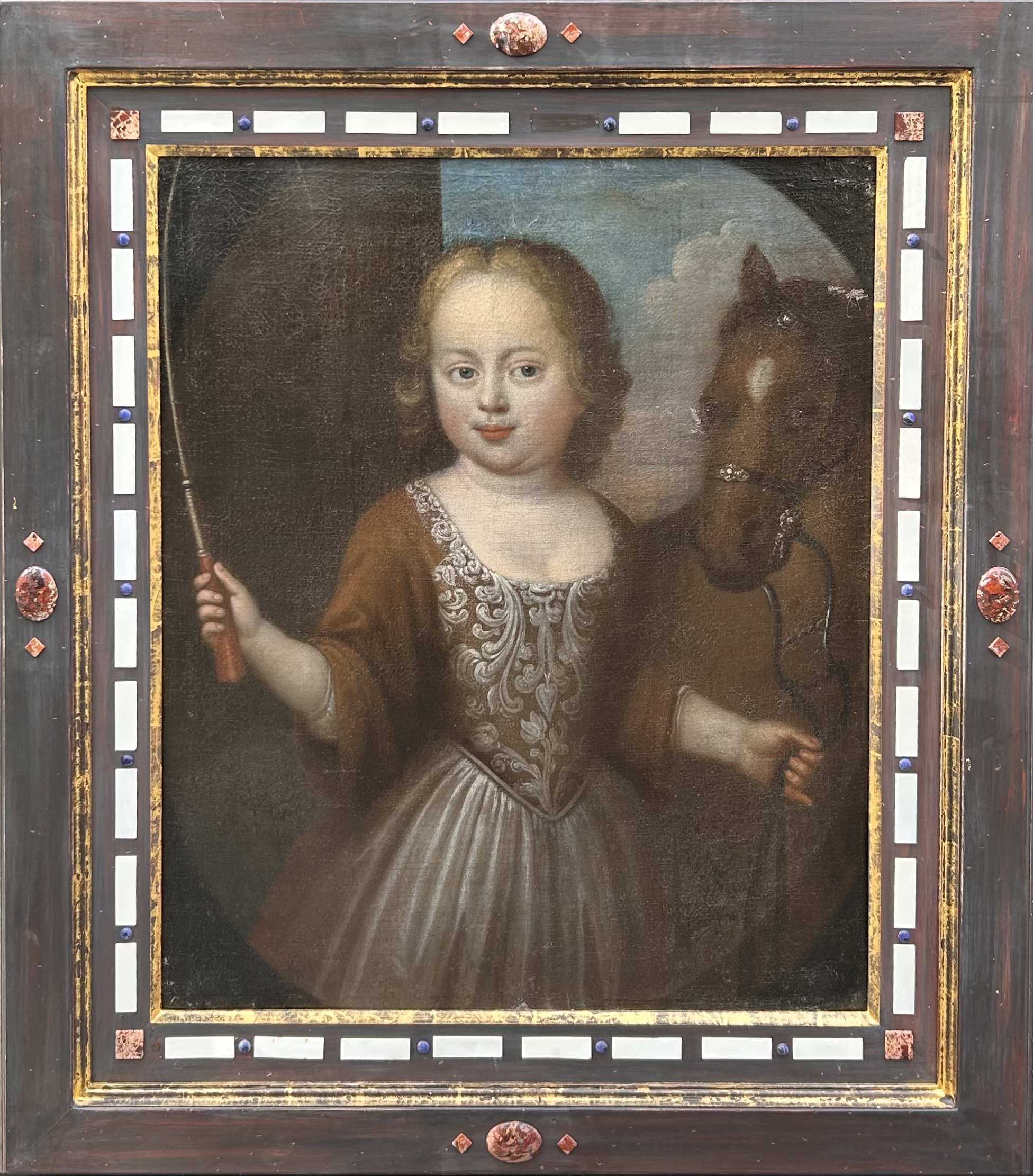 Paire de huiles sur toiles dans des ovales feints, jeune fille tenant une grappe de raisins devant un perroquet et jeune fille écuyère près de son cheval, trace de signature et de date en bas à droite, cadres postérieurs.