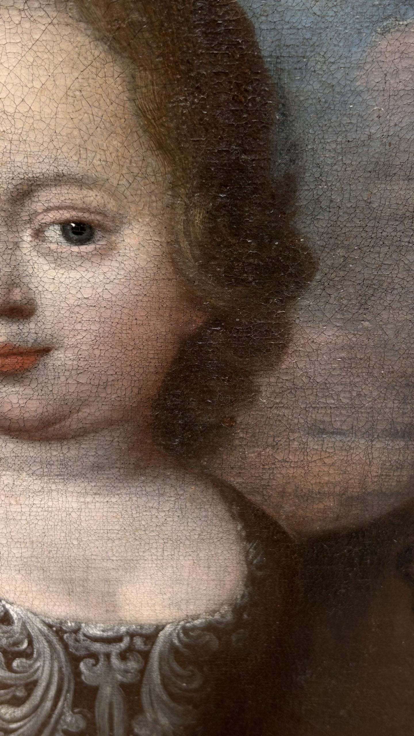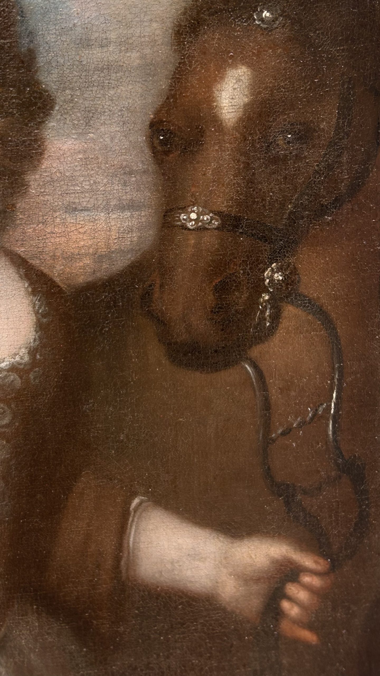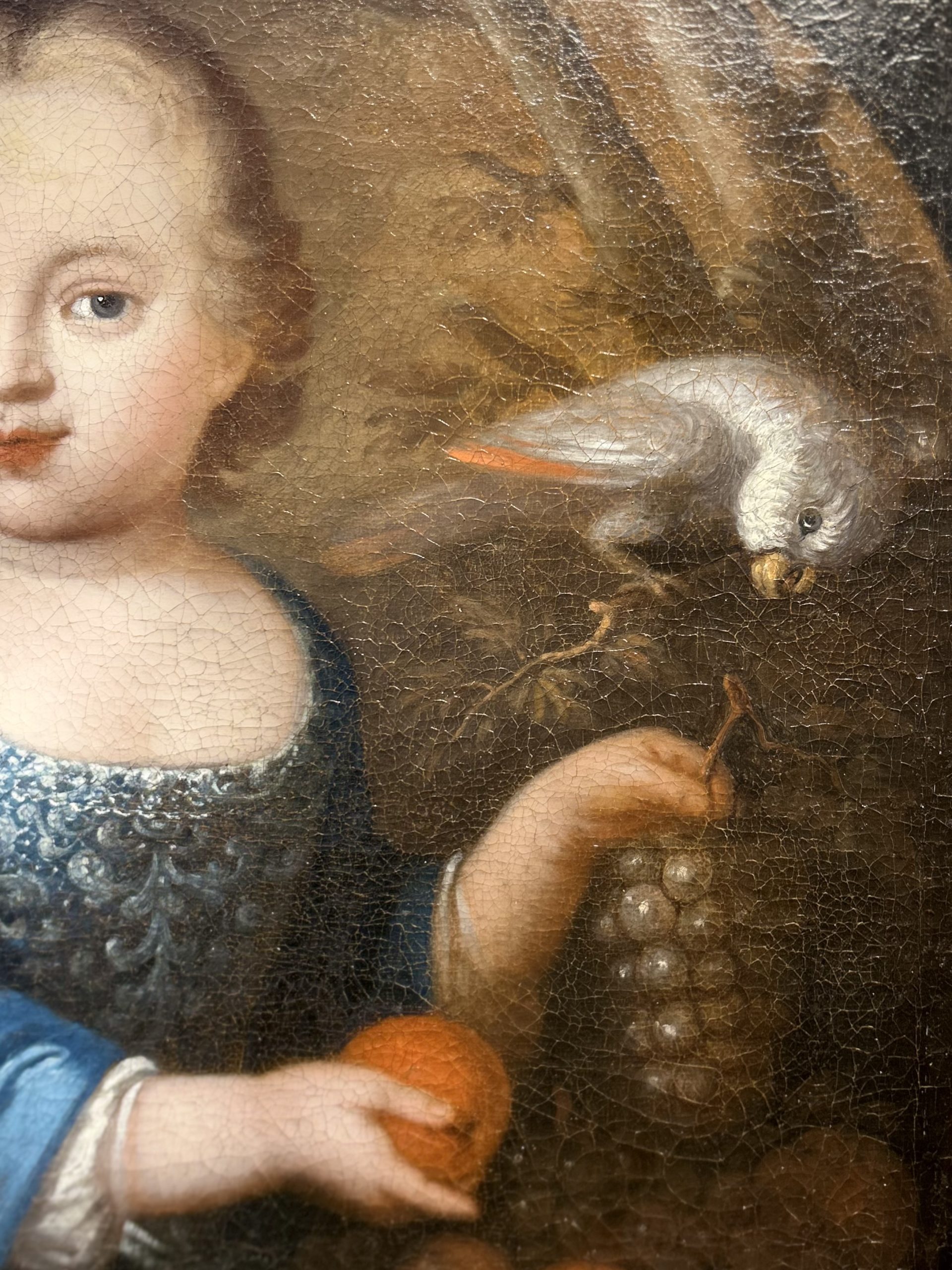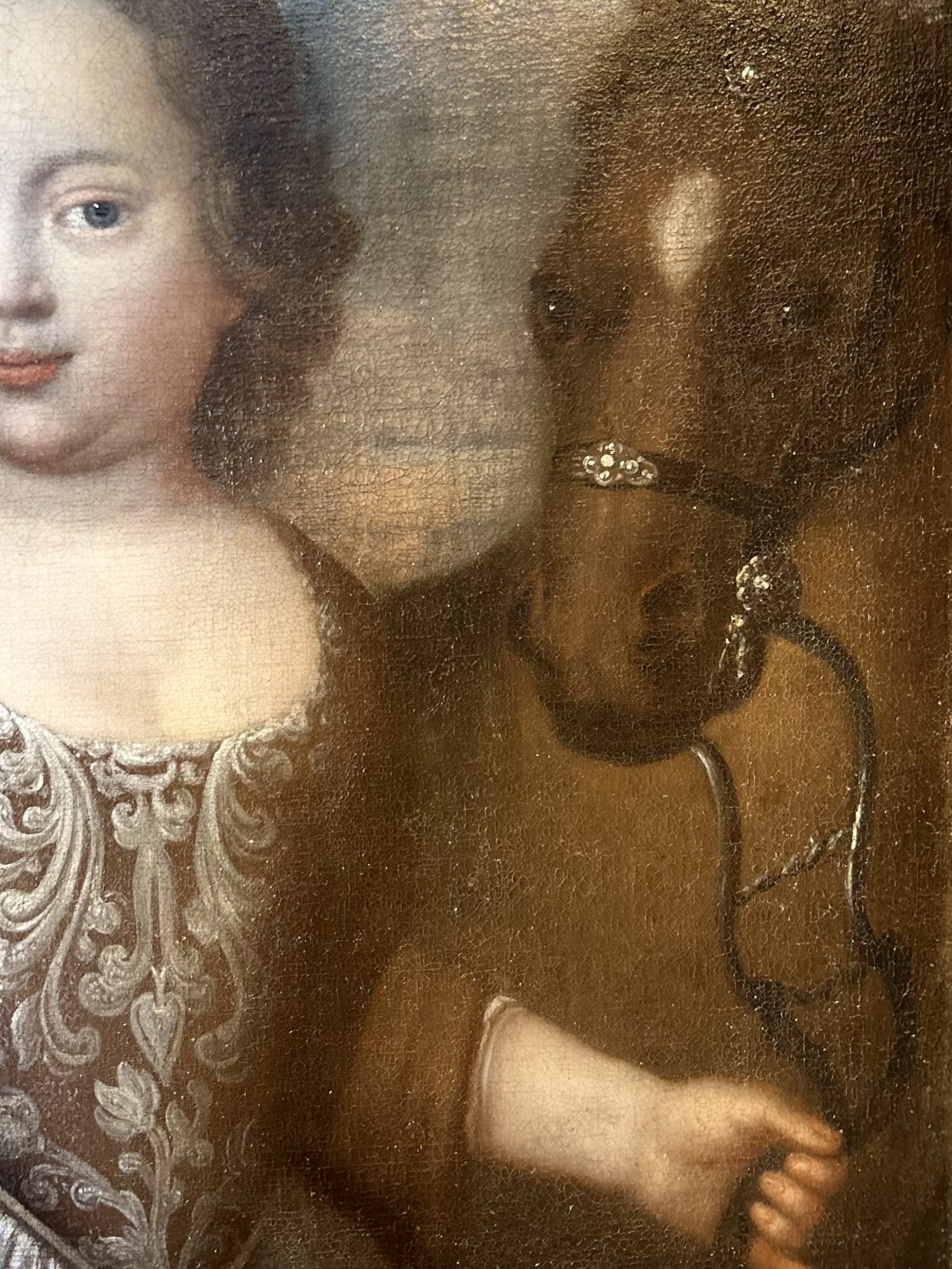 Paire de huiles sur toiles dans des ovales feints, jeune fille tenant une grappe de raisins devant un perroquet et jeune fille écuyère près de son cheval, trace de signature et de date en bas à droite, cadres postérieurs.
