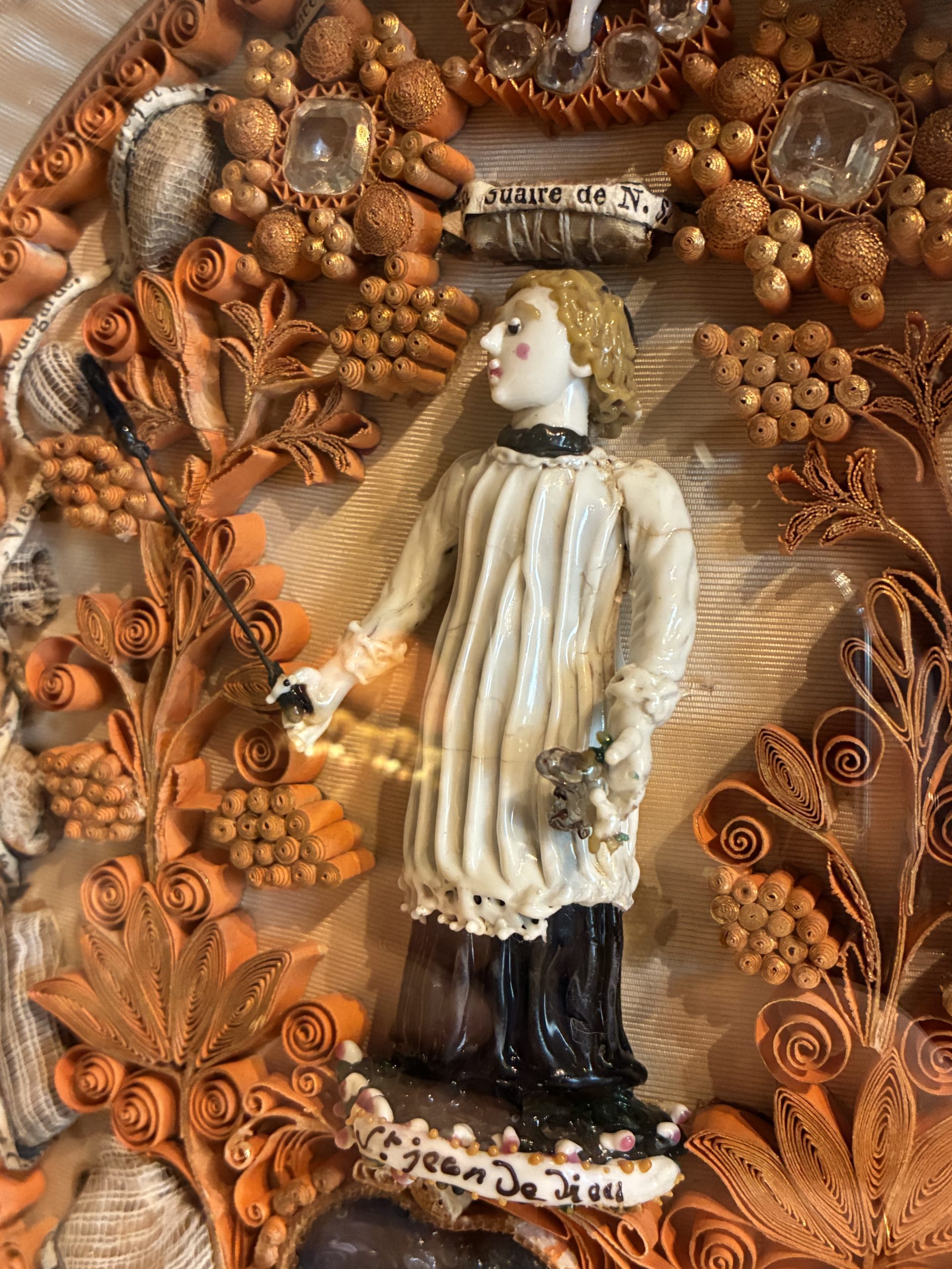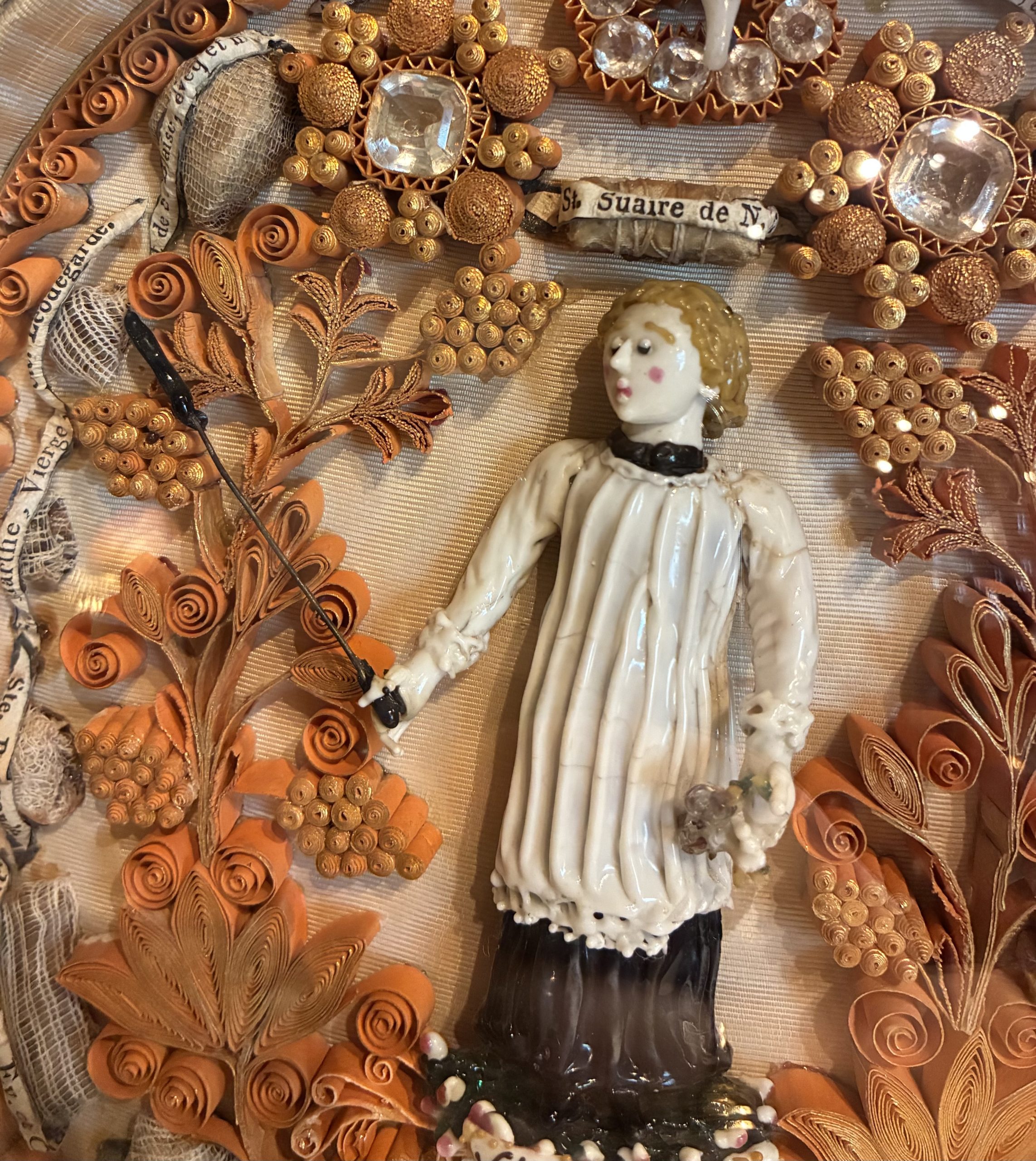 L’art des paperolles a été pratiqué dès la Renaissance, principalement dans les couvents, par des organisations religieuses pour vénérer Dieu et embellir les messages sacrés. Ce travail de patience extrême permettait de promouvoir les croyances en transformant des matériaux modestes en écrins précieux pour les restes des saints.