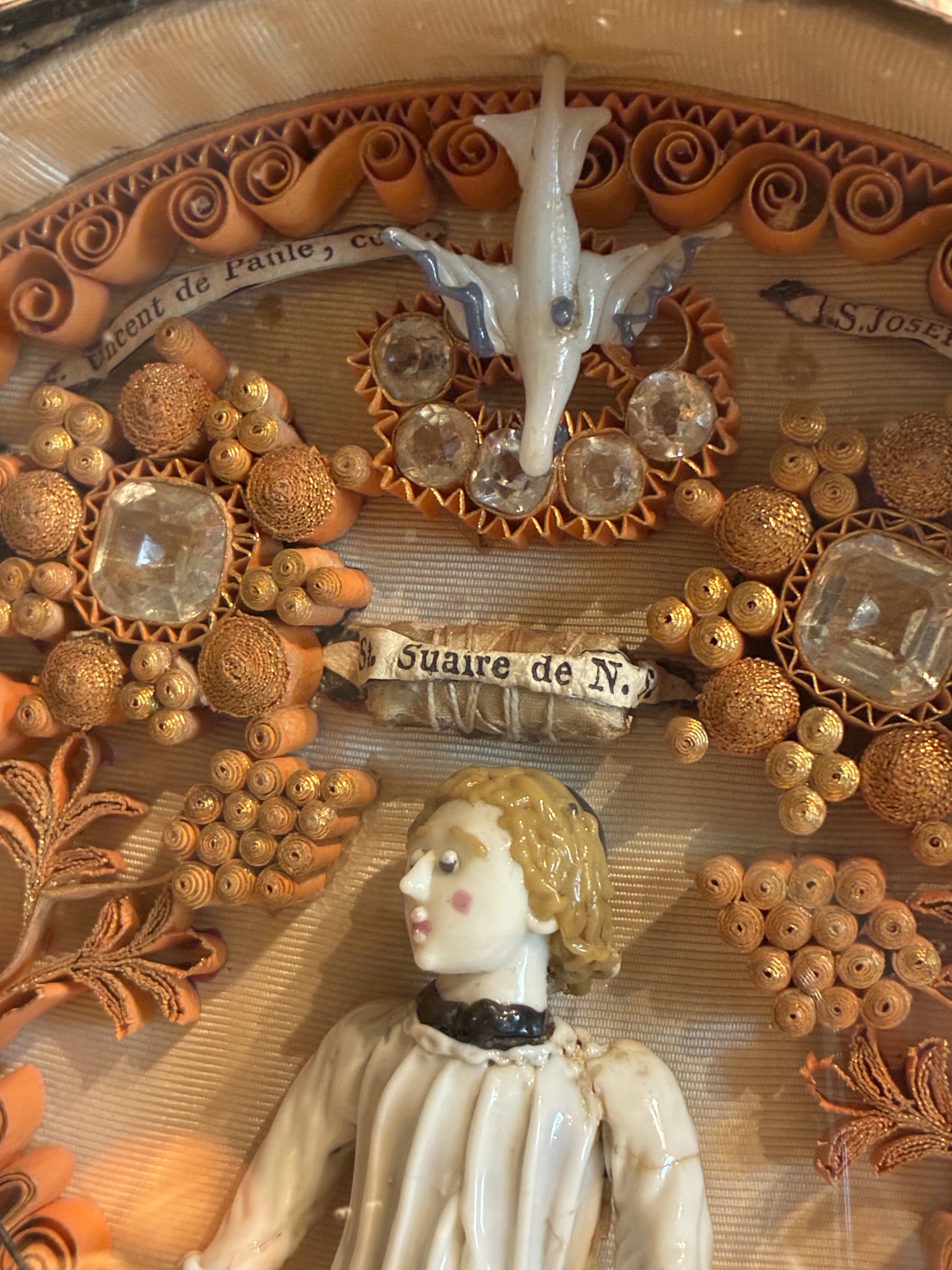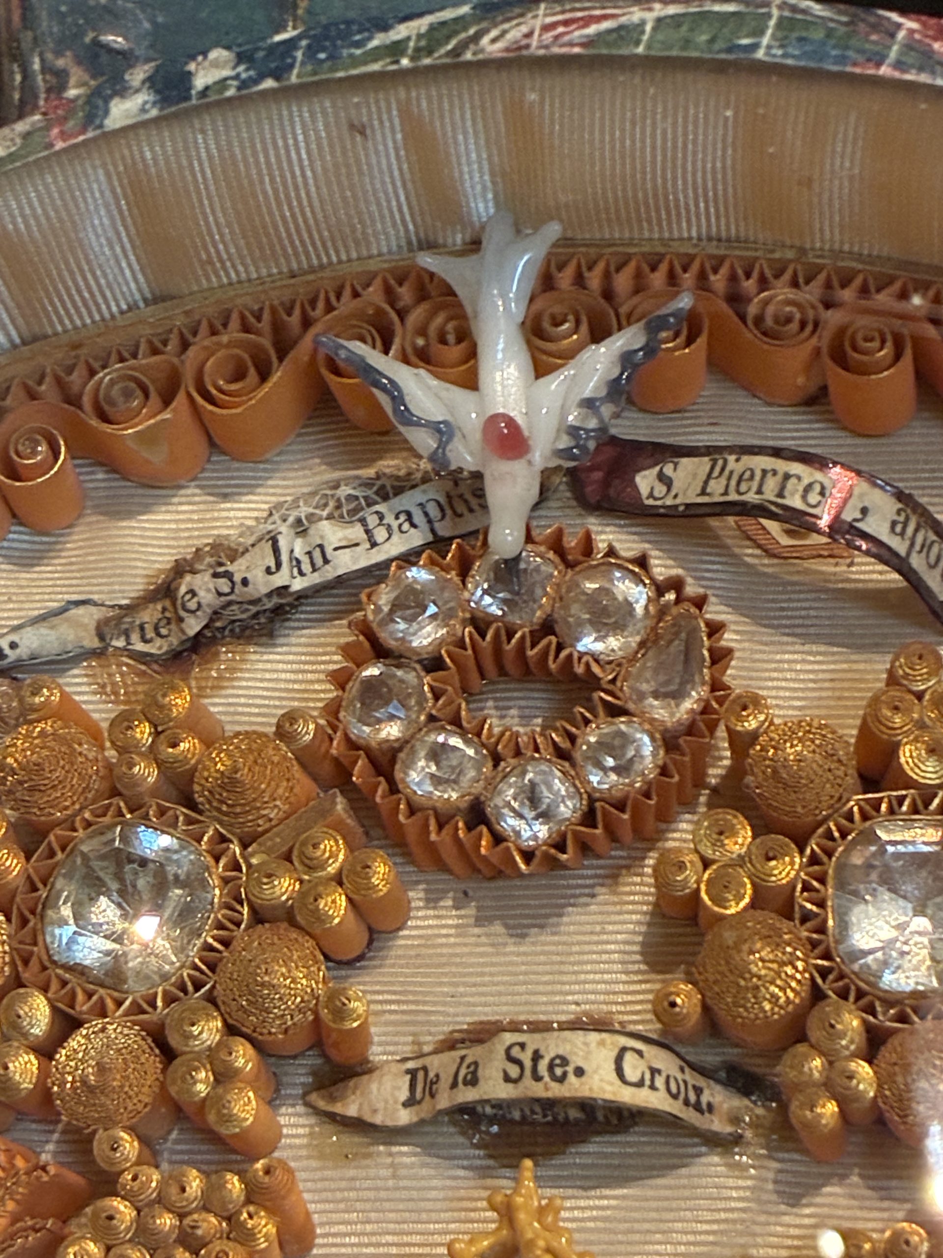 Le décor de paperolles consiste en un enroulement complexe de fines bandes de papier doré ou coloré, collées par l’arête sur le support pour former des volutes et des motifs végétaux en relief. Cette technique minutieuse permet de créer des architectures de papier imitant l’orfèvrerie la plus fine. Au sommet des compositions, on observe la colombe du Saint-Esprit rayonnante au-dessus des scènes sacrées.