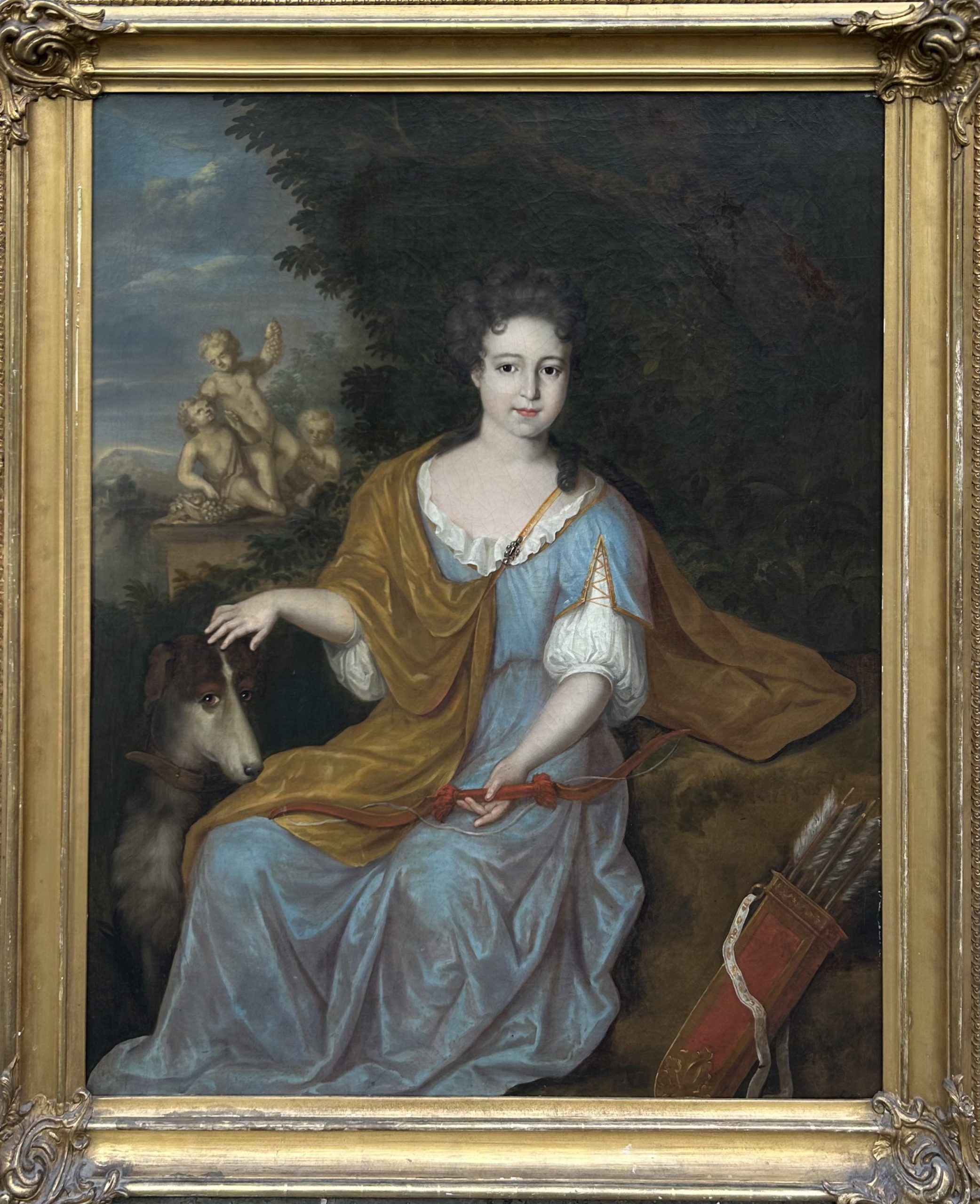 Elle est ici figurée assise dans un paysage, reprenant la pose caractéristique de Diane chasseresse reposant sa main sur la tête d’un chien de chasse alors que ses attributs sont disposés à ses côtés avec un carquois rempli de flèches. Ce tableau s’inscrit dans la tradition iconographique du portrait historié consistant à représenter des personnalités contemporaines sous les traits de divinités de la mythologie classique afin de leur prêter des vertus morales ou des qualités symboliques attachées à la déesse choisie. La représentation en Diane incarne ici non seulement la beauté et la jeunesse éternelle mais également des valeurs de chasteté et de noblesse liées à l’exercice de la chasse privilège aristocratique.