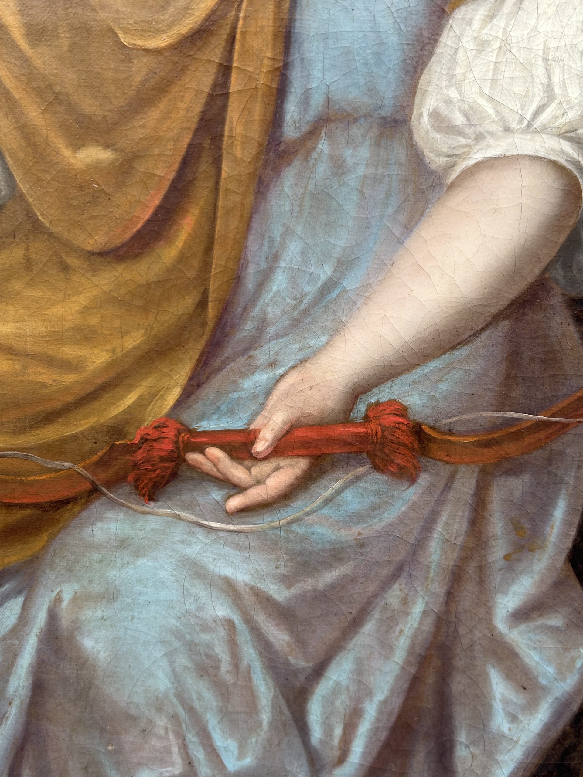 Ce magnifique portrait d’une dame de qualité datant dans le style du XVIIIe siècle. Une jeune femme vêtue d’une somptueuse robe bleu azur rehaussés par un large manteau doré, tandis qu’elle arbore une coiffure à la Fontange très en vogue à la cour.