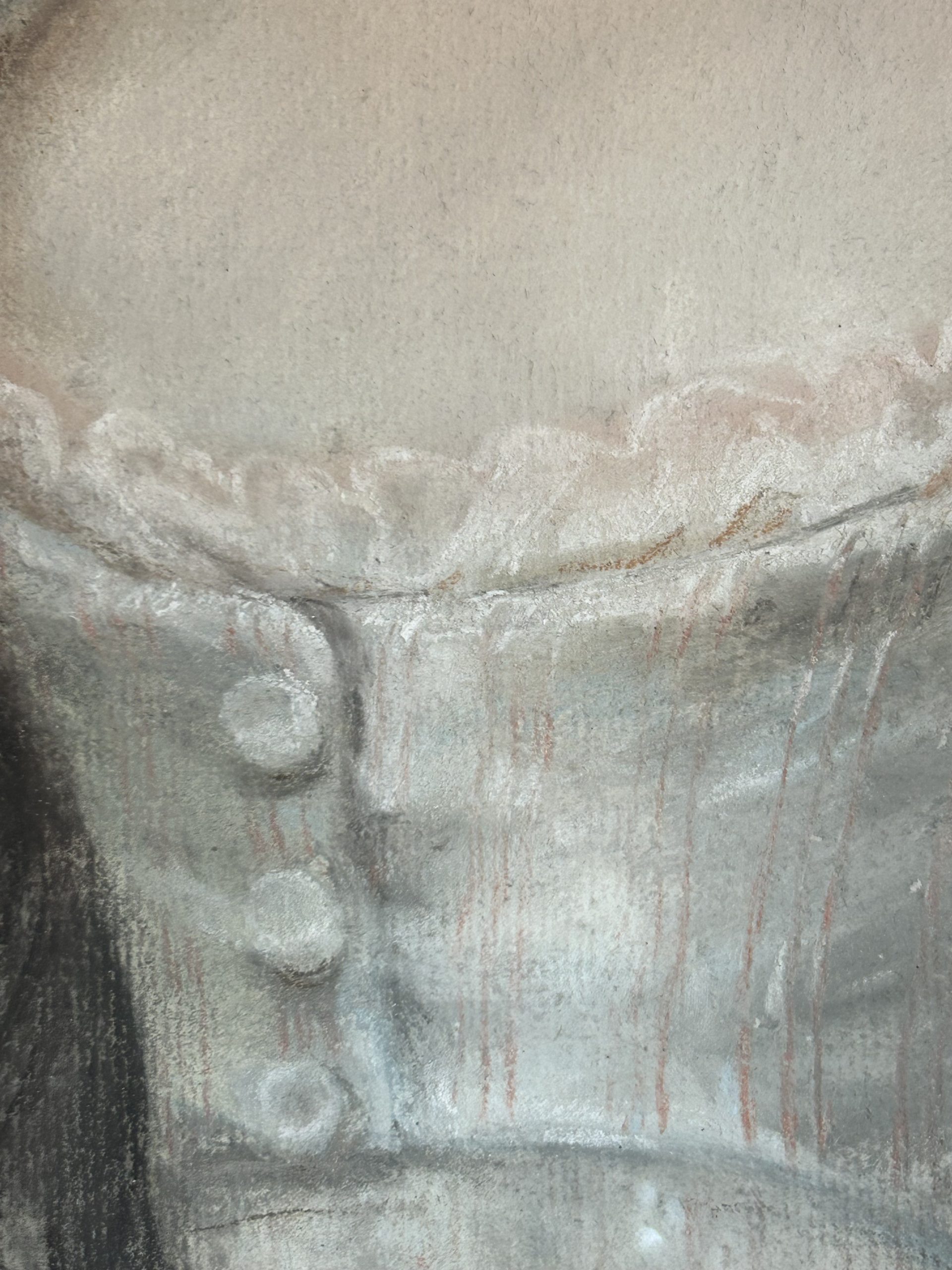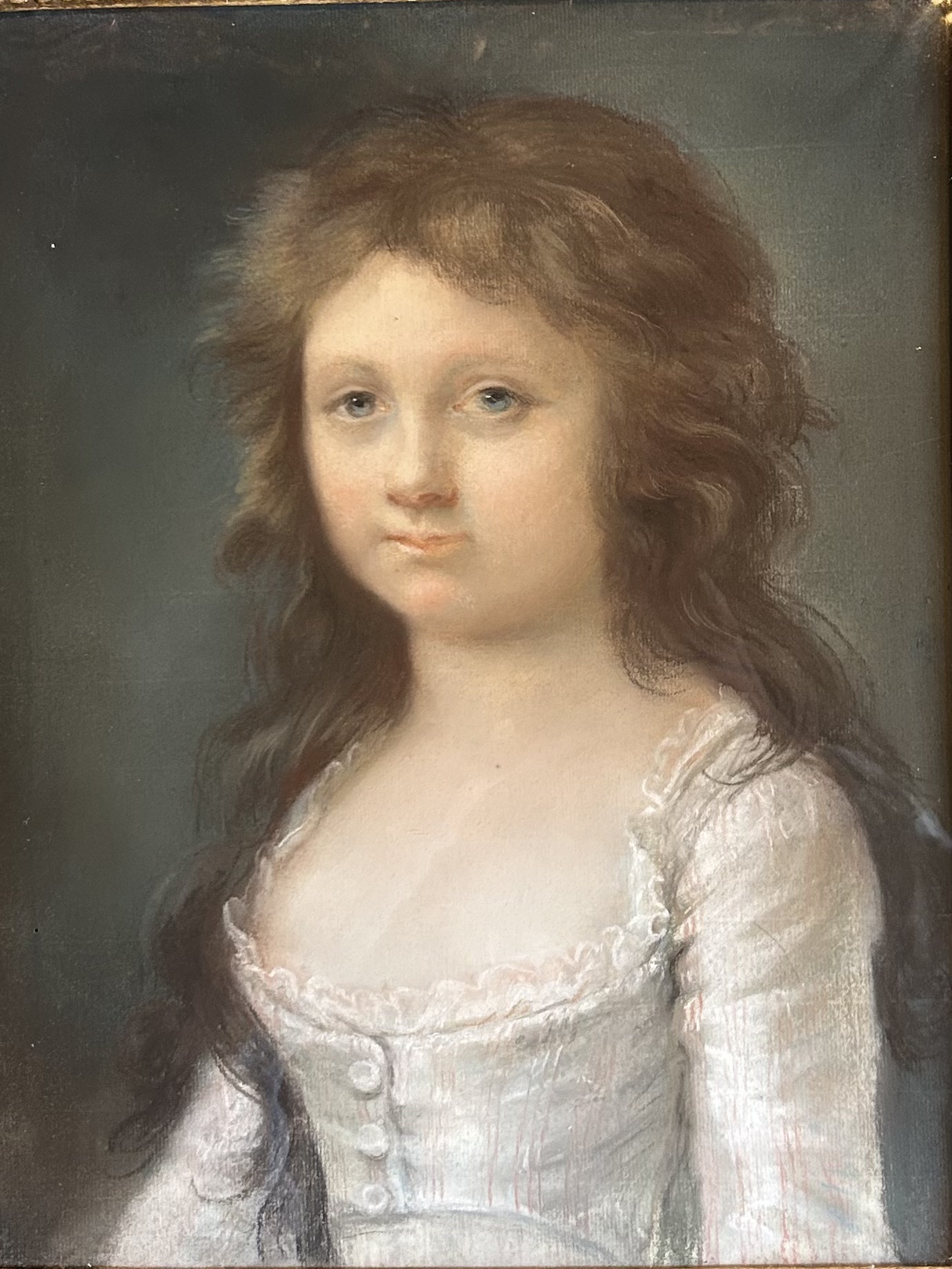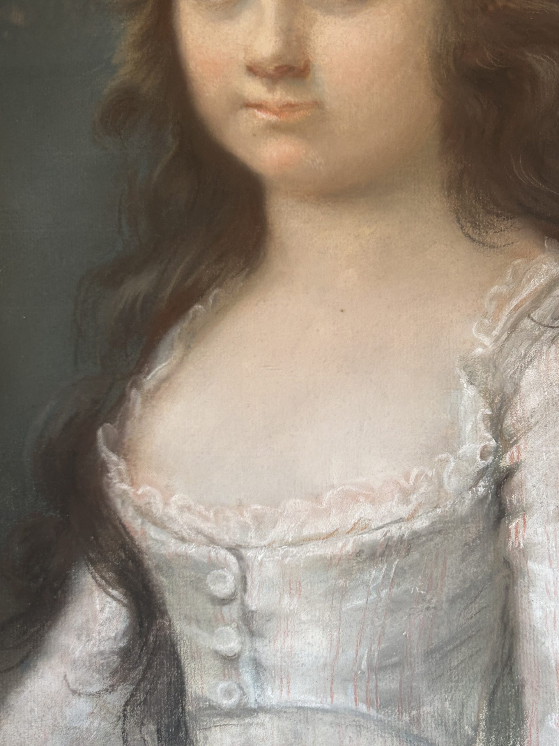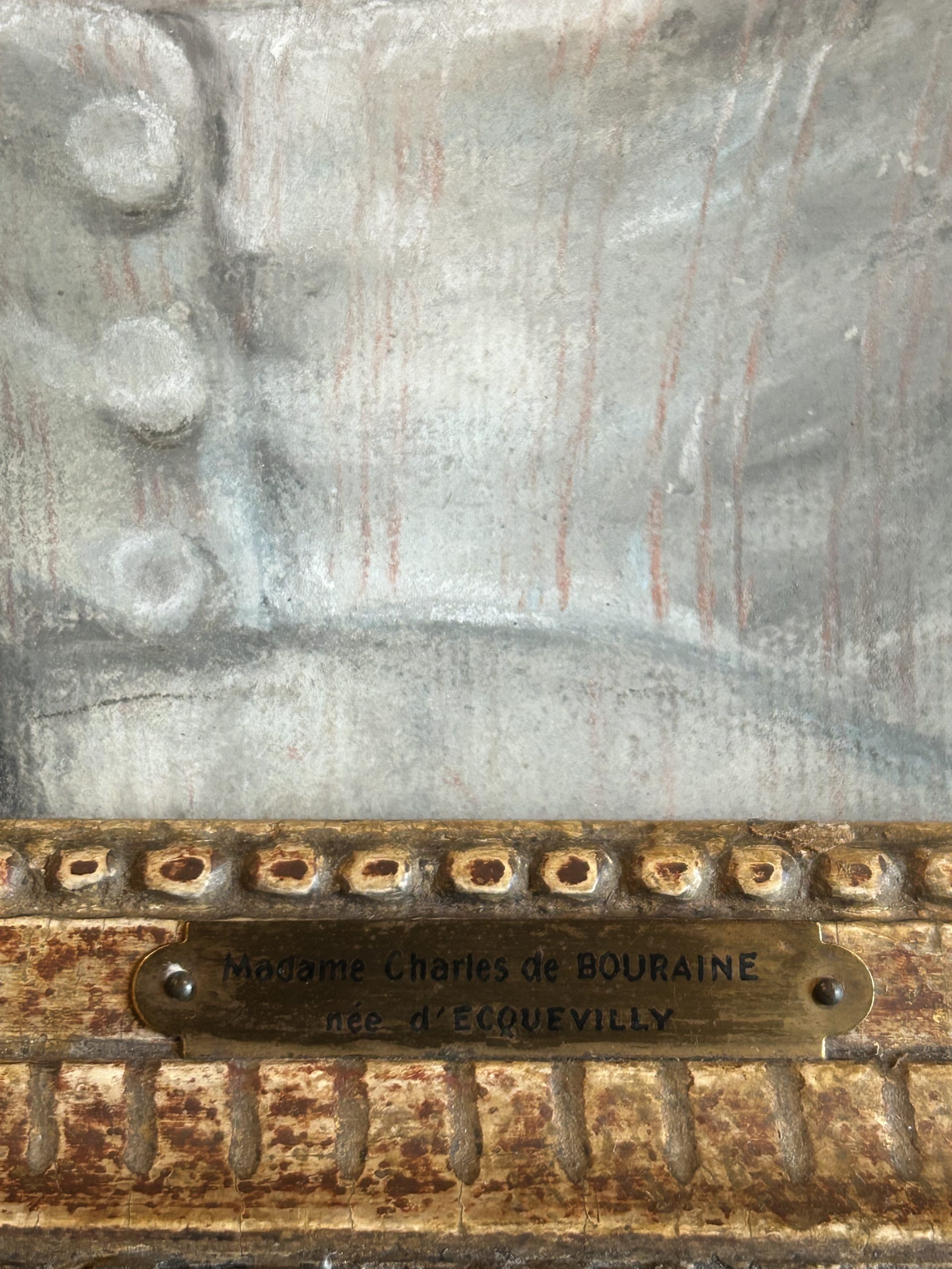 Portrait au pastel daté de l’année 1794 capture avec une grande sensibilité une jeune fille de 10 ans. Il s’agit de la future Madame Charles de Bouraine née d’Ecquevilly. Représentée ici dans sa tendre enfance, la fillette pose en buste face au spectateur son regard bleu empreint de douceur et d’une légère mélancolie. Elle est coiffée au naturel dans un volume désordonné typique de la mode de la fin du XVIIIe siècle. Elle est vêtue d’une robe de mousseline blanche simple et purifiée reflétant le changement des mœurs et du goût vestimentaire post-révolutionnaire.