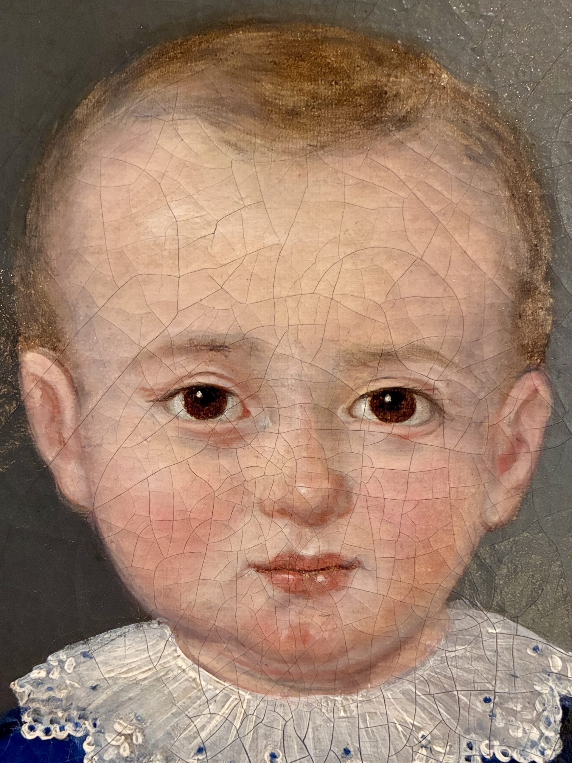 Portrait d’un jeune enfant, vêtu d’une robe bleue ornée de dentelle blanche, tenant un petit chien.