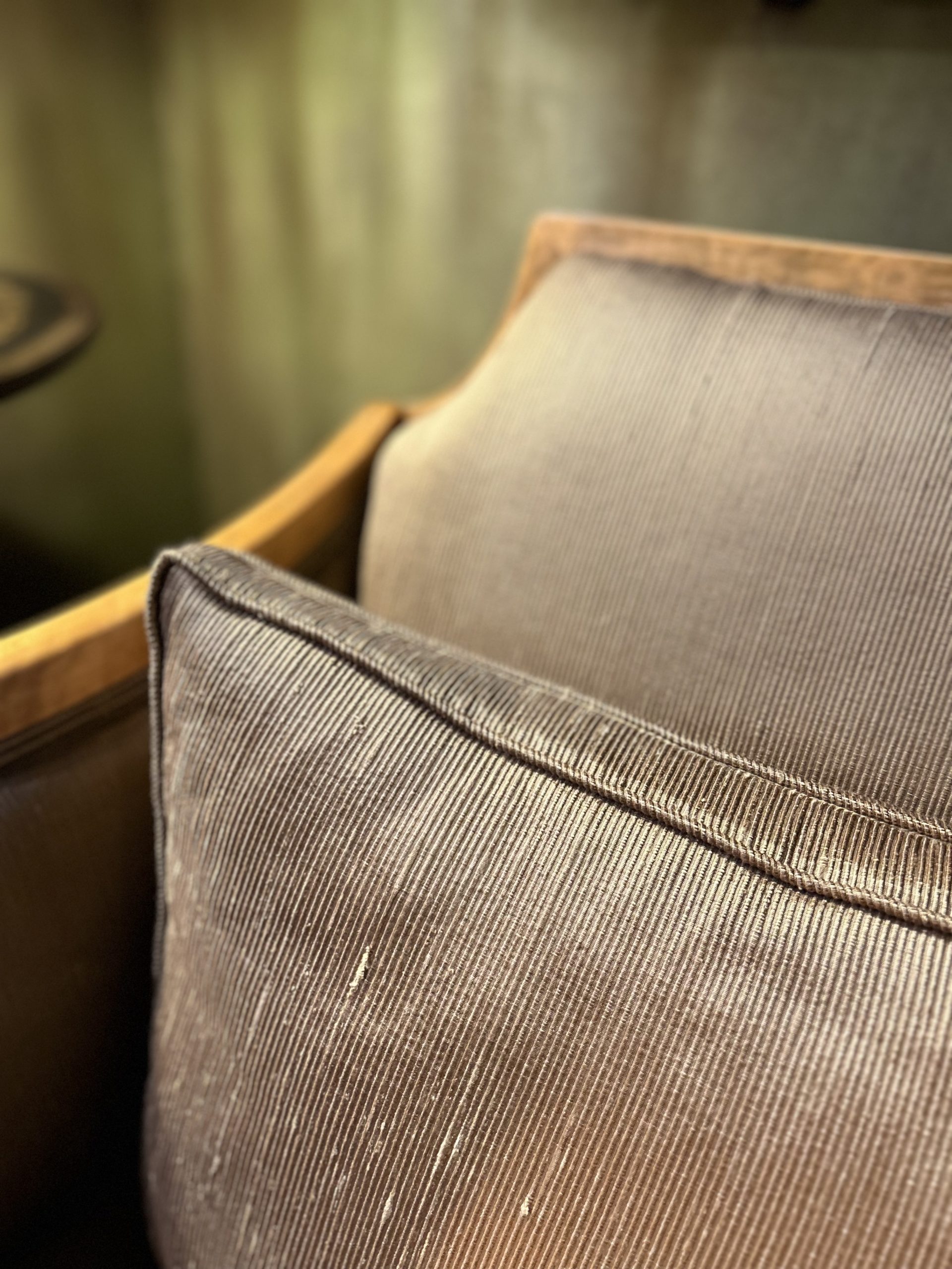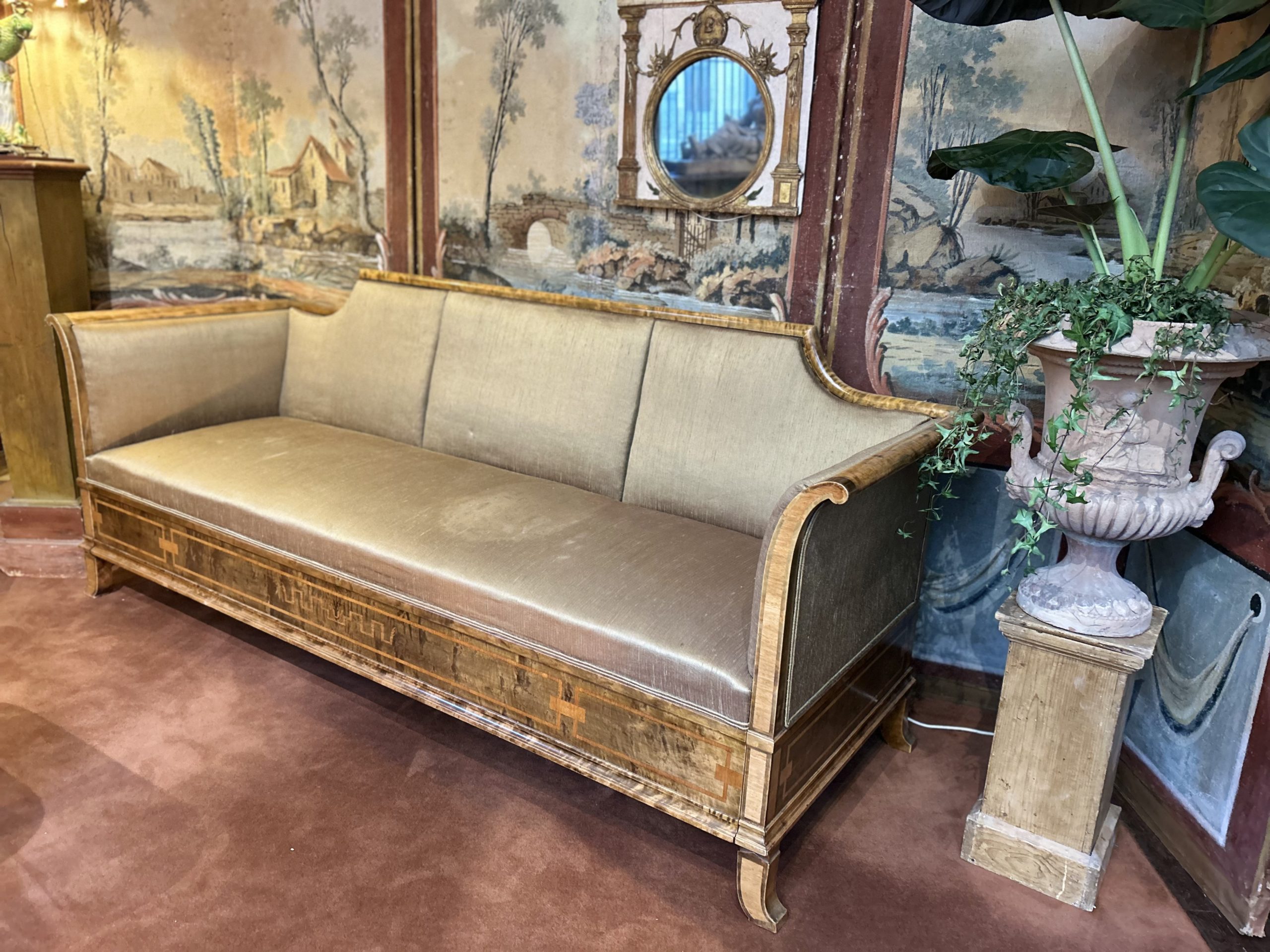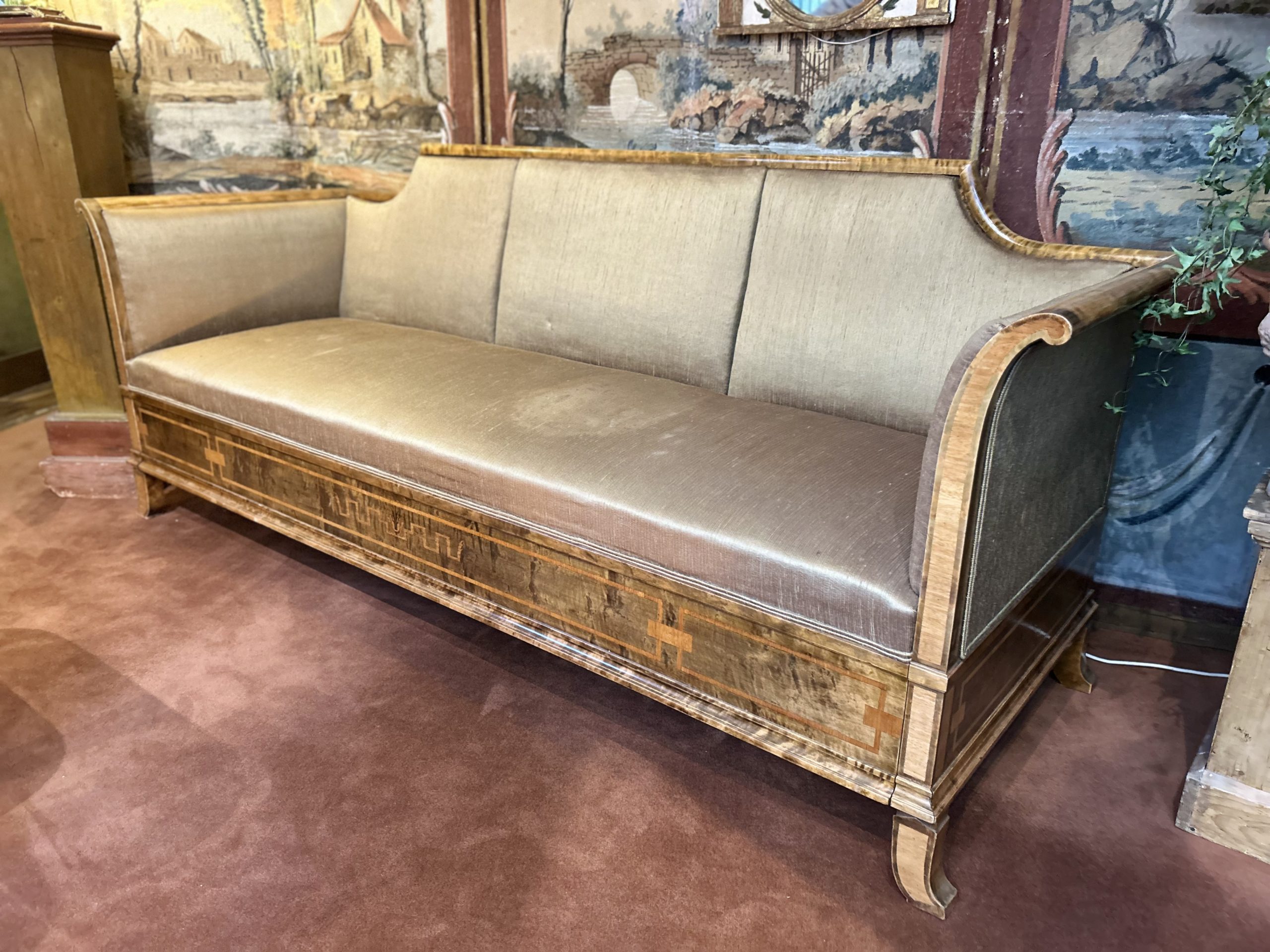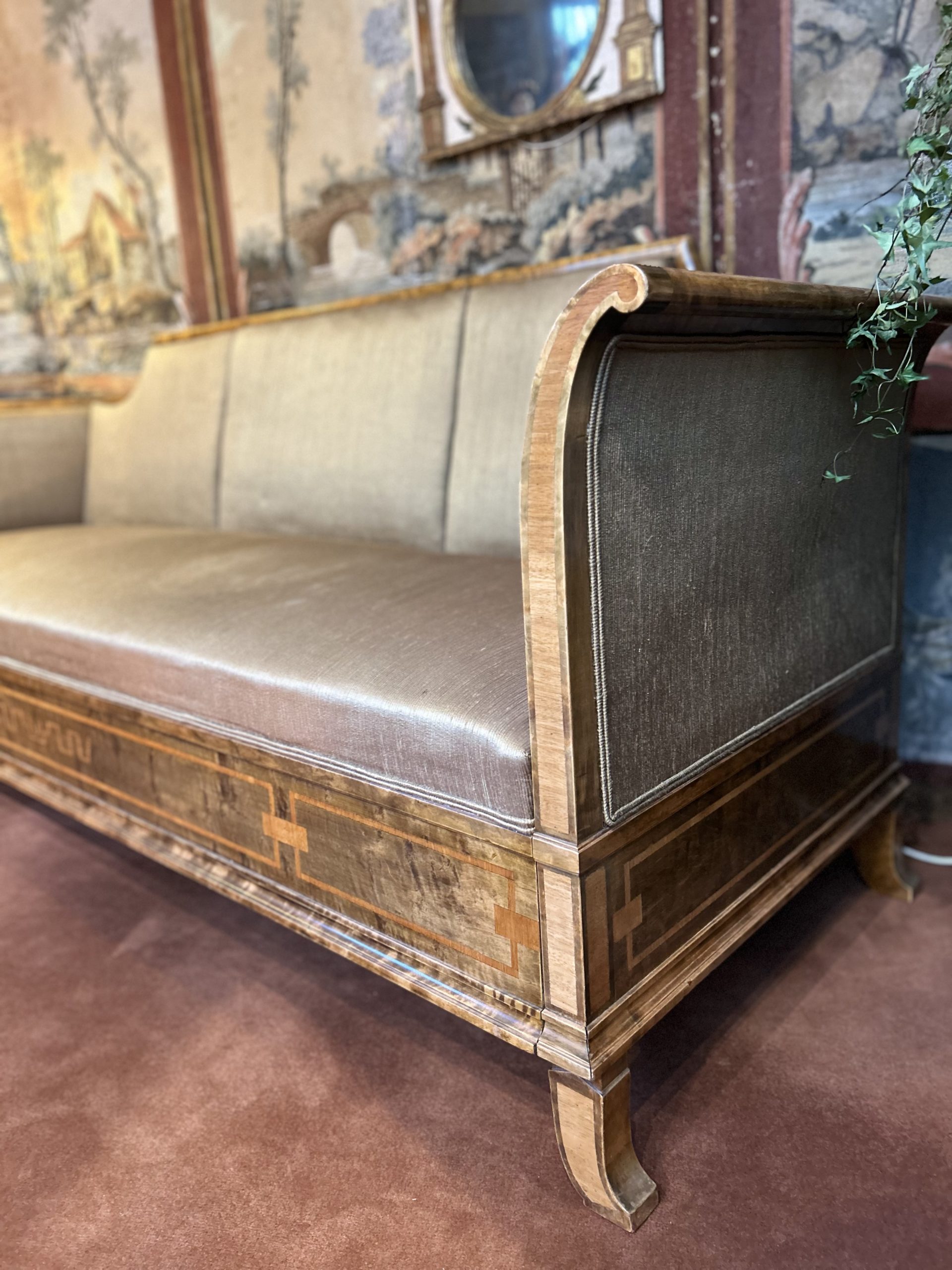 Le canapé et les fauteuils présentent une structure en bois finement travaillé, reposant sur des pieds légèrement galbés. Les lignes enveloppantes des accoudoirs et du dossier offrent une silhouette élégante et équilibrée. La ceinture du meuble est ornée d’un décor marqueté discret qui souligne la qualité d’ébénisterie et le soin apporté aux détails.