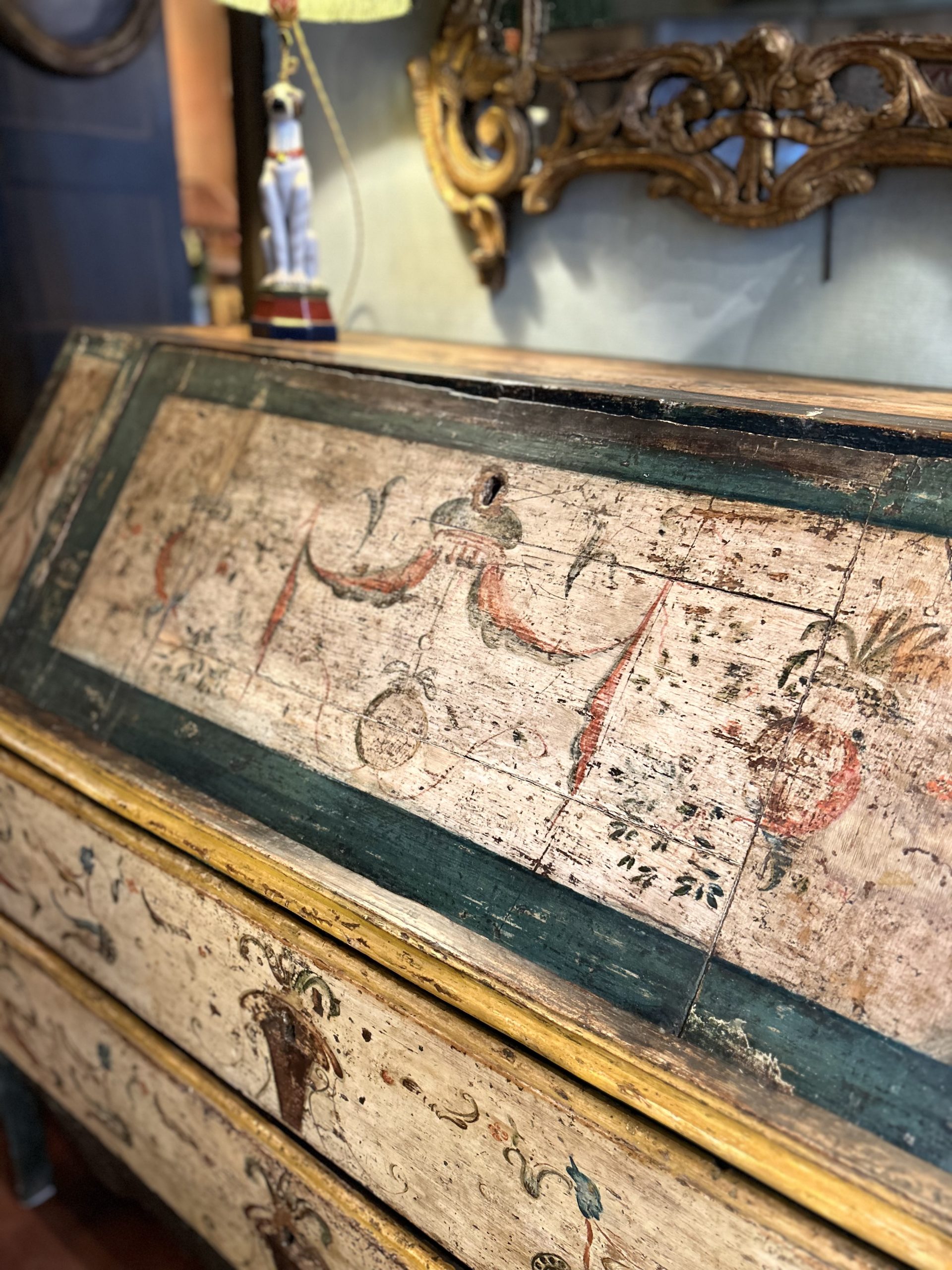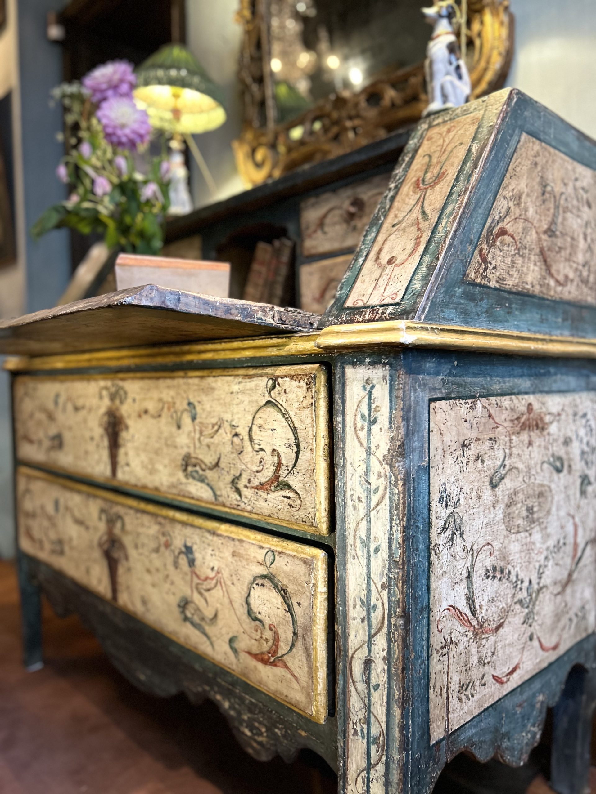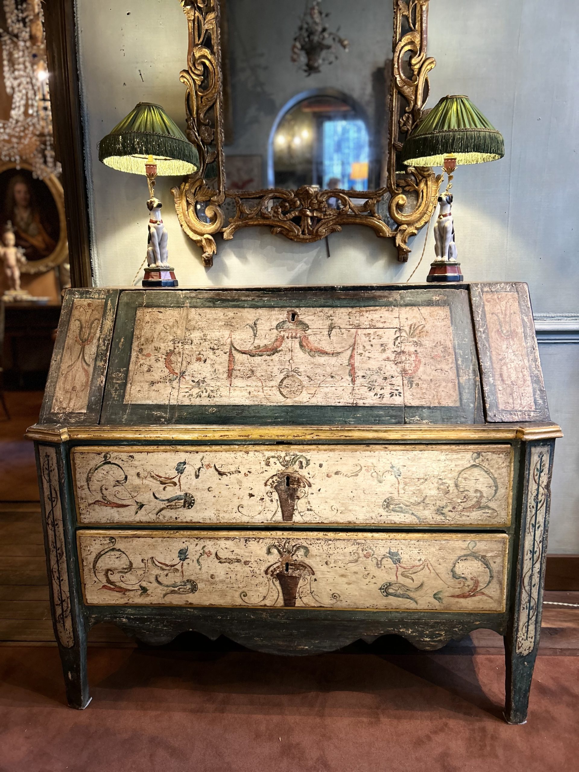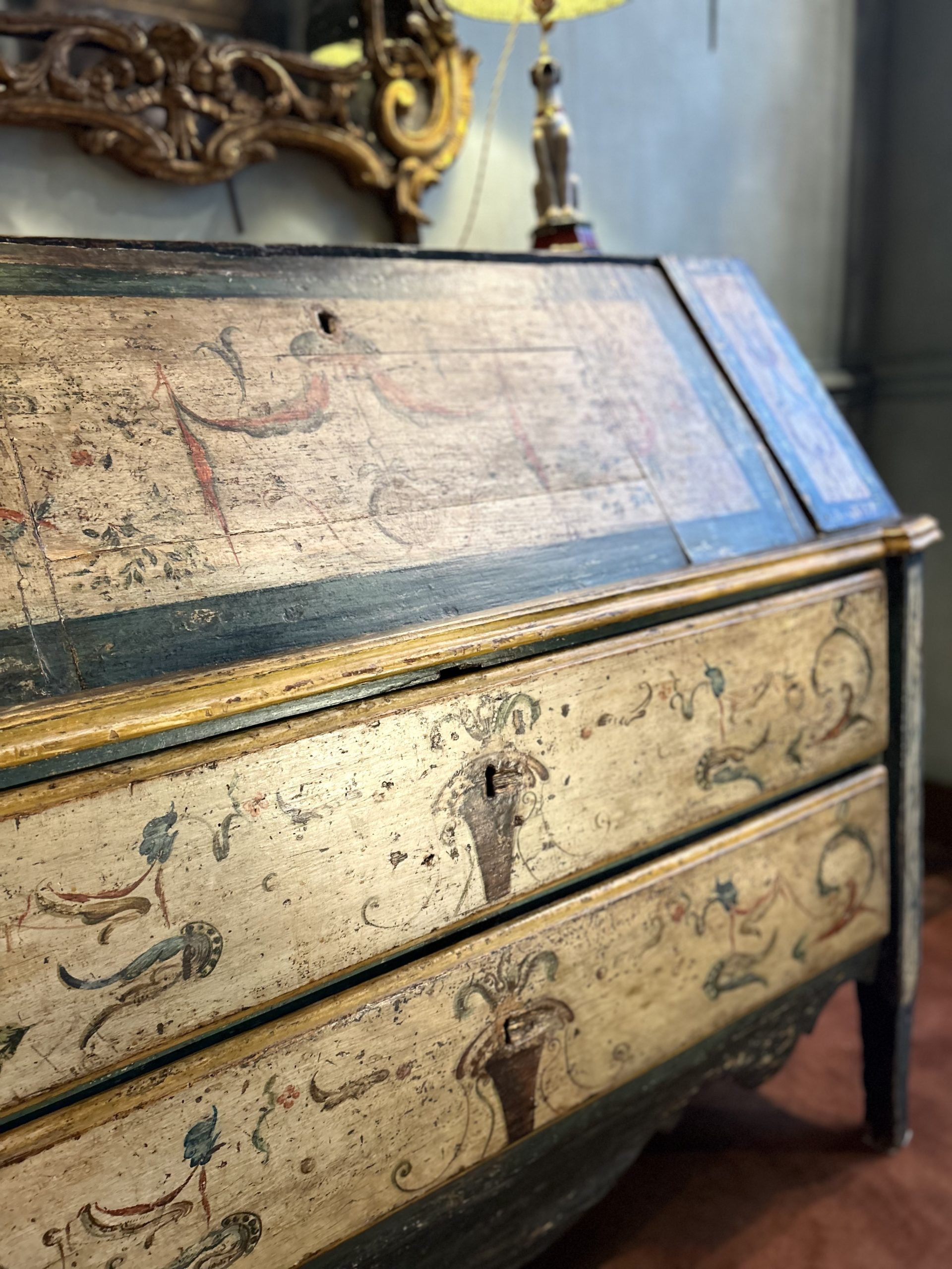 Scriban en bois polychrome aux motifs de rinceaux et fleurs ouvrant sur deux tiroirs et un abattant, quatre petits tiroirs intérieurs, clés.