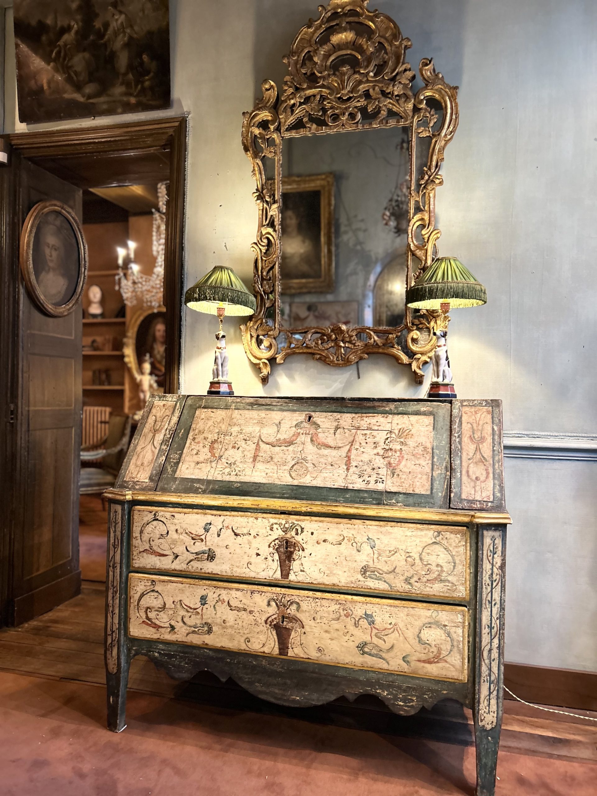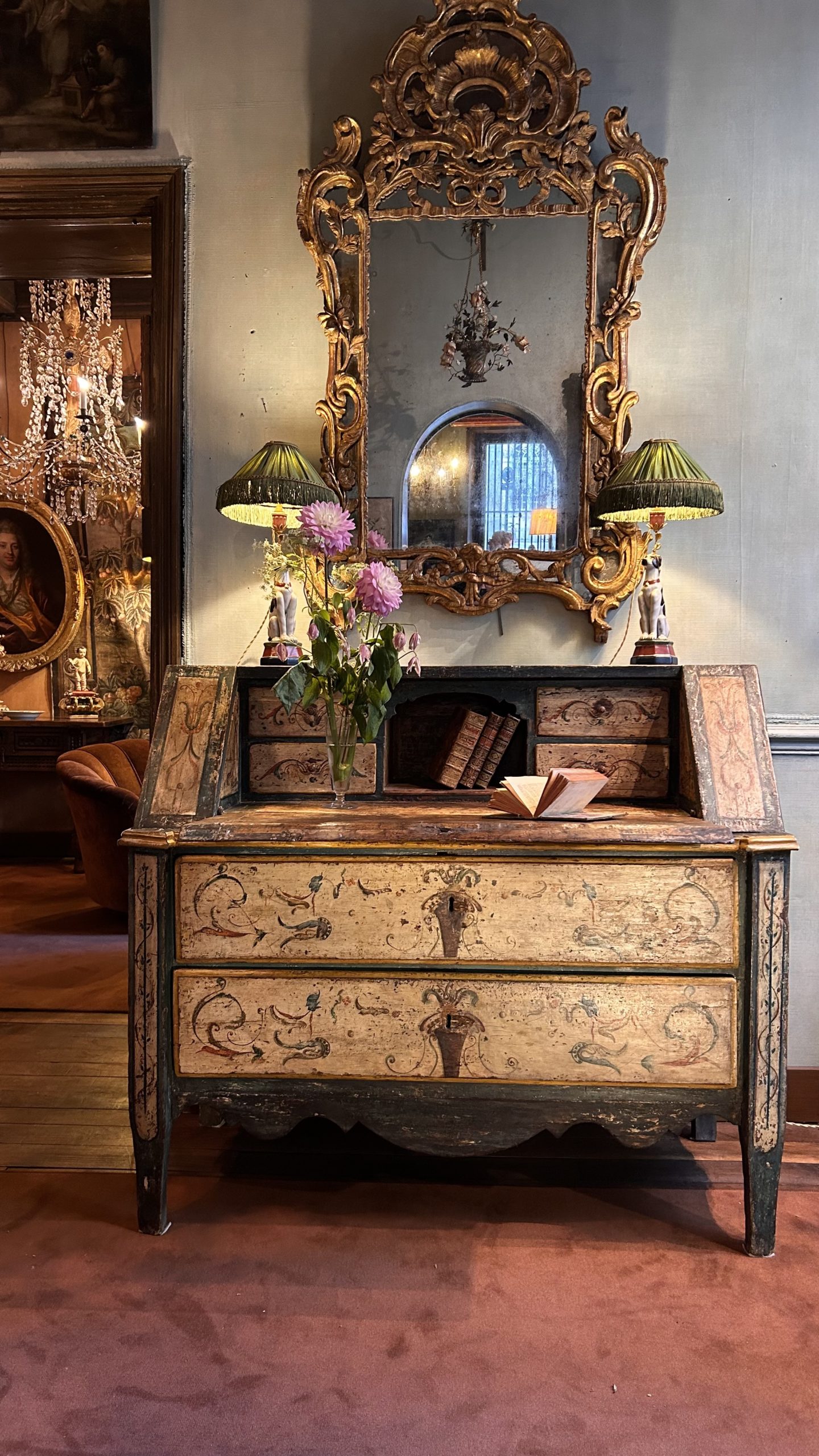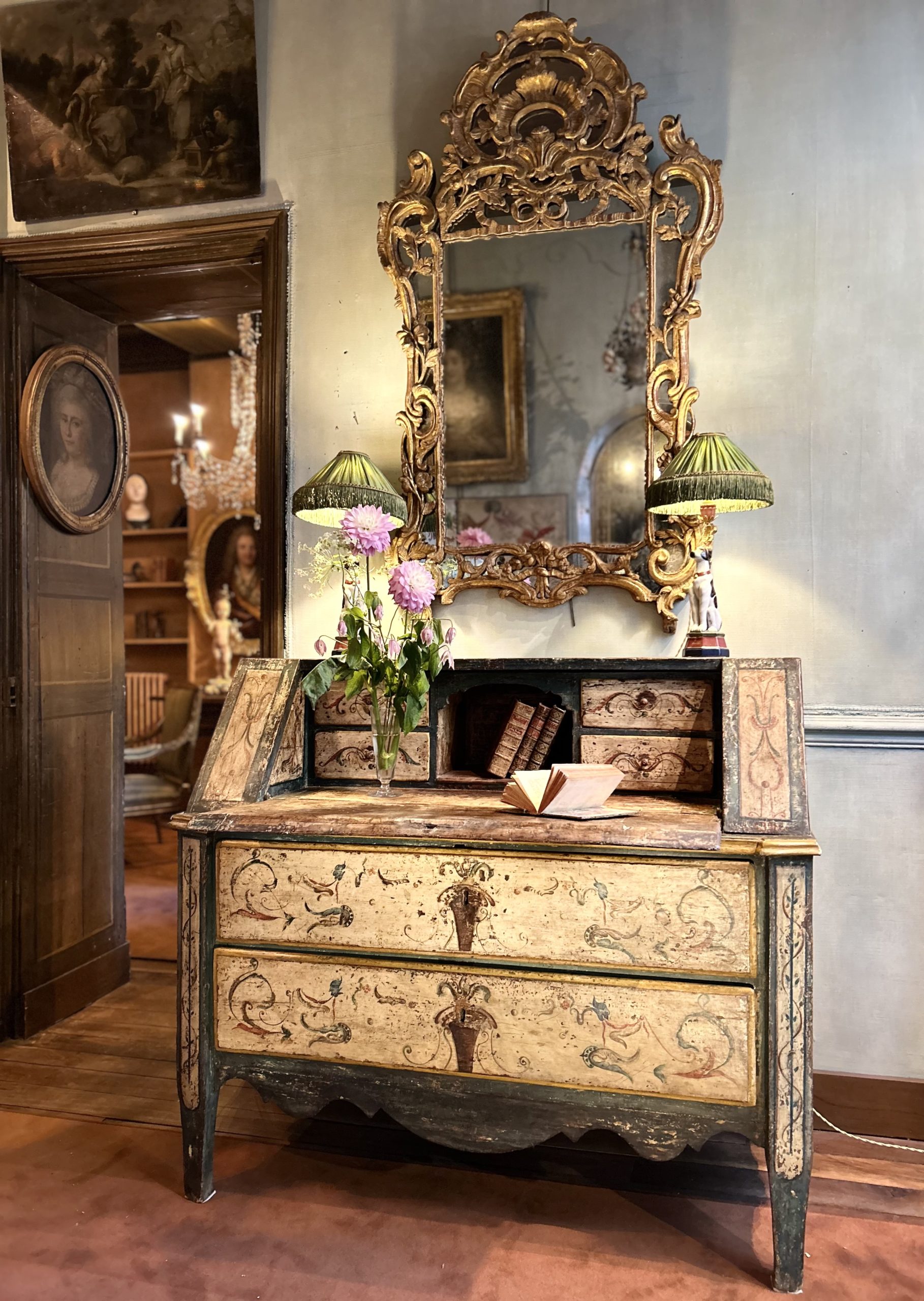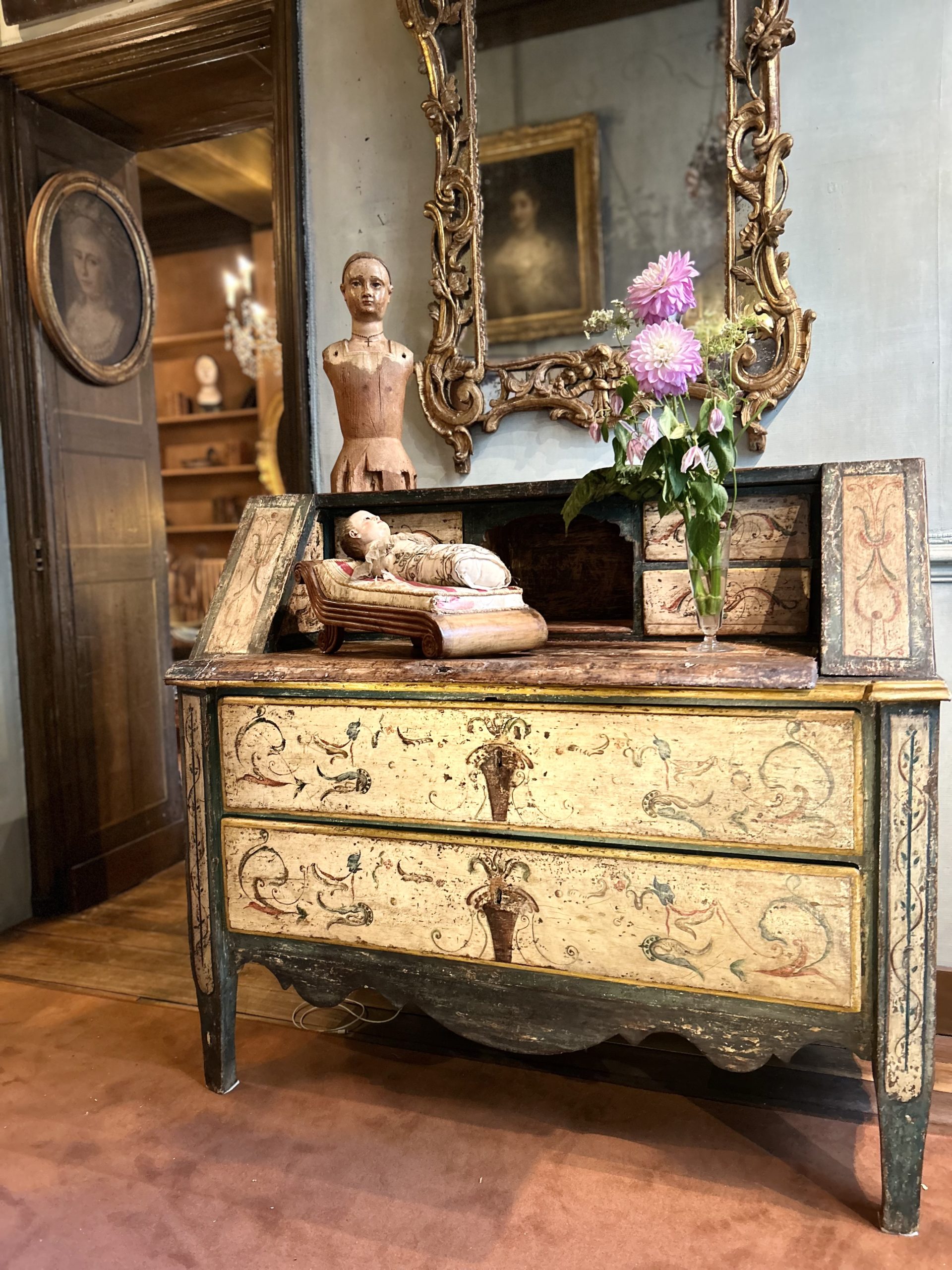 Scriban en bois polychrome aux motifs de rinceaux et fleurs ouvrant sur deux tiroirs et un abattant, quatre petits tiroirs intérieurs, clés.