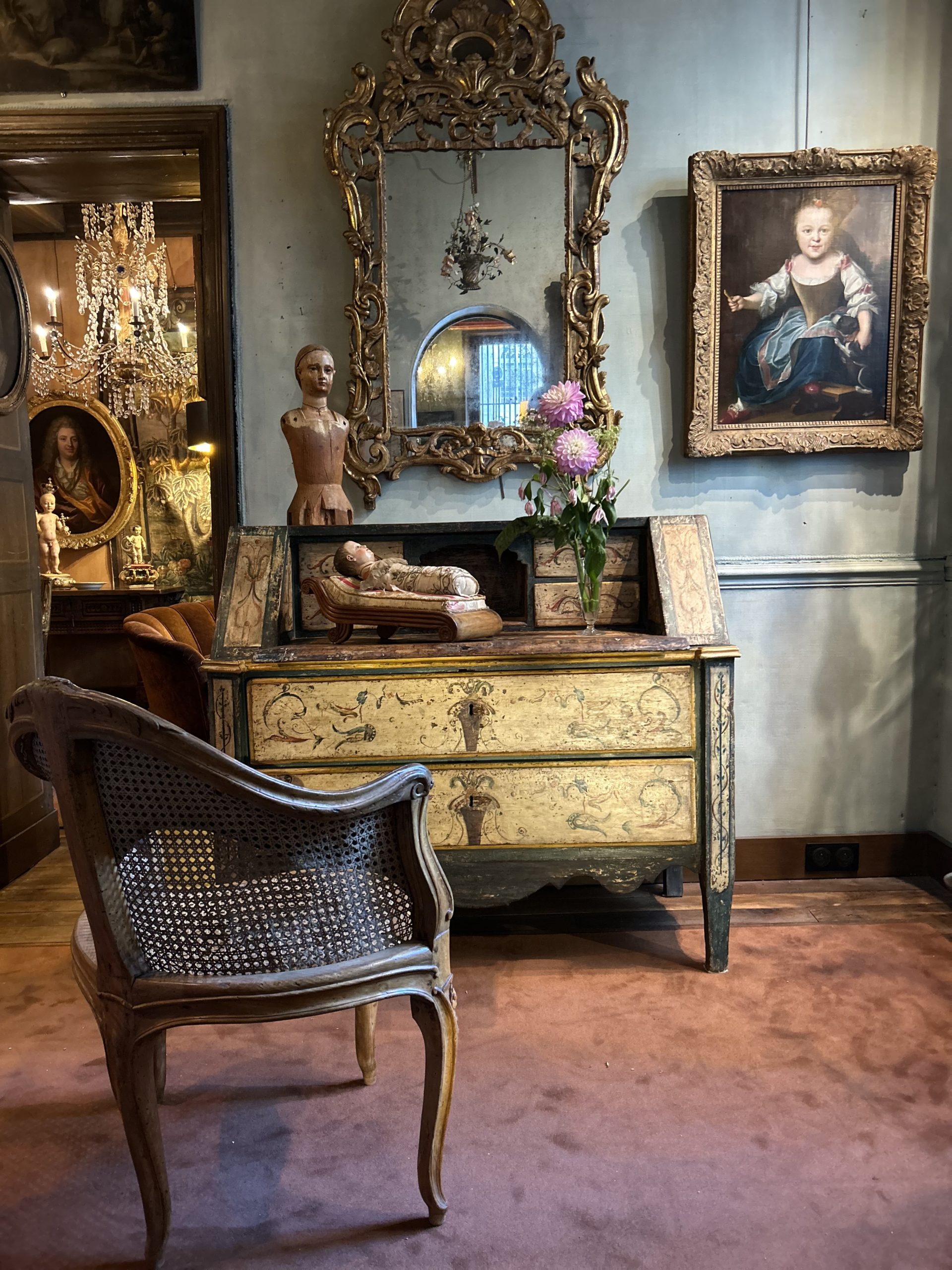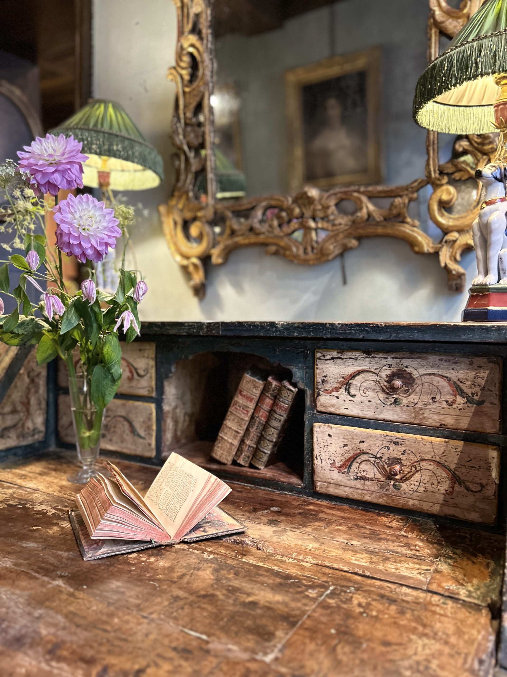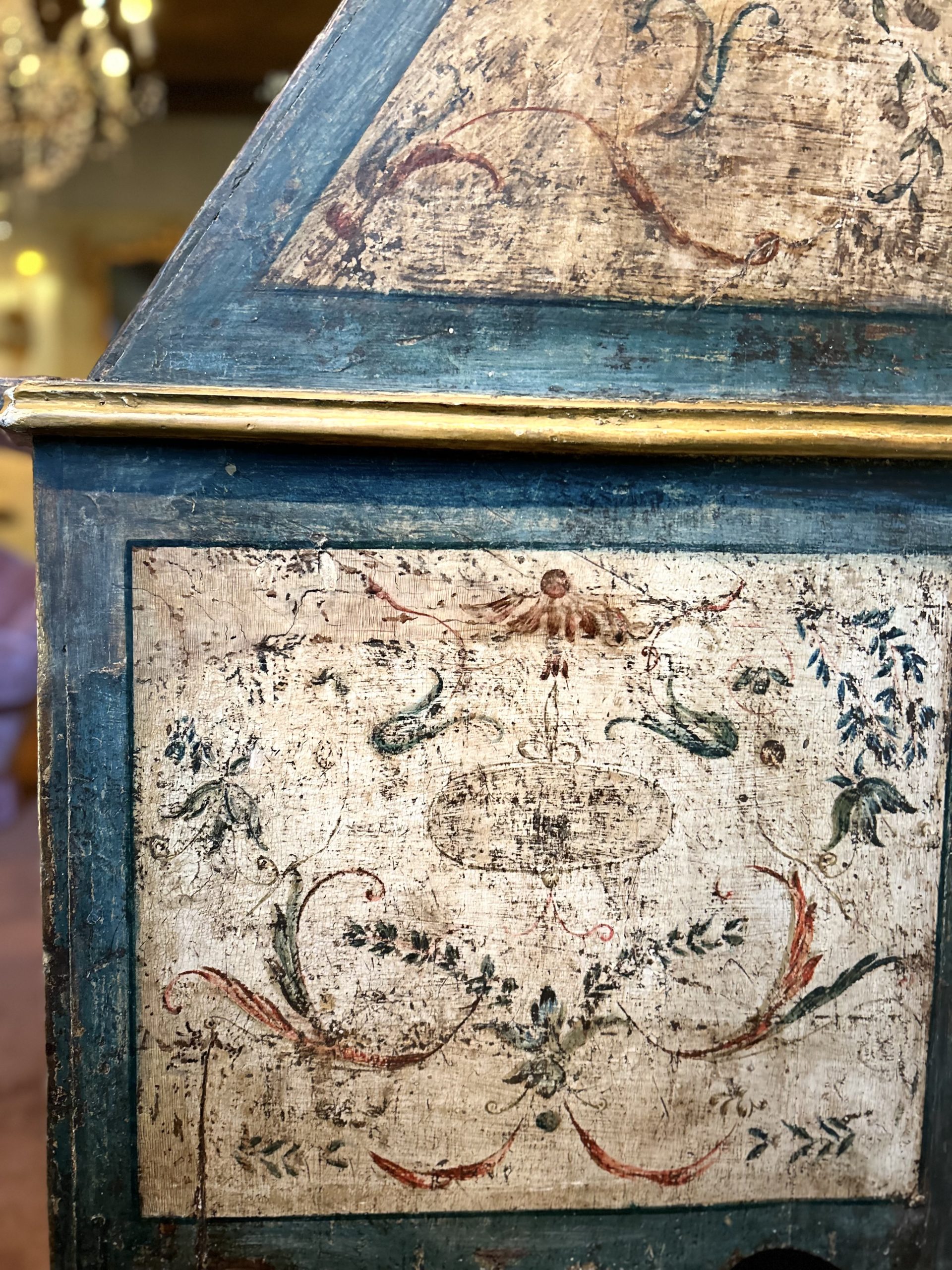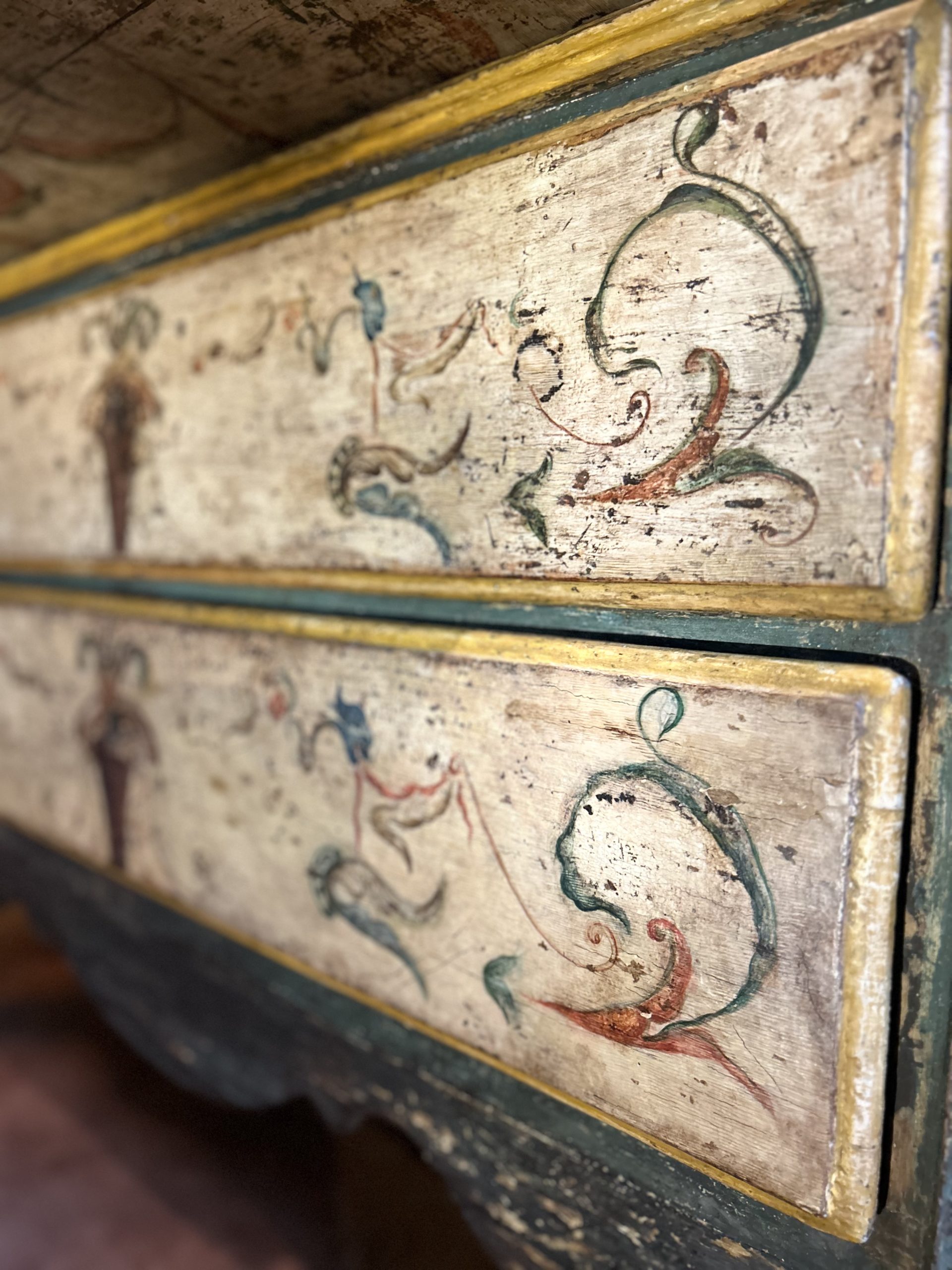 Scriban en bois polychrome aux motifs de rinceaux et fleurs ouvrant sur deux tiroirs et un abattant, quatre petits tiroirs intérieurs, clés.