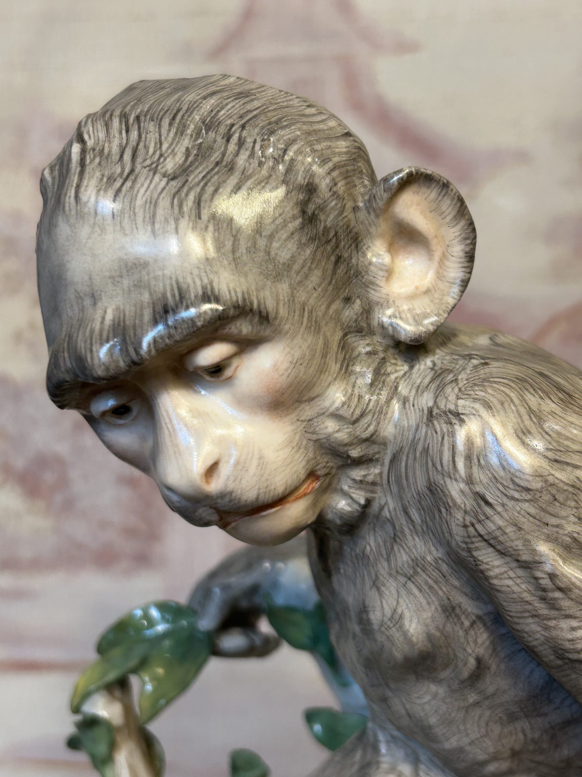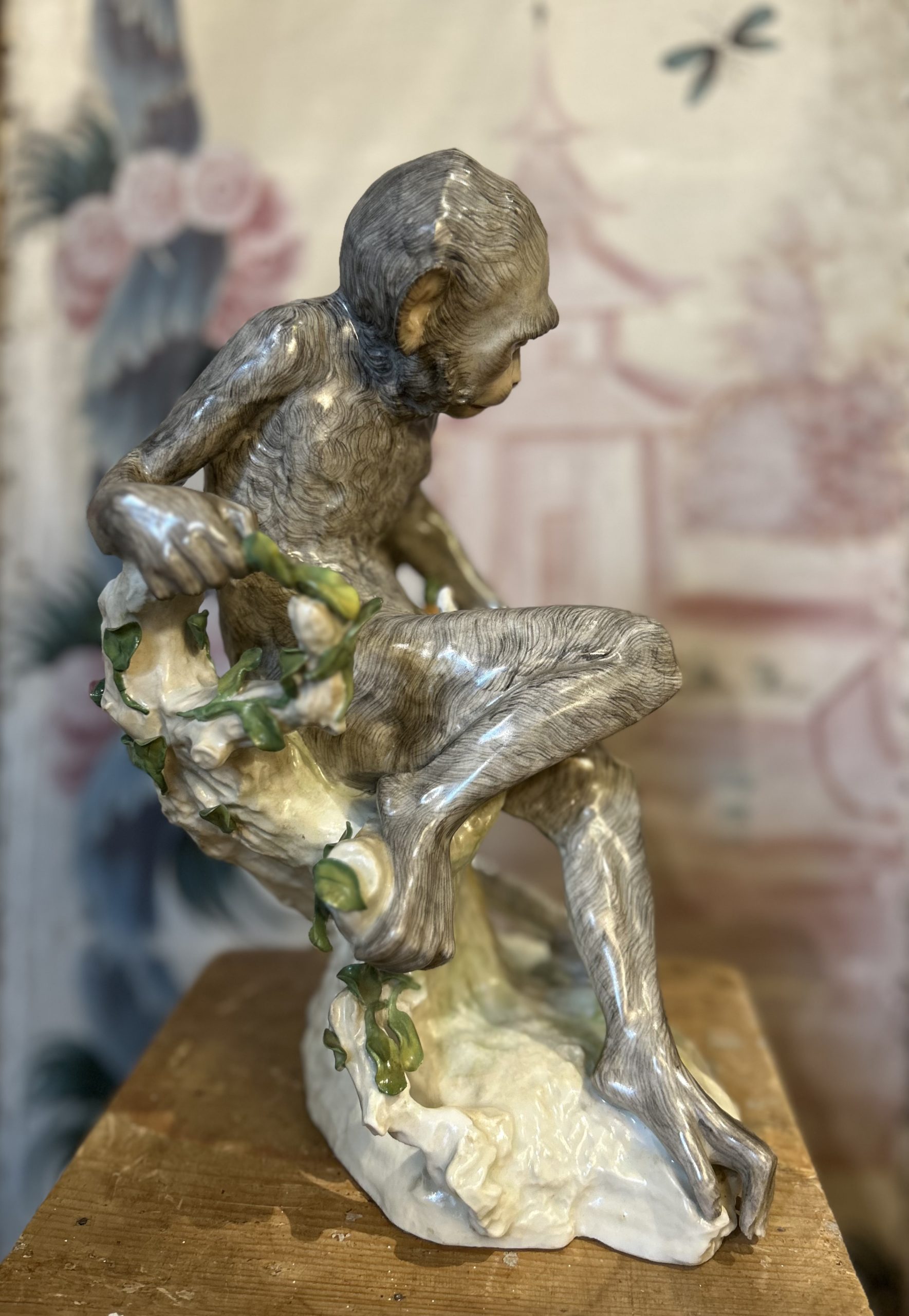 Belle statue en porcelaine de Meissen du XIXe siècle, s’inscrit dans la continuité directe de la grande fascination européenne pour les singeries qui a marqué le XVIIIe siècle et le style Rococo. A cette époque le singe n’est plus seulement un animal exotique rapporté de terres lointaines, mais devient un véritable miroir satirique de la société aristocratique utilisé par les artistes pour parodier les comportements humains avec une ironie.