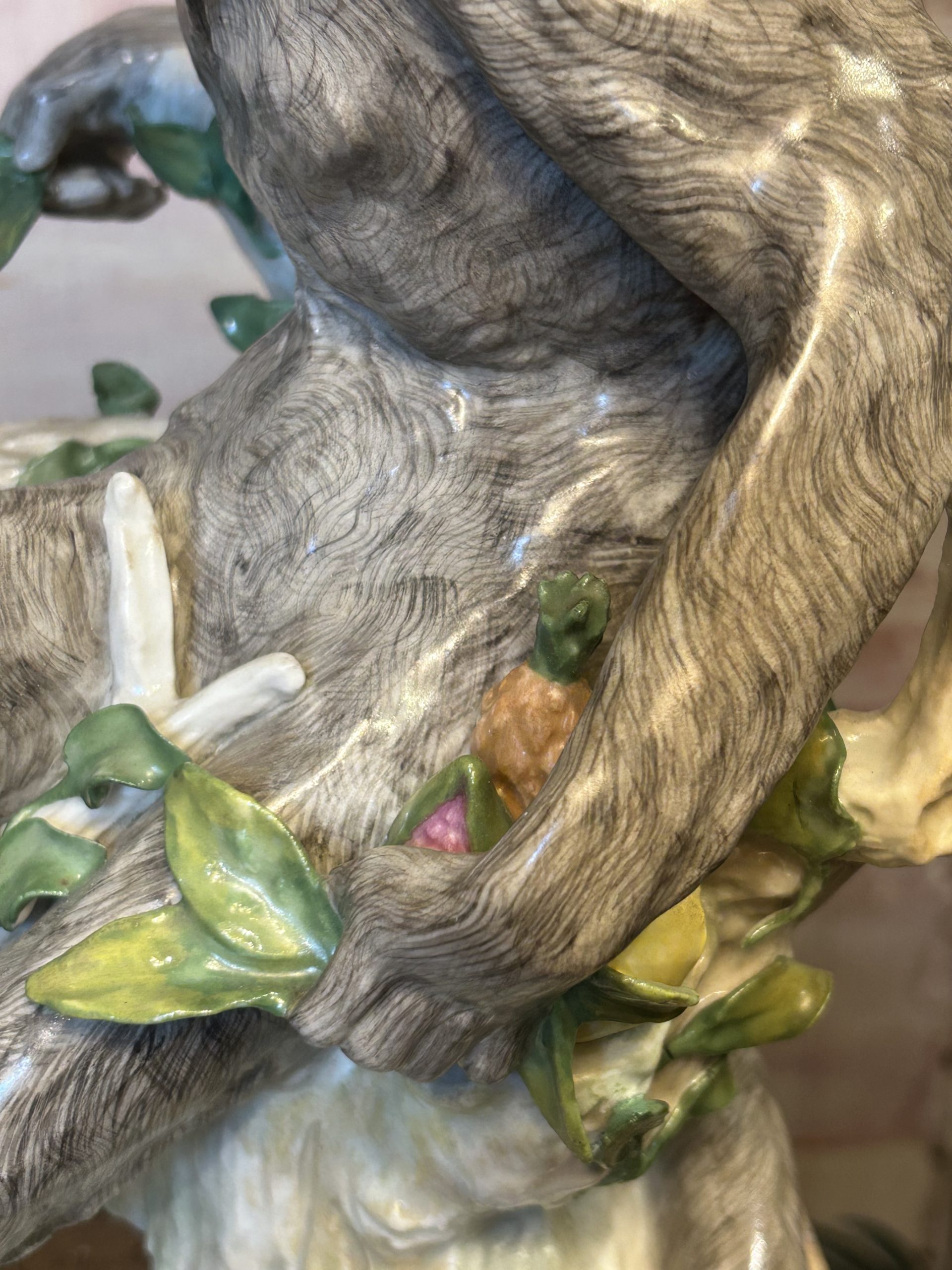 Meissen sous l’influence de sculpteurs de génie ont popularisé ces figures pleines d’esprit souvent représentées en musiciens en magistrats ou en courtisans poudrés pour moquer les vanités du siècle des Lumières. La présence de ce singe sur sa souche évoque ce goût pour la fantaisie et l’étrange où la nature sauvage vient s’inviter avec élégance dans l’intimité des salons.