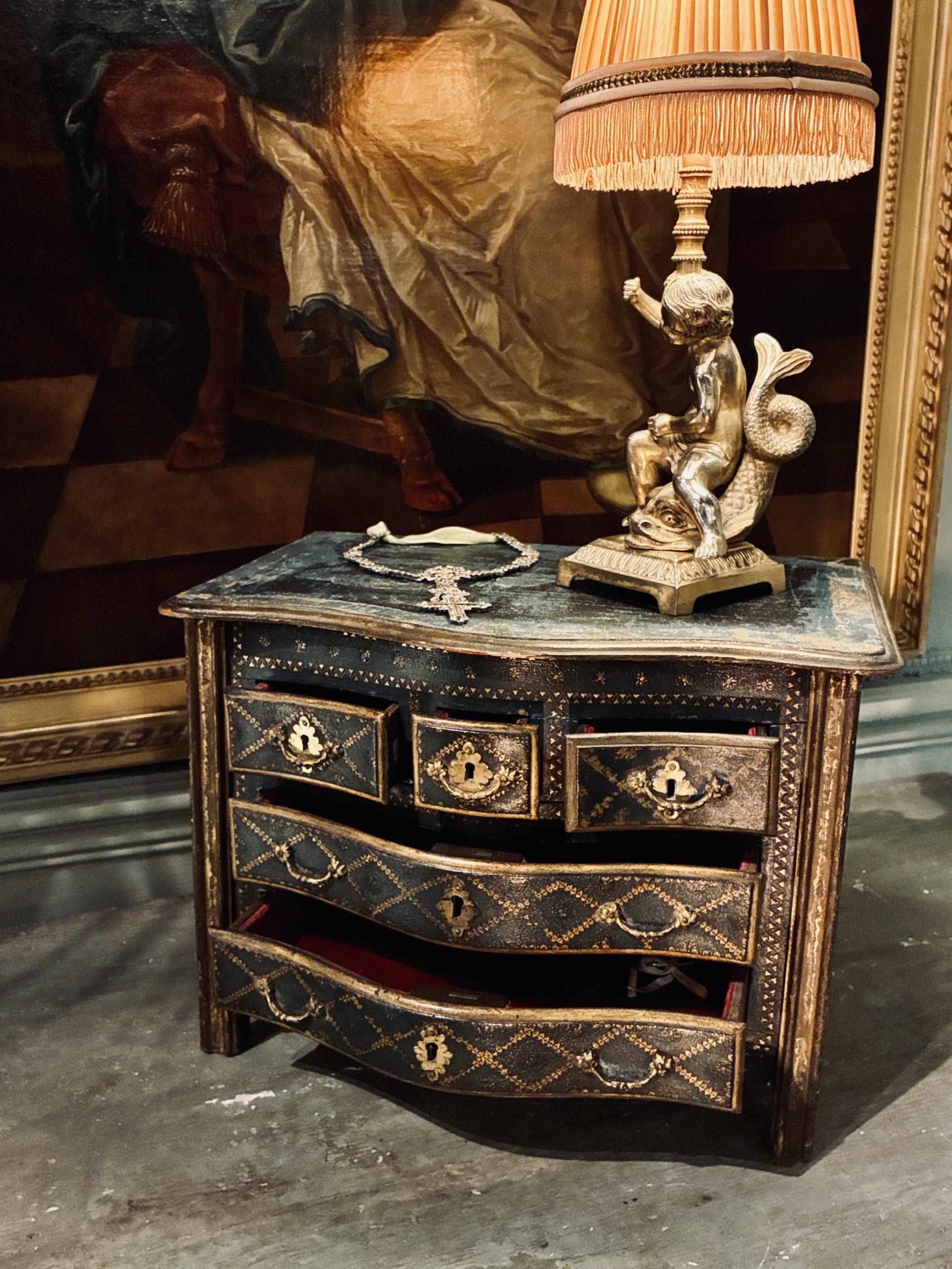 Mastery chest transformed in a jewelry box in gilded polychrome wood opening on 5 velvet lined drawers inside, locks and handles in gilded metal.