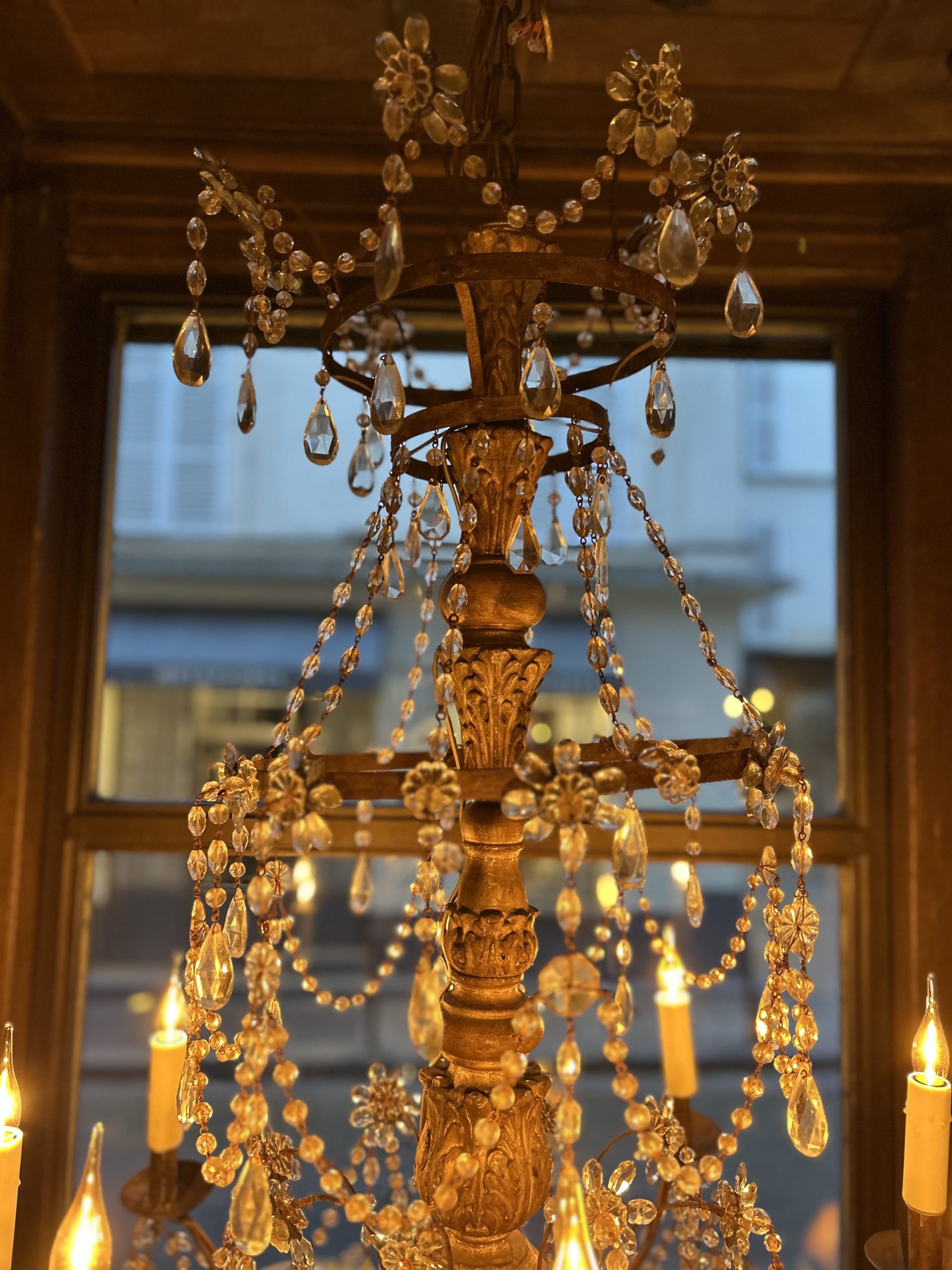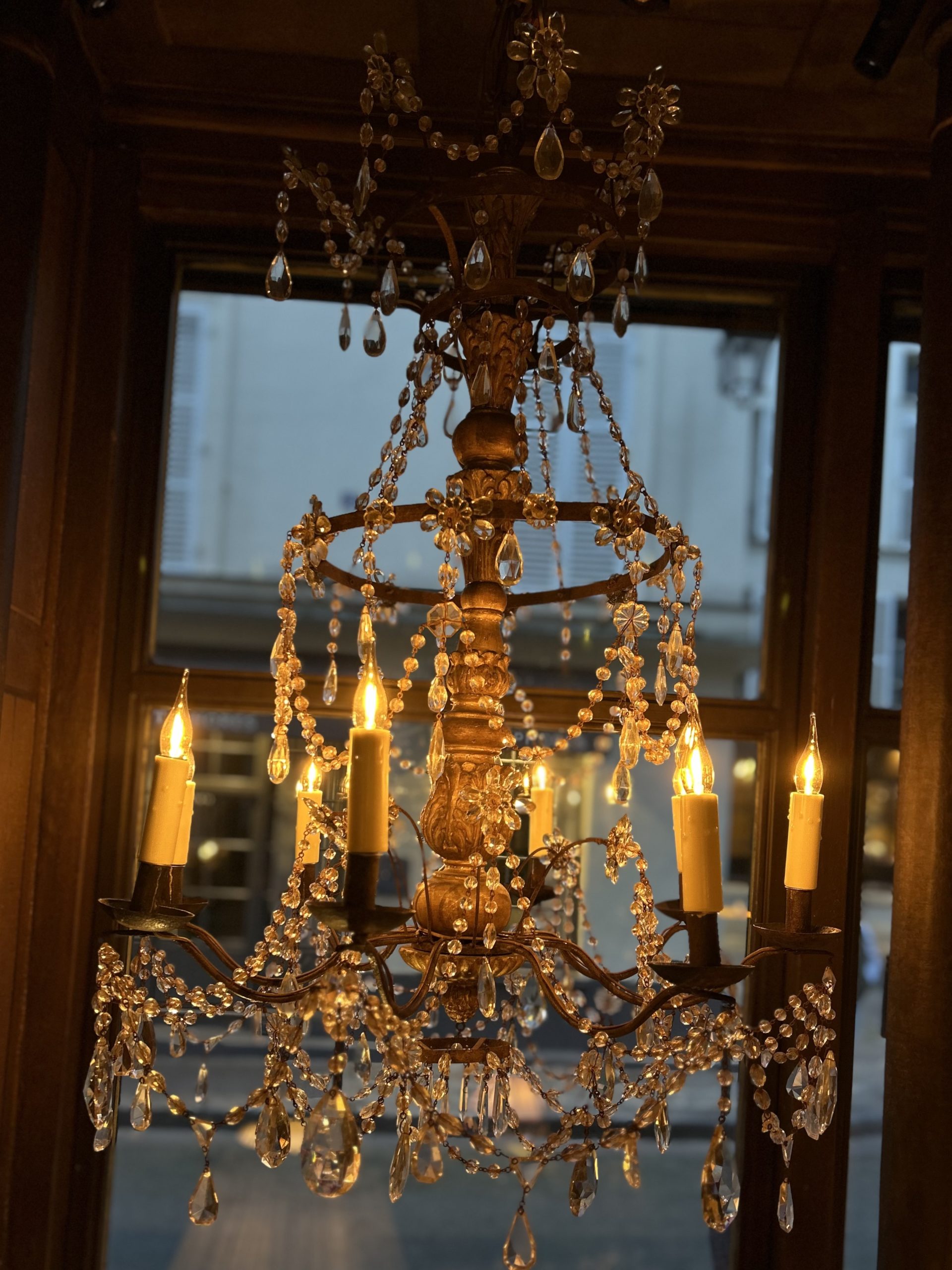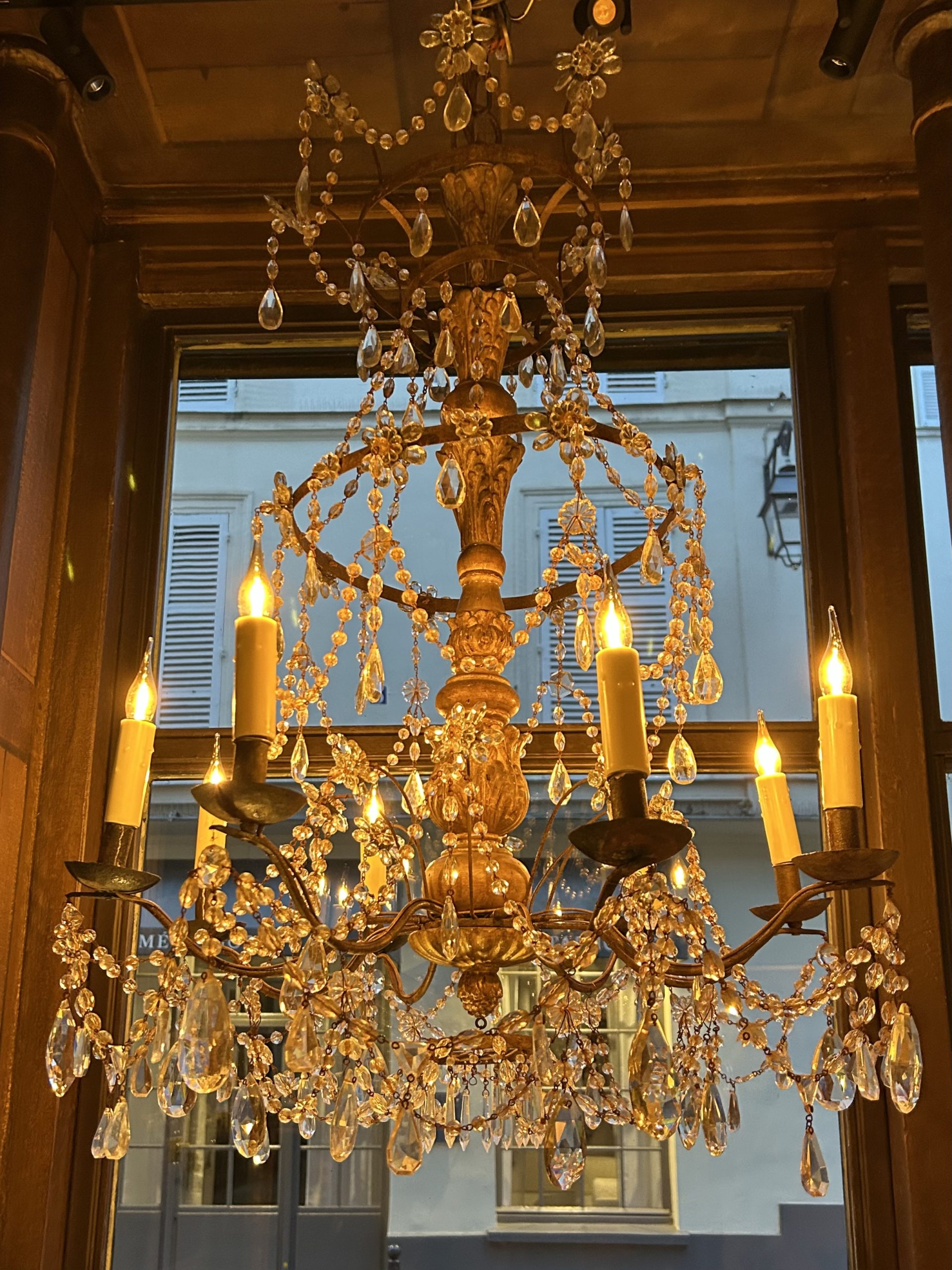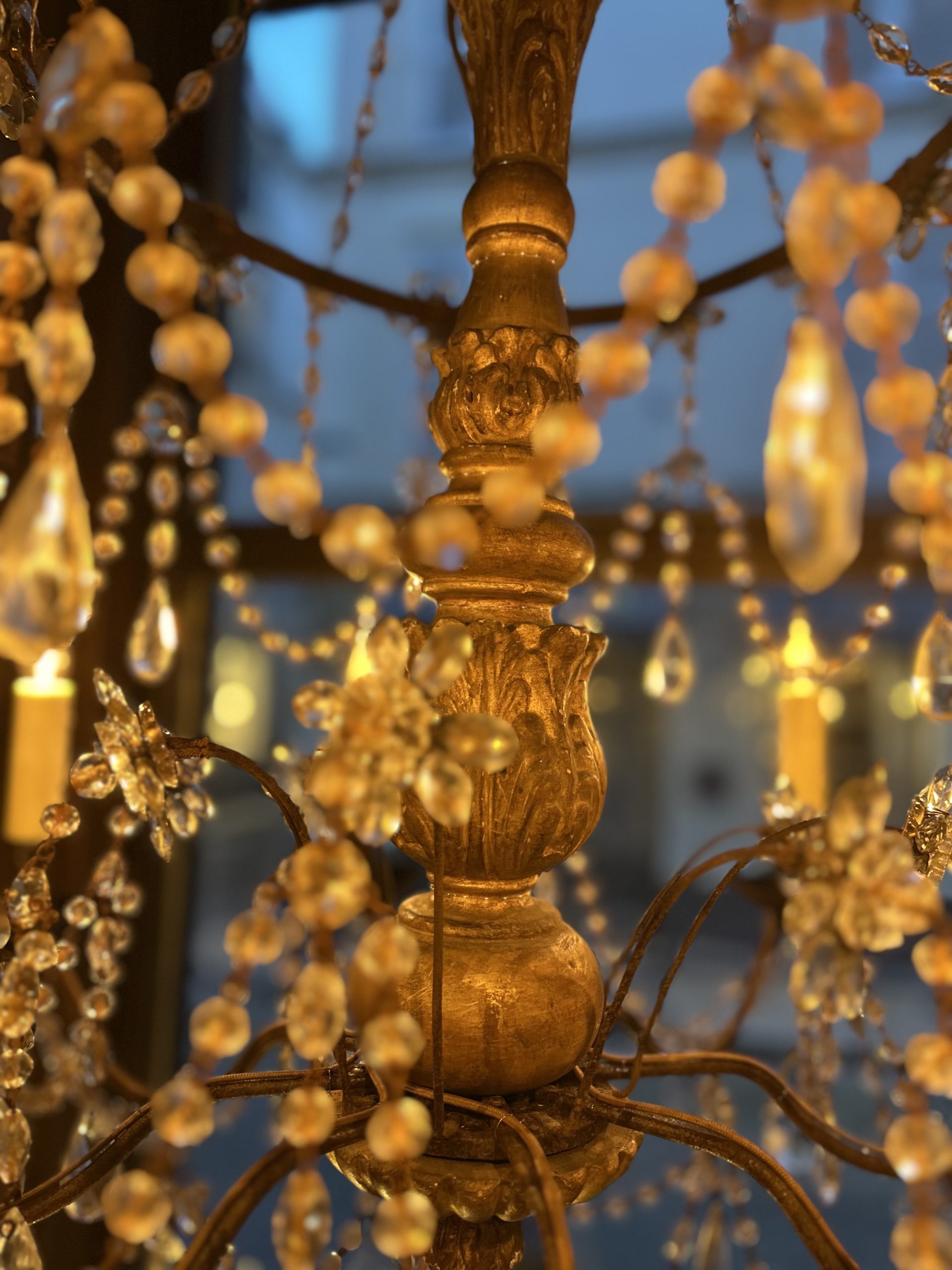 Eight-light church chandelier, central shaft in carved and gilded wood, cut glass beads.