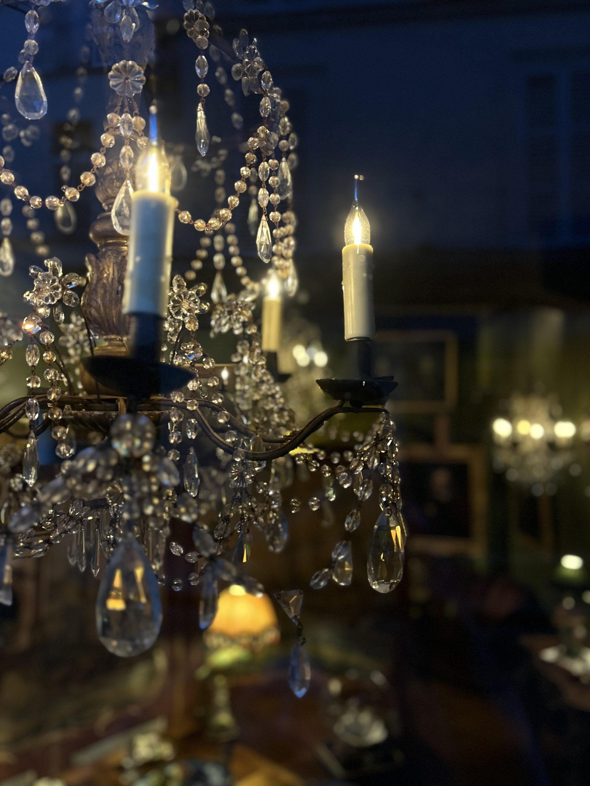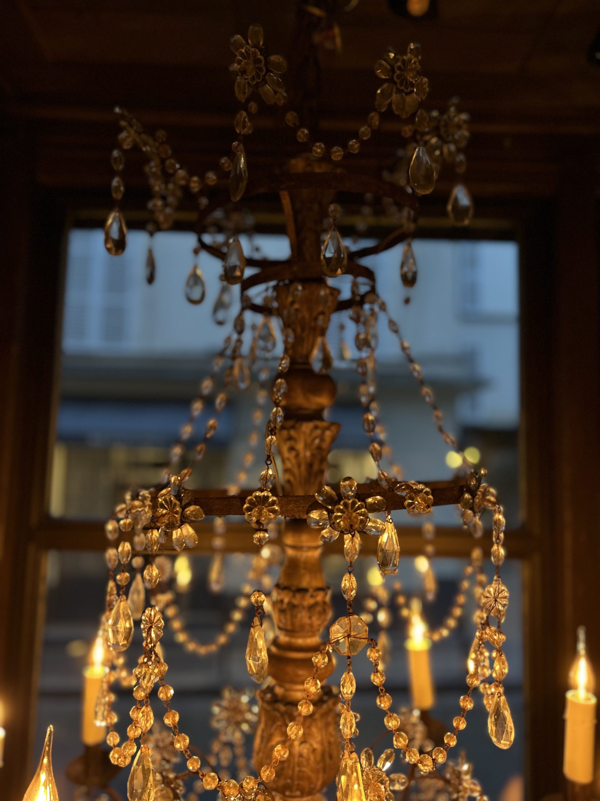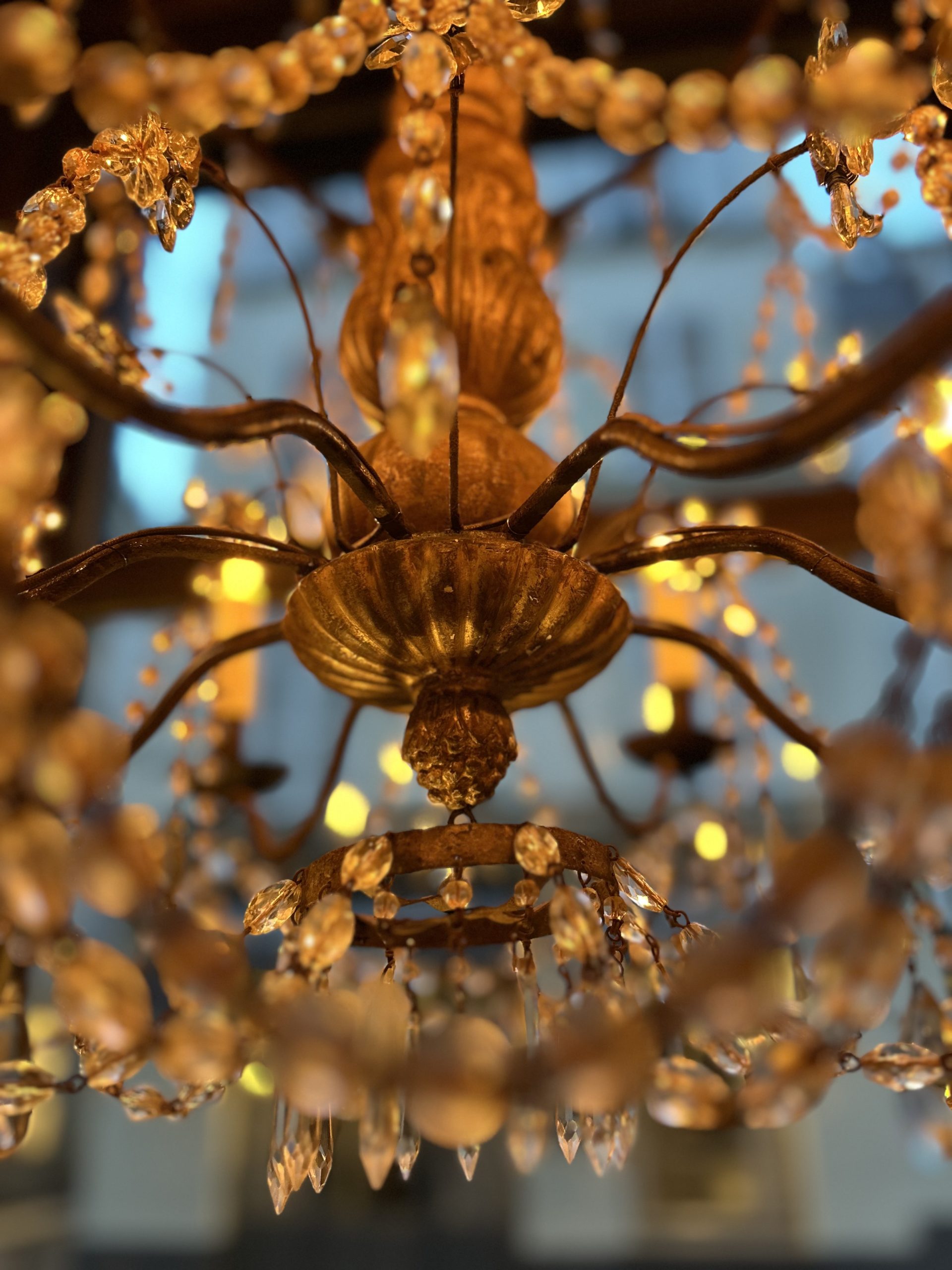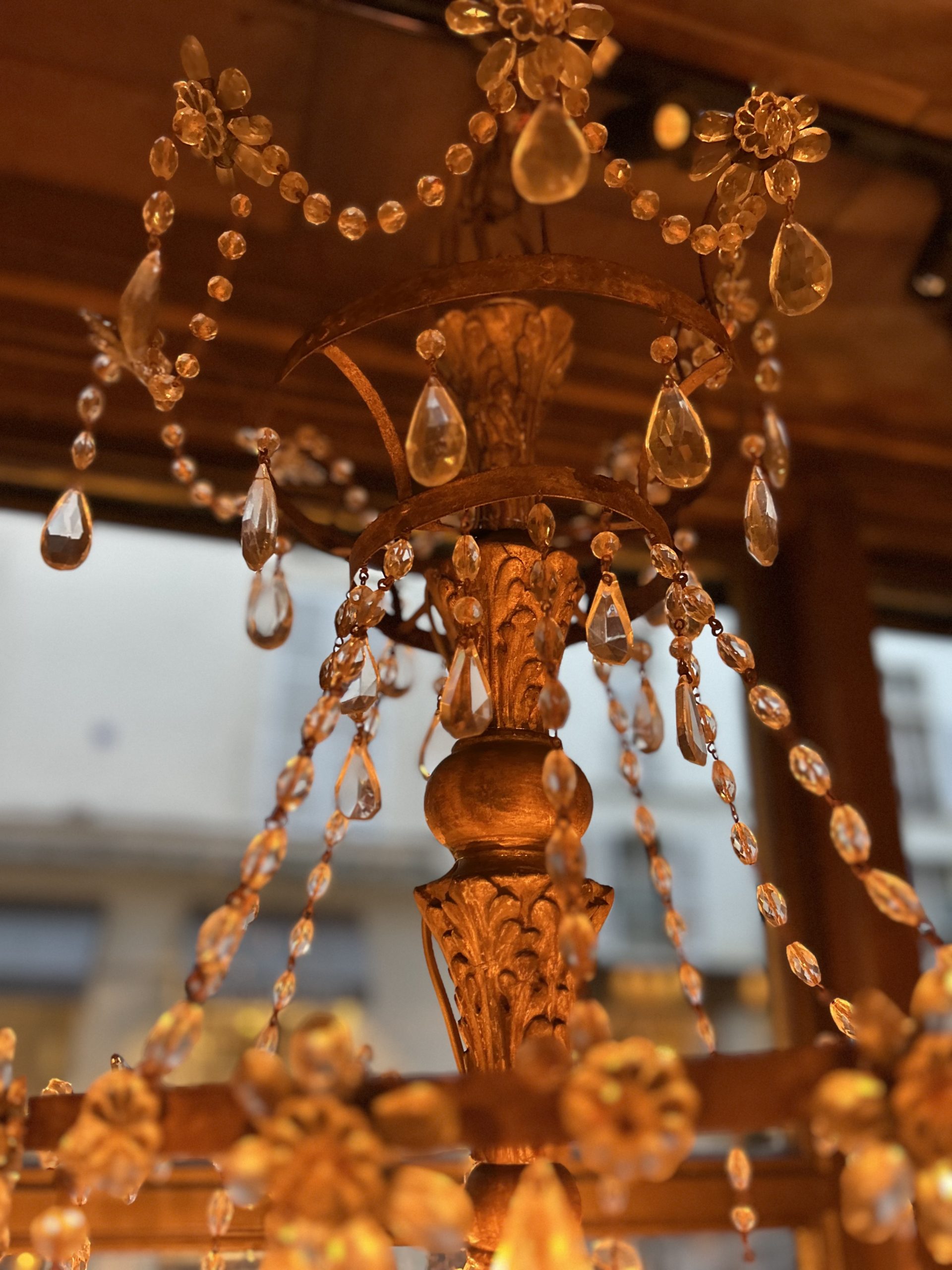 Eight-light church chandelier, central shaft in carved and gilded wood, cut glass beads.