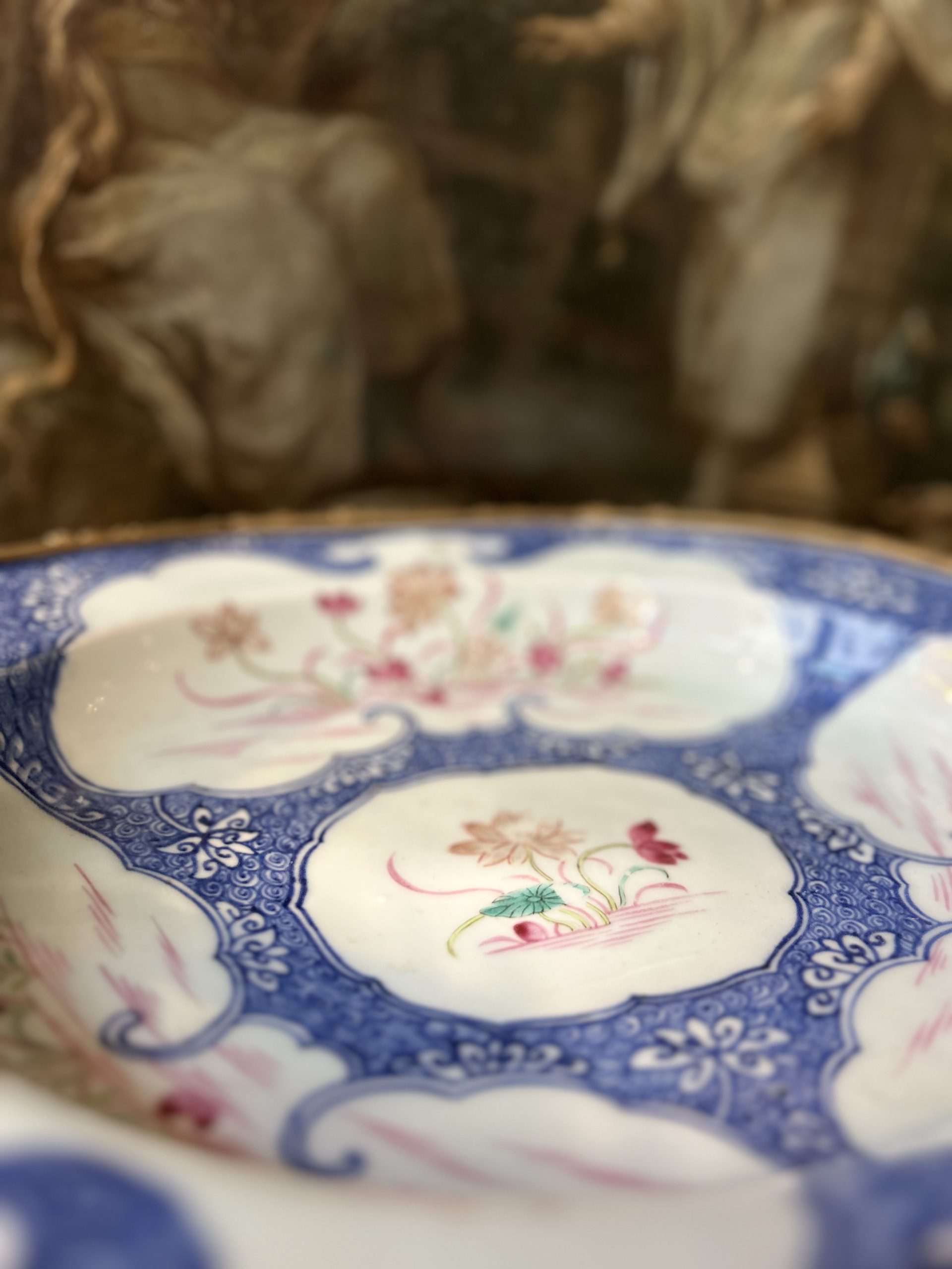 It consists of a deep Imari-type porcelain plate, in particularly bright colors, deep blue, bright white and intense red.