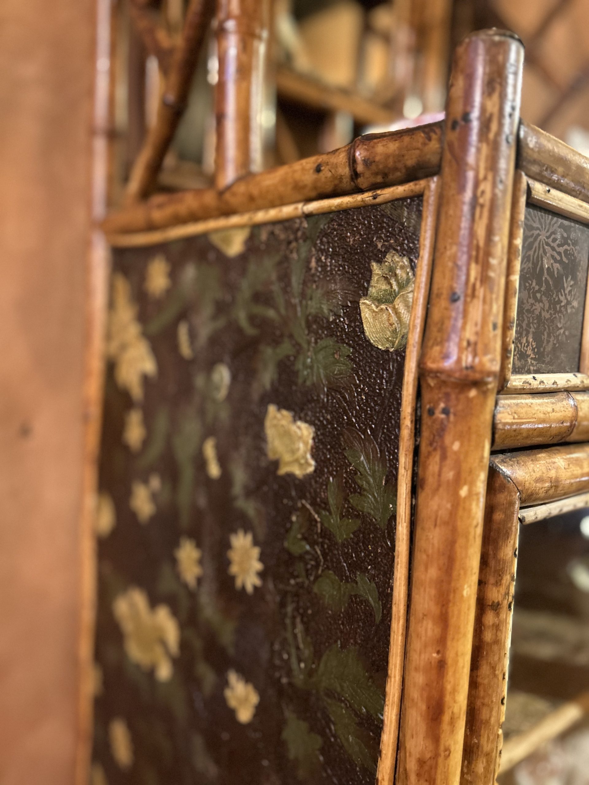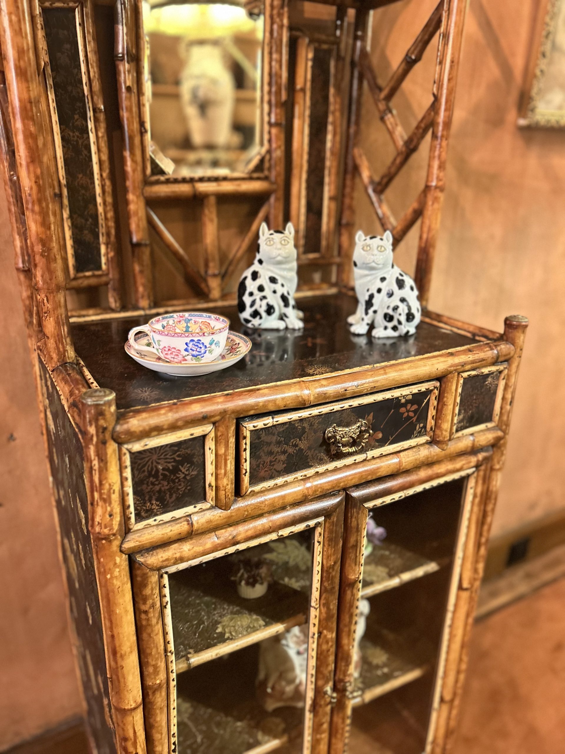 This elegant cabinet, crafted from bamboo and lacquered panels in the Japanese style, is distinguished by its upper structure incorporating a mirror. Above it sits a small drawer and two glass doors opening onto two interior shelves. The shelves and cabinet interiors are lined with embossed paper featuring a floral pattern. This paper was imported from Japan in large rolls and then cut to size.