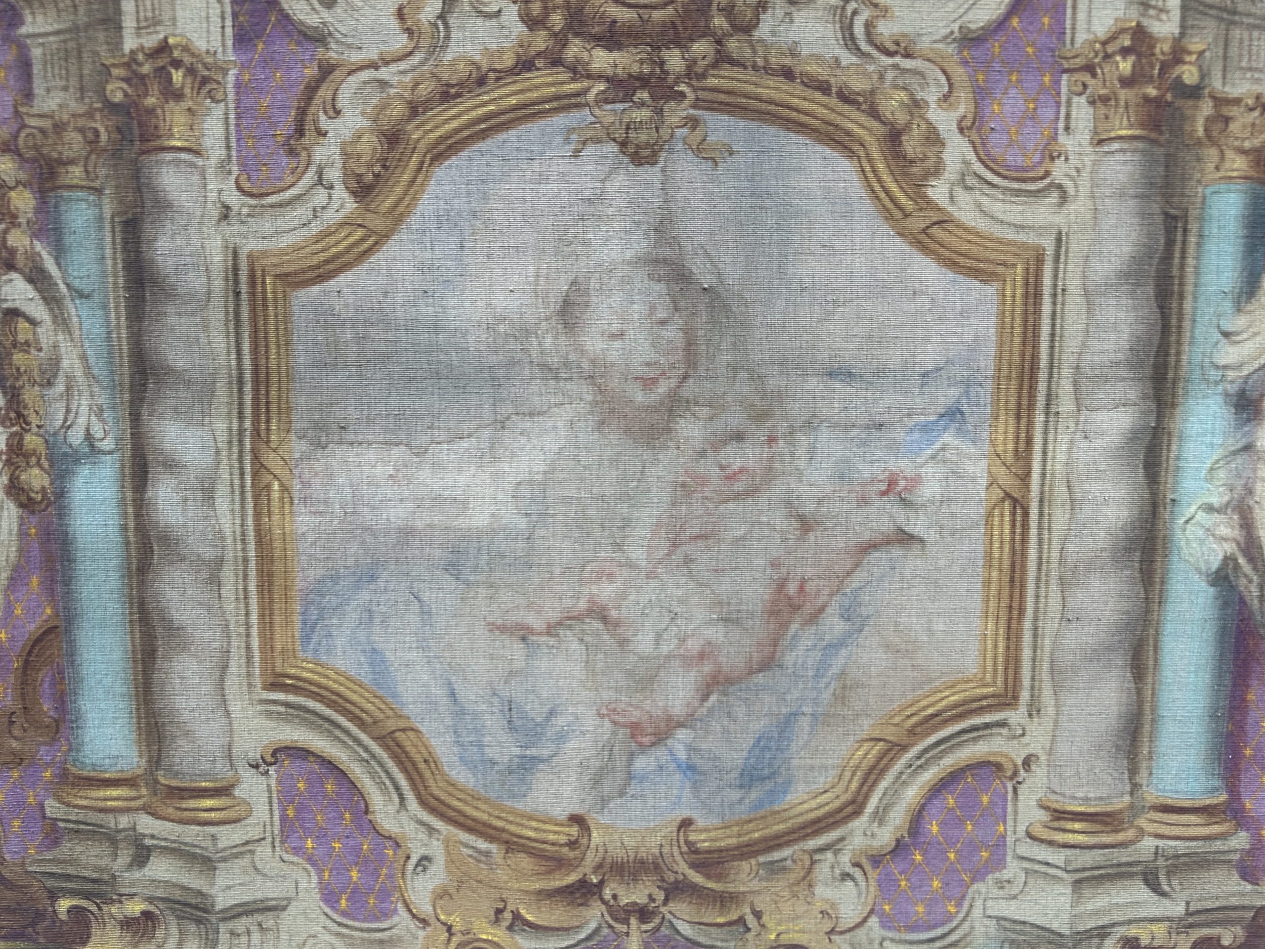 The central figure, painted with great delicacy, is framed by a rich trompe-l’œil structure combining columns, gilded sculpted elements, and a purple background with lily motifs. On either side, two large sculpted angels appear to support the whole, lending a majestic depth to the scene.
