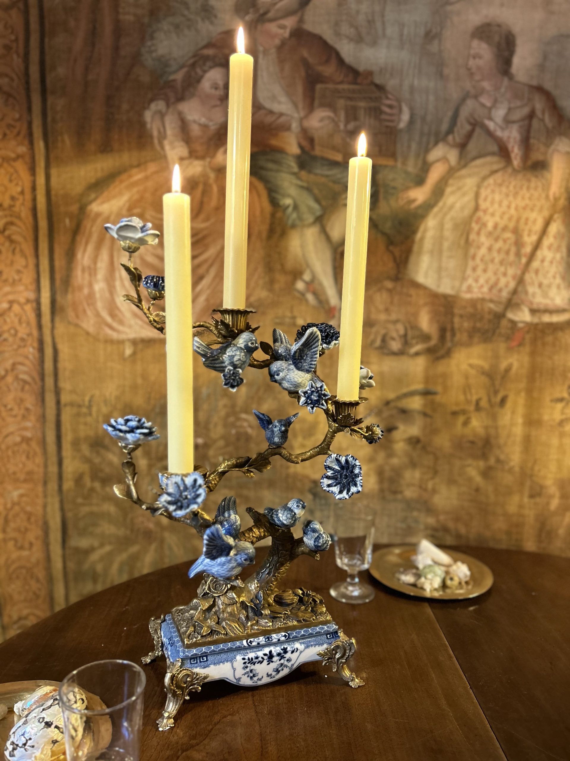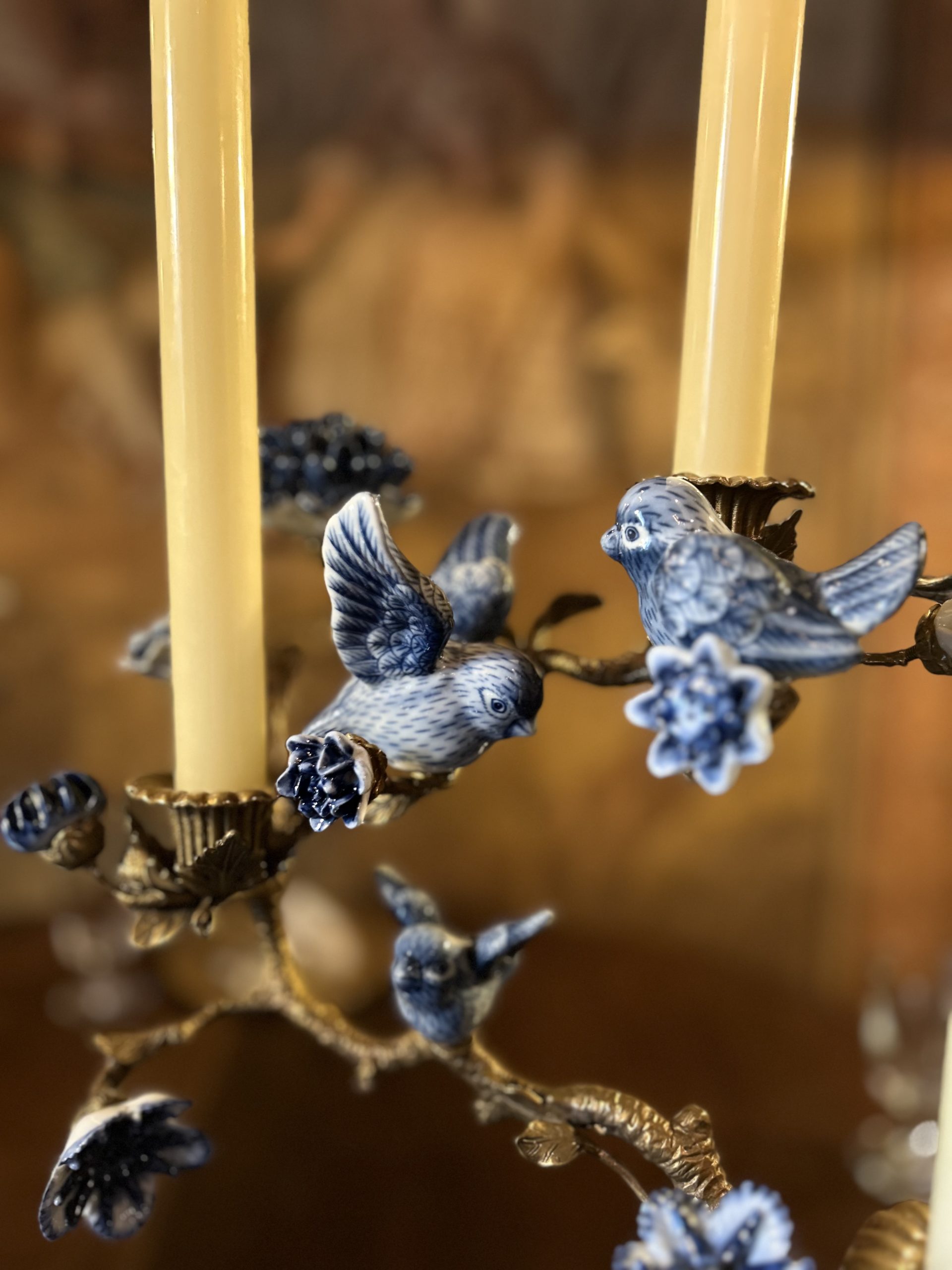 Pair of blue and white porcelain bird candelabra by Wong Lee. The candelabra depict birds and flowers perched on gilt bronze branches, forming three arms of light. Each rests on a rectangular porcelain and gilt bronze base.