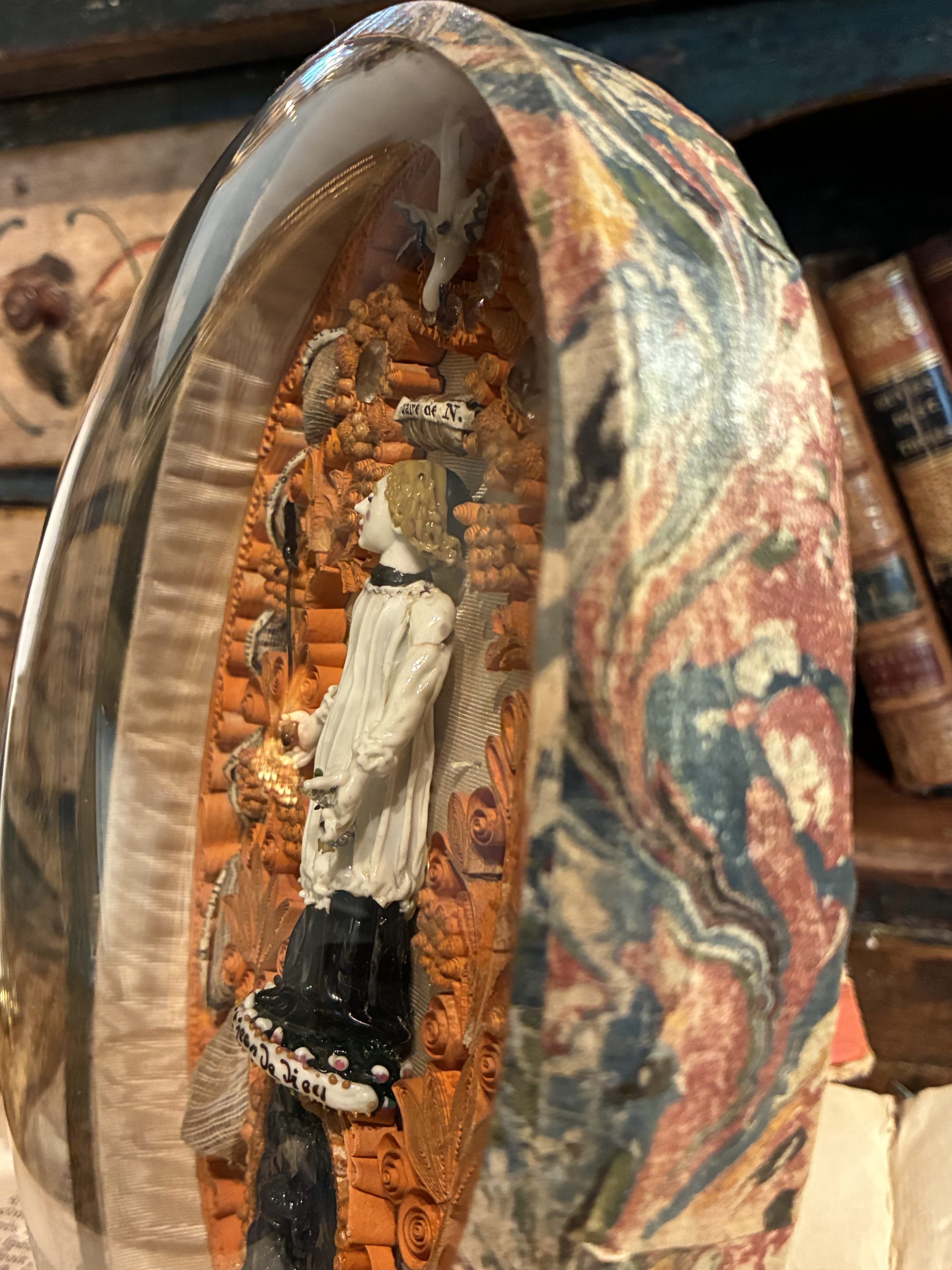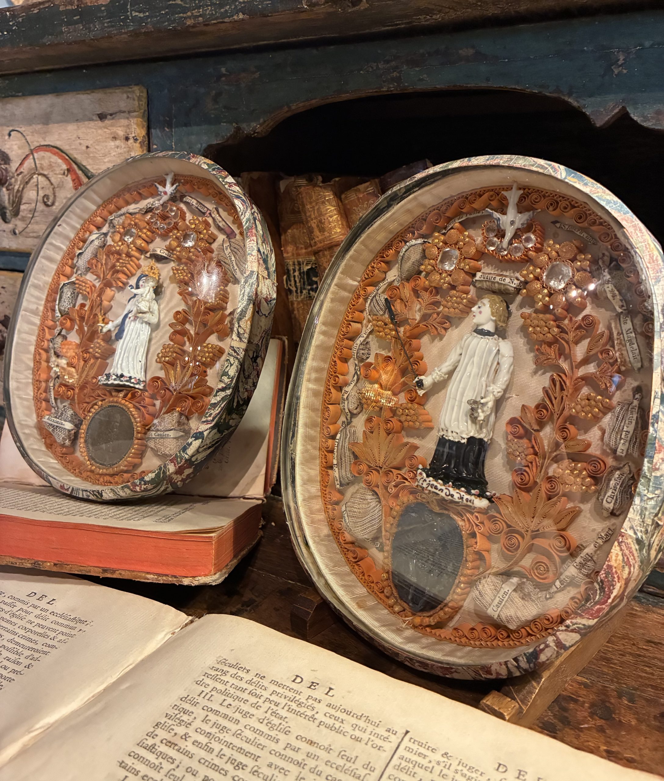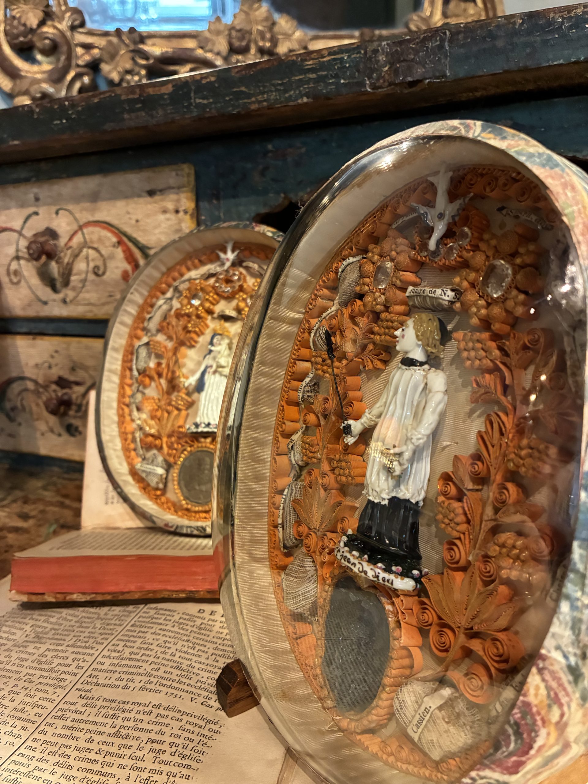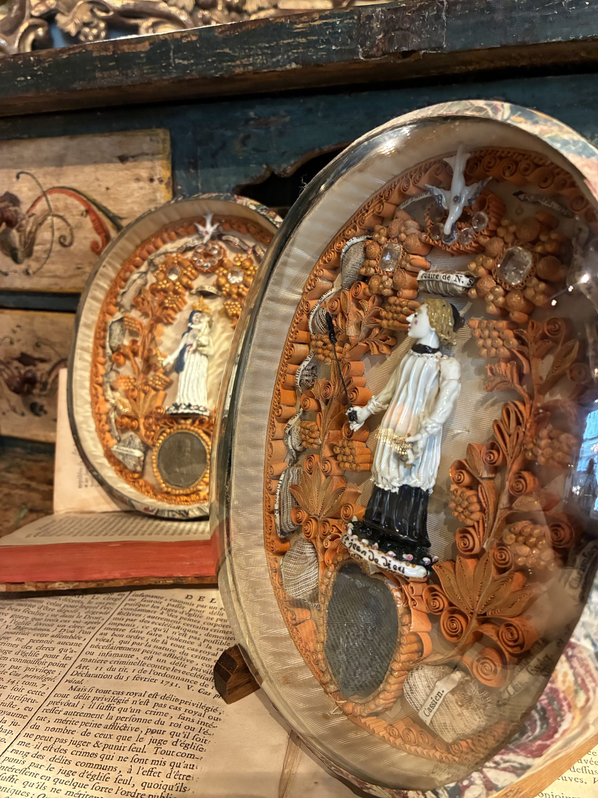 This pair of oval reliquaries constitutes an exceptional example of 18th-century sacred art, presented under antique domed glass. Each piece is centered around a spun glass figure from Nevers, representing, on one side, the Virgin and Child and, on the other, Saint John of God.