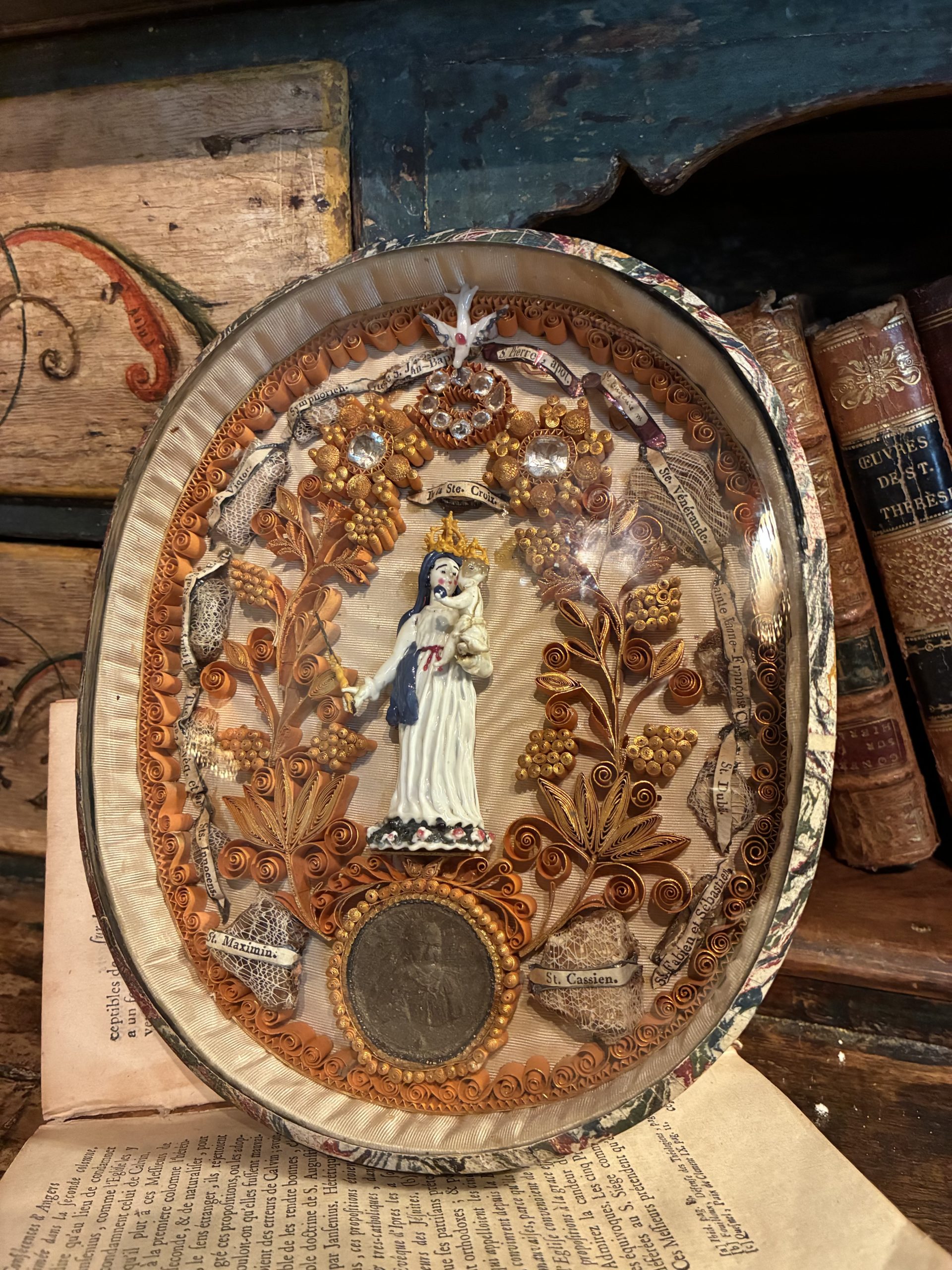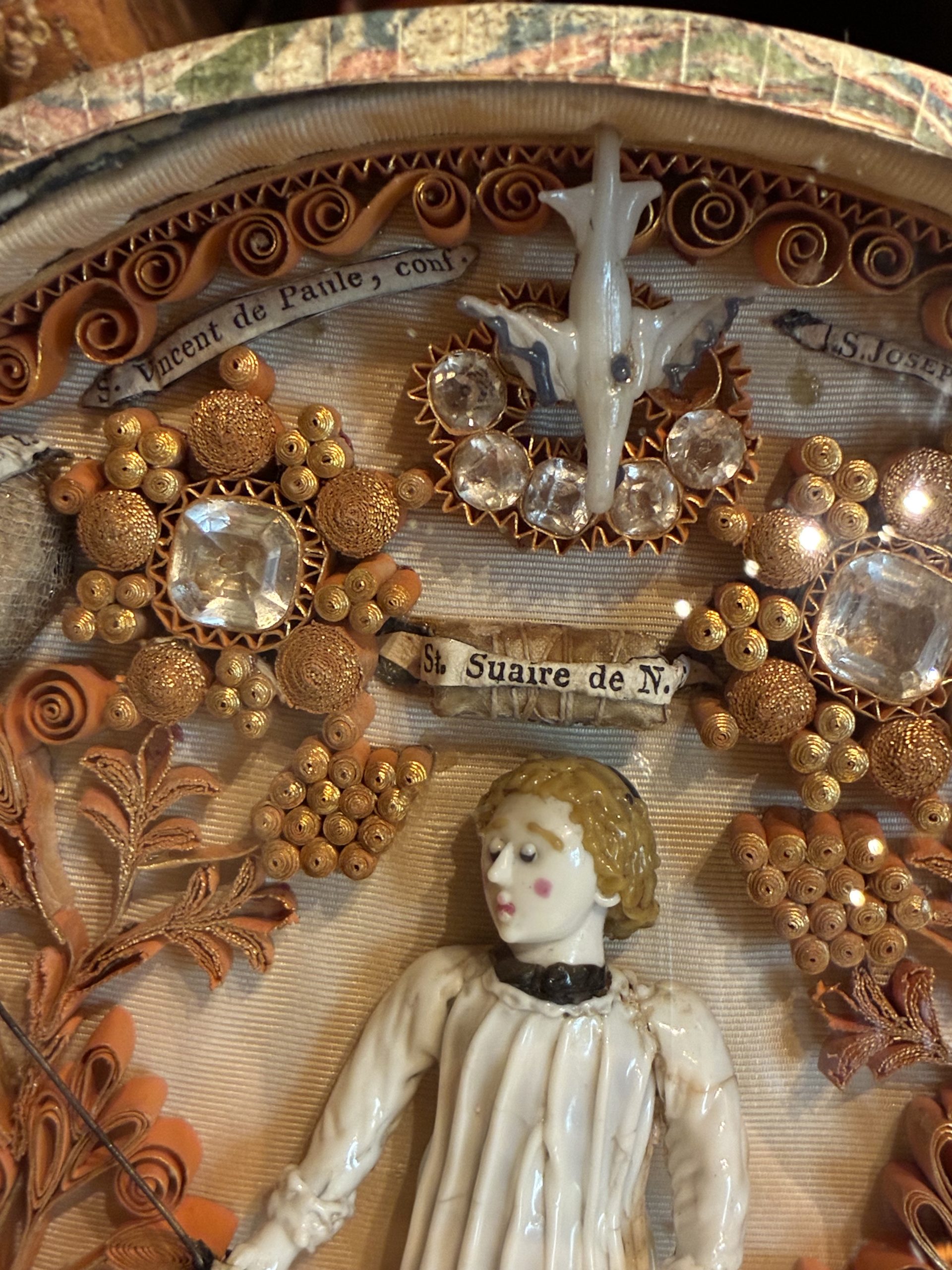 These reliquaries contain approximately thirty bone fragments identified by handwritten inscriptions. Among the saints depicted are Saint Joseph, Saint Martin, Saint Maximus, Saint Denis, Saint Vincent de Paul, Saint Peter the Apostle, Saint Victor, and Saint Cassian. These relics are carefully arranged among the paper scrolls and glass ornaments.