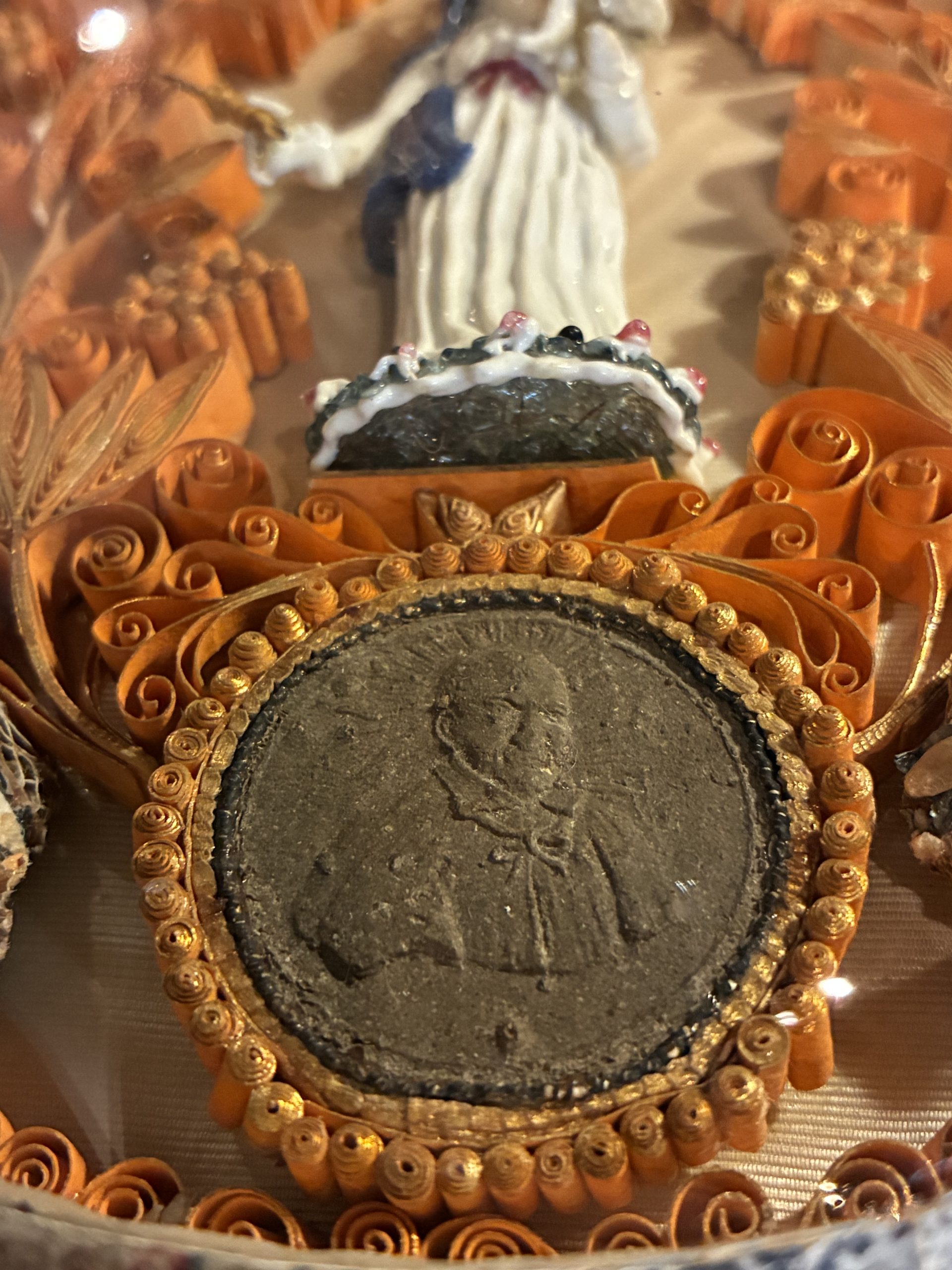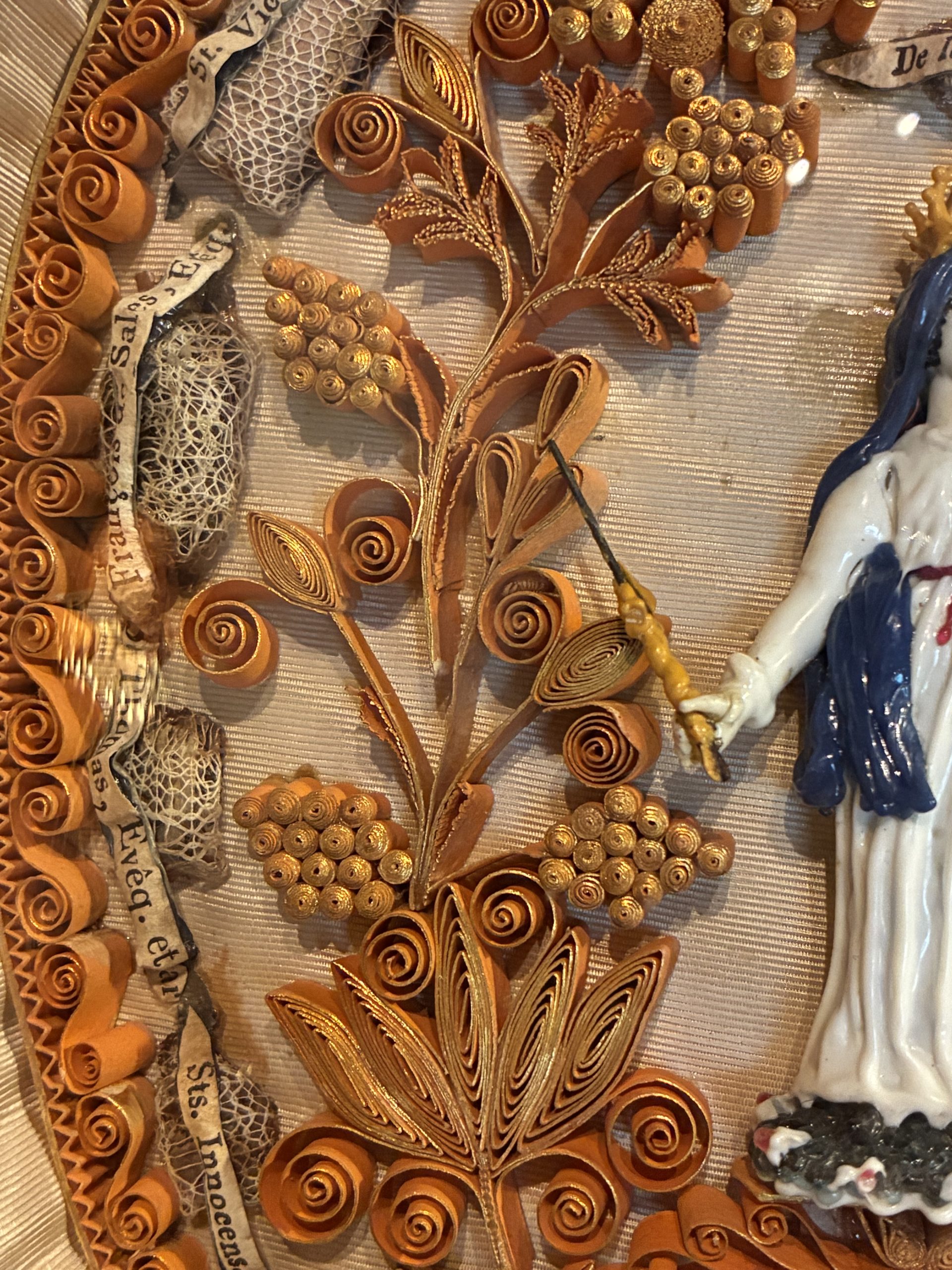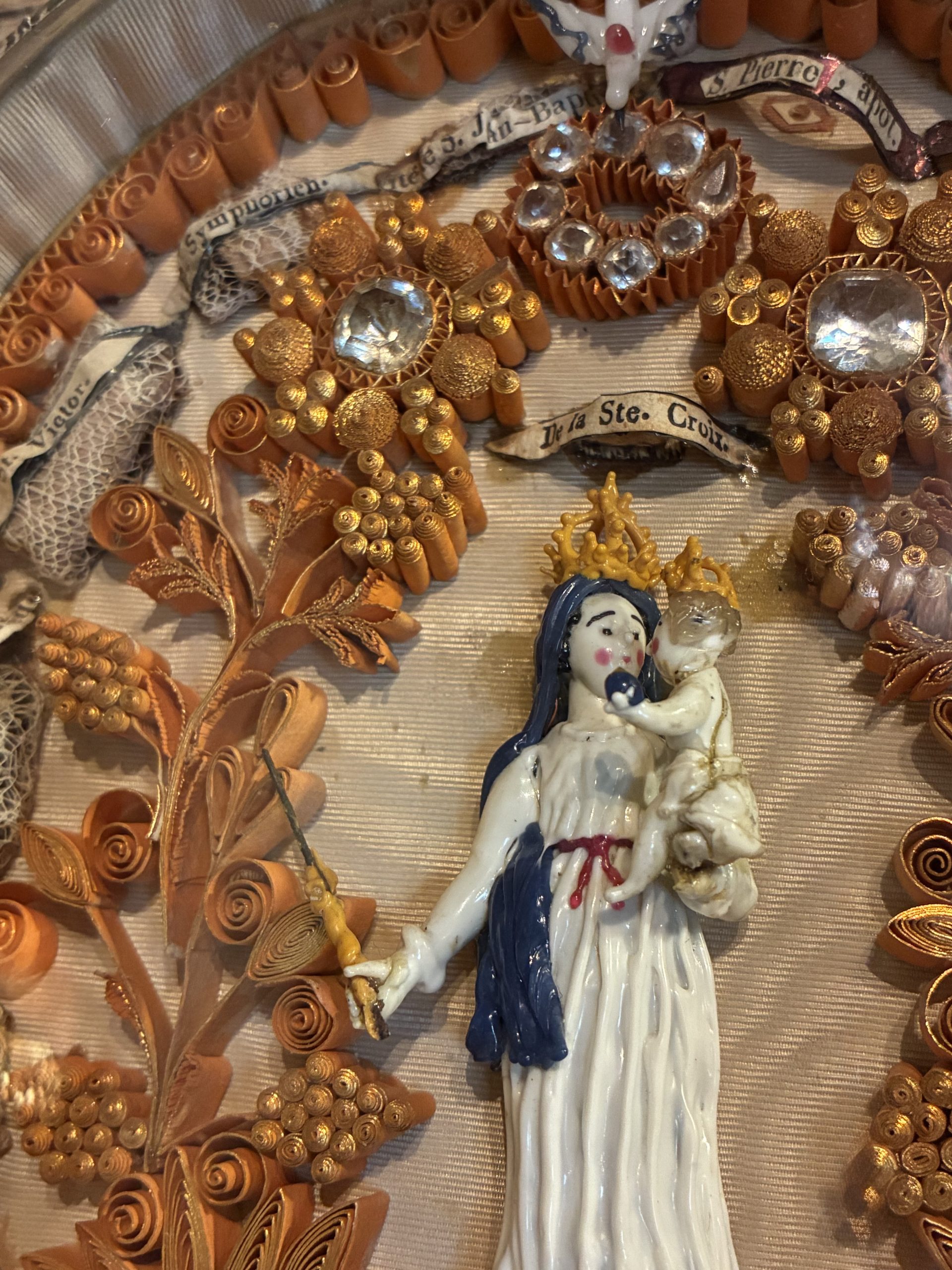 The paper filigree decoration consists of a complex arrangement of thin strips of gilded or colored paper, glued edge-to-edge to the support to form scrolls and raised plant motifs. This meticulous technique allows for the creation of paper architectures that mimic the finest goldsmithing. At the apex of these compositions, the radiant dove of the Holy Spirit can be seen above sacred scenes.