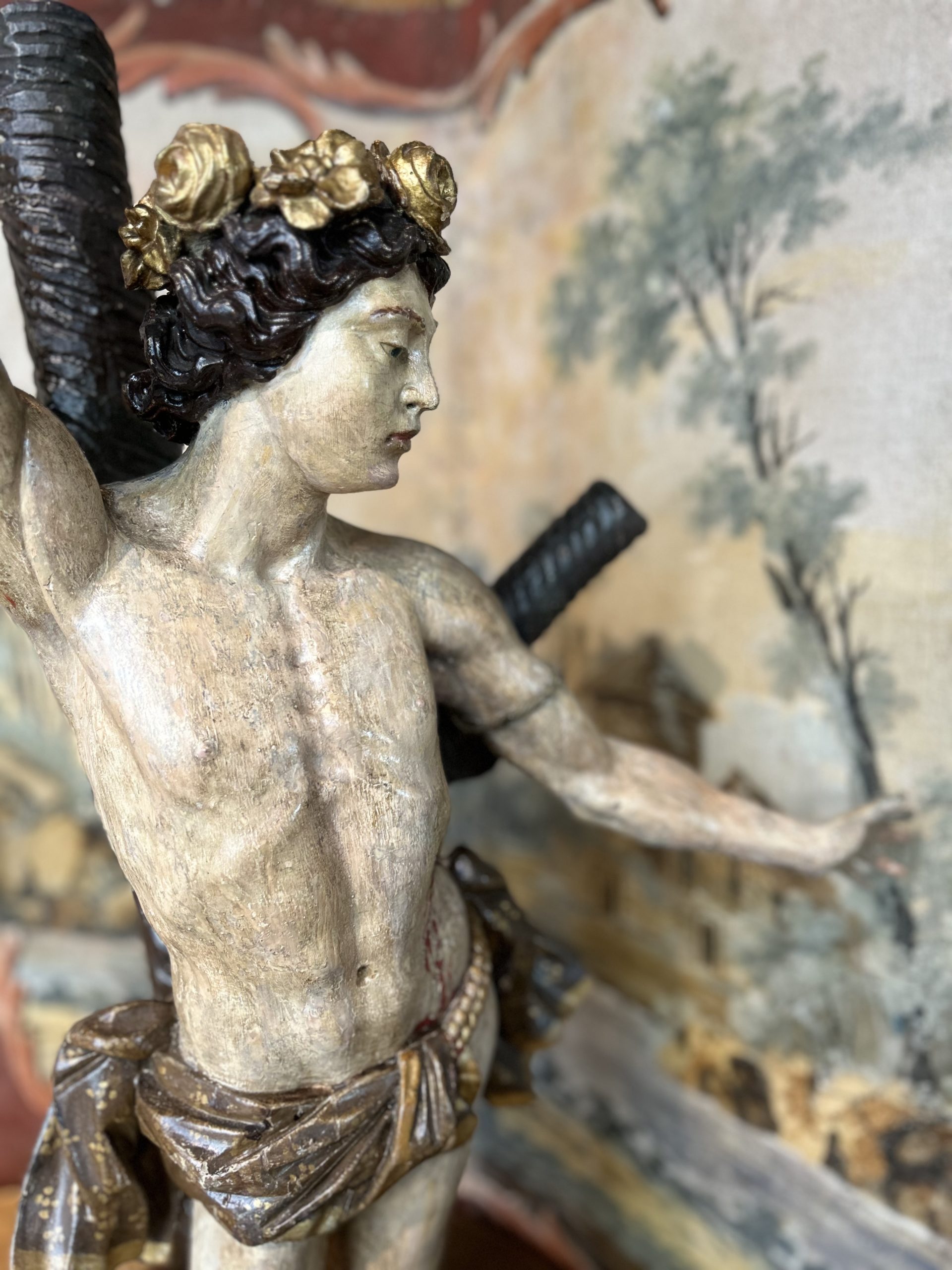 This 17th-century polychrome wood sculpture depicts Saint Sebastian with remarkable grace. His body is portrayed in an expressive, almost dancing pose, with his right arm raised and his left arm extended, creating a dynamic and light silhouette.