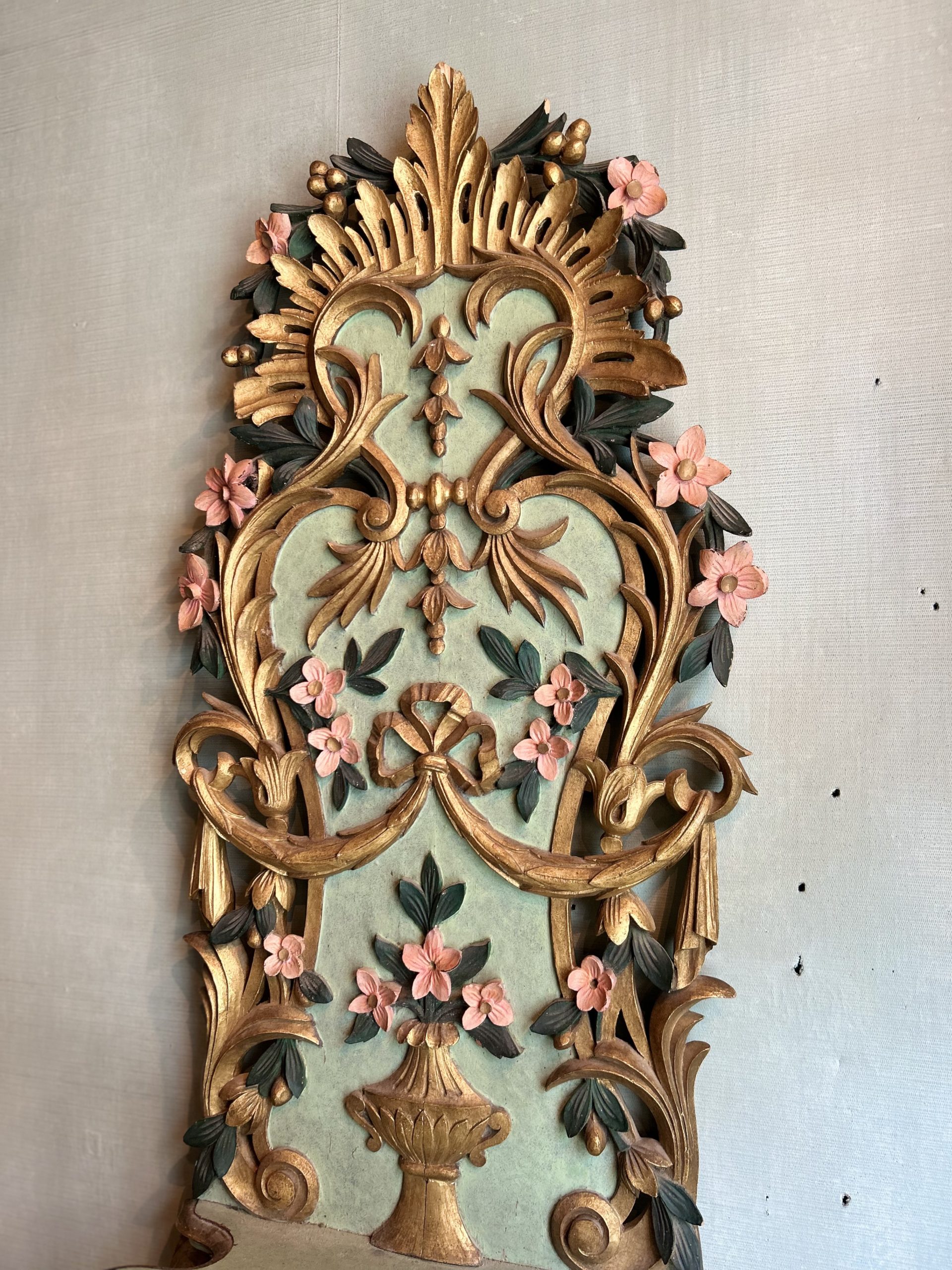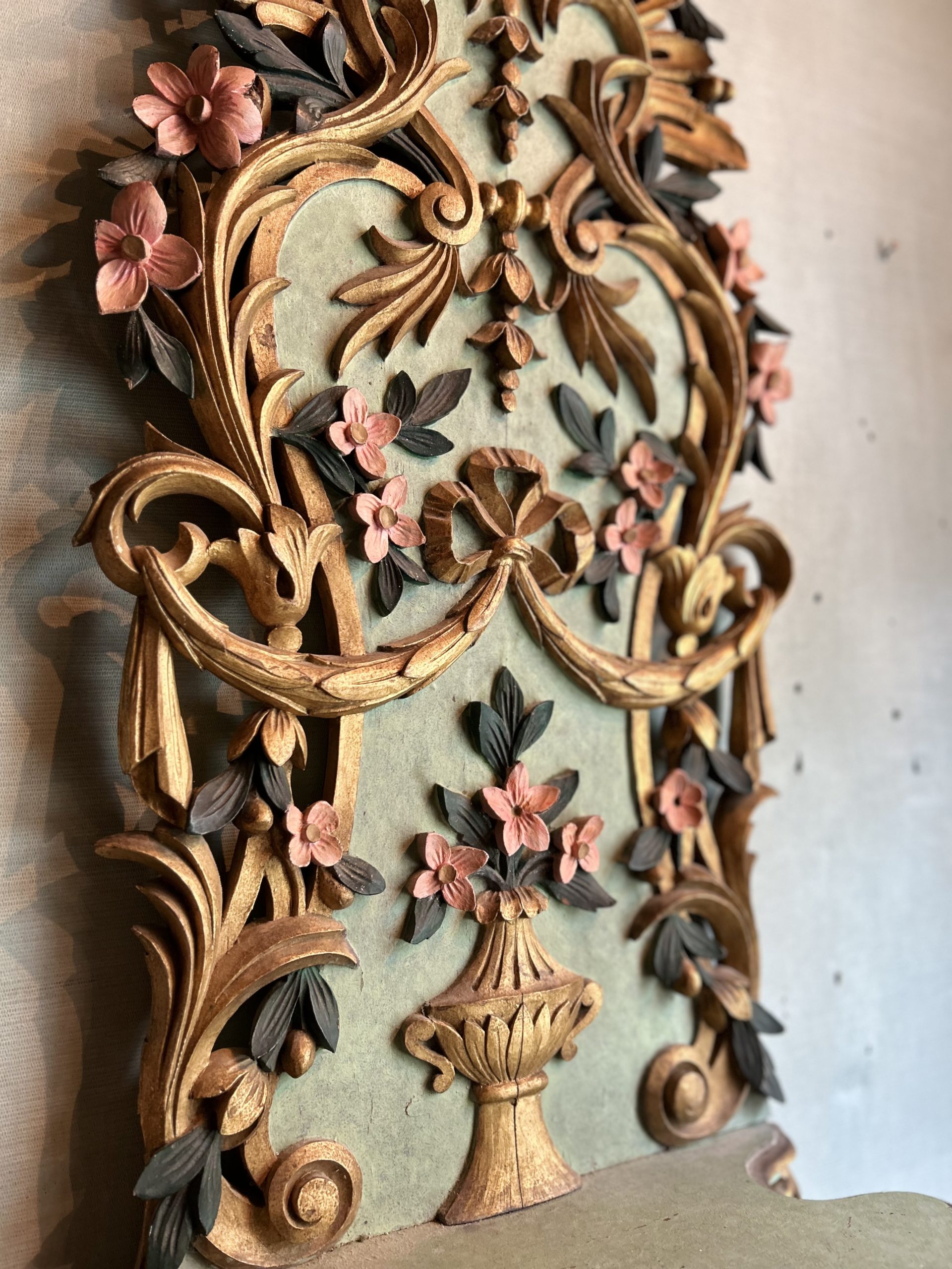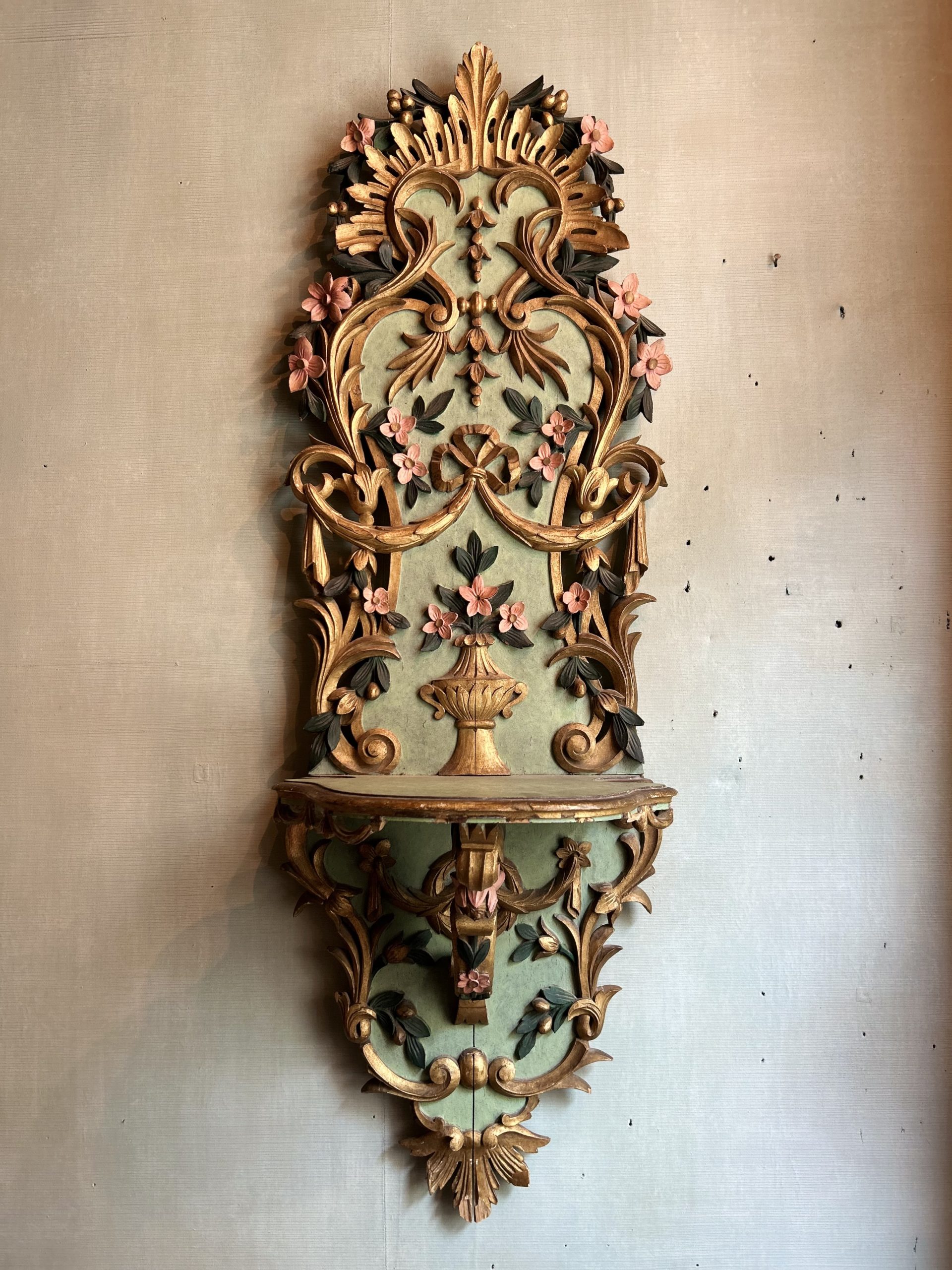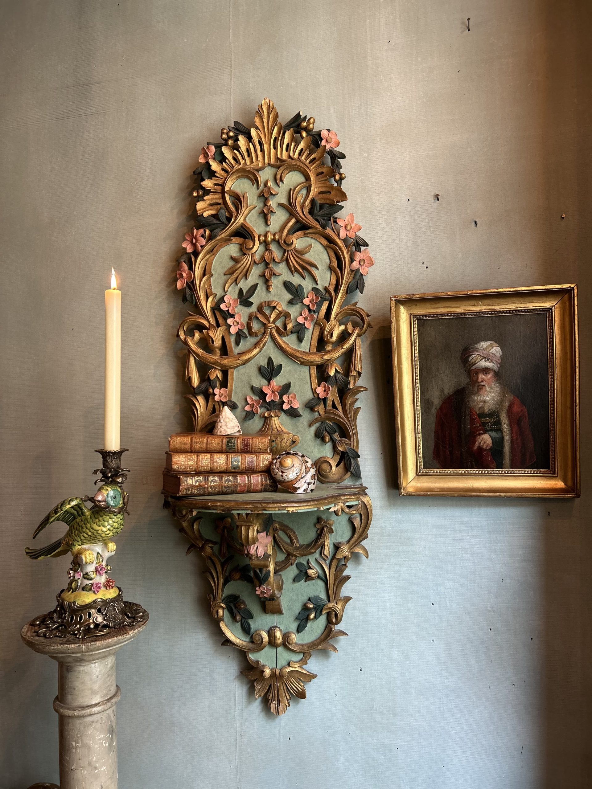 A carved, polychrome, and gilded wooden turban stand, known as a Kavukluk, designed to hold an Ottoman man’s turban. The piece features a vertical structure adorned with rocaille decoration composed of scrolls, gilded foliage, and polychrome flowers arranged around a blue-green background. A small projecting shelf, positioned in the center of the composition, allowed the turban to be placed on it when not being worn.