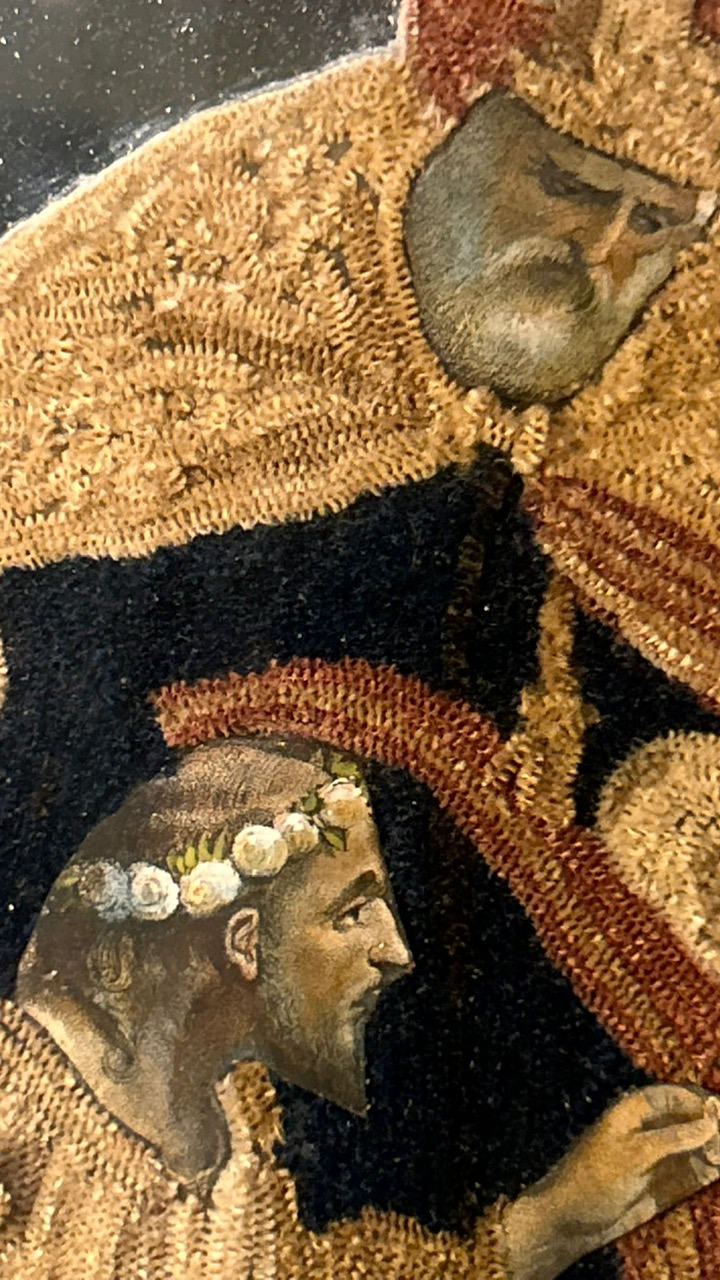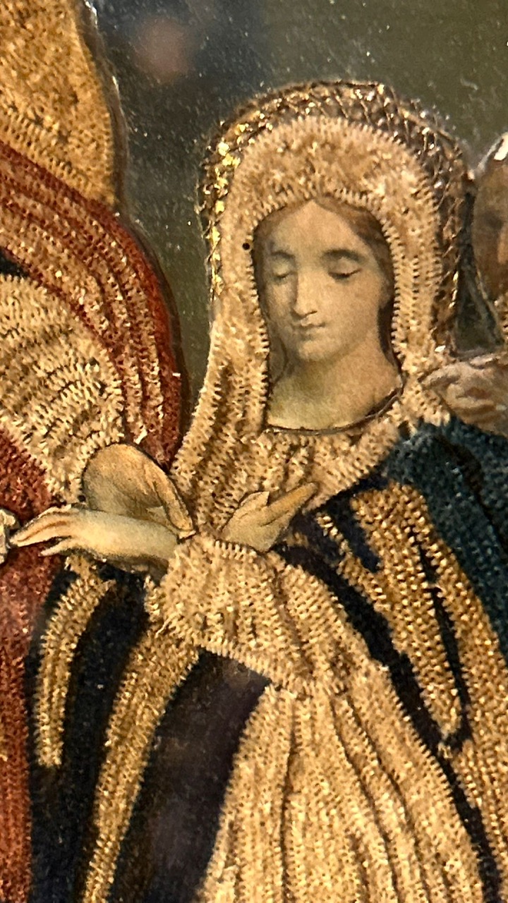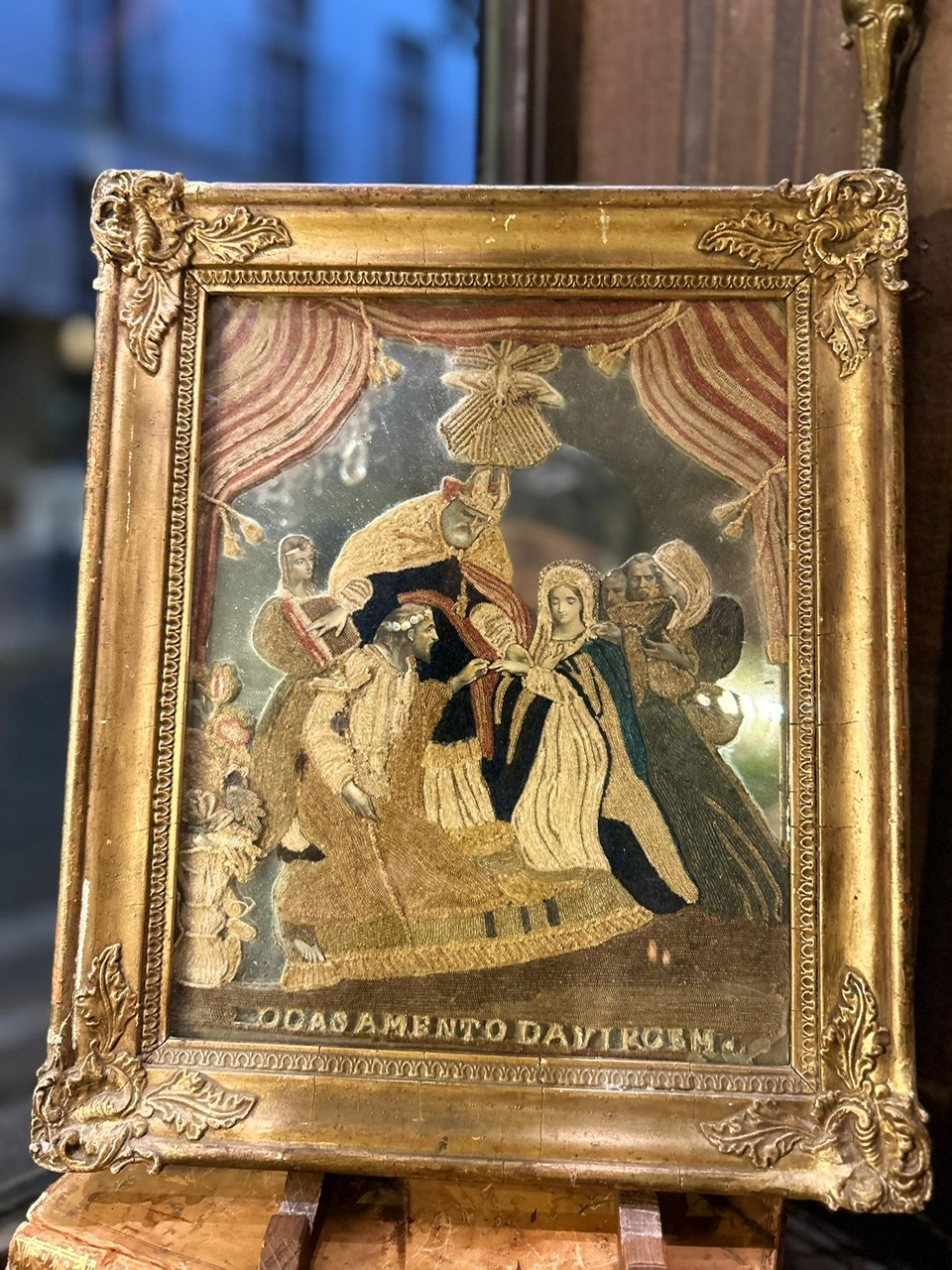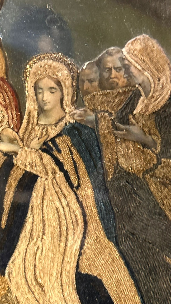 Embroidery on a mirrored background depicting the religious marriage of the Virgin Mary and Saint Joseph. The inscription “Sposamento D.M. Vergine” is an abbreviation of “Sposamento della Madonna Vergine” (Bridal Marriage of the Virgin Mary). This embroidery, in silk thread and raised gold metallic threads, is typical of devotional works created in convents.
